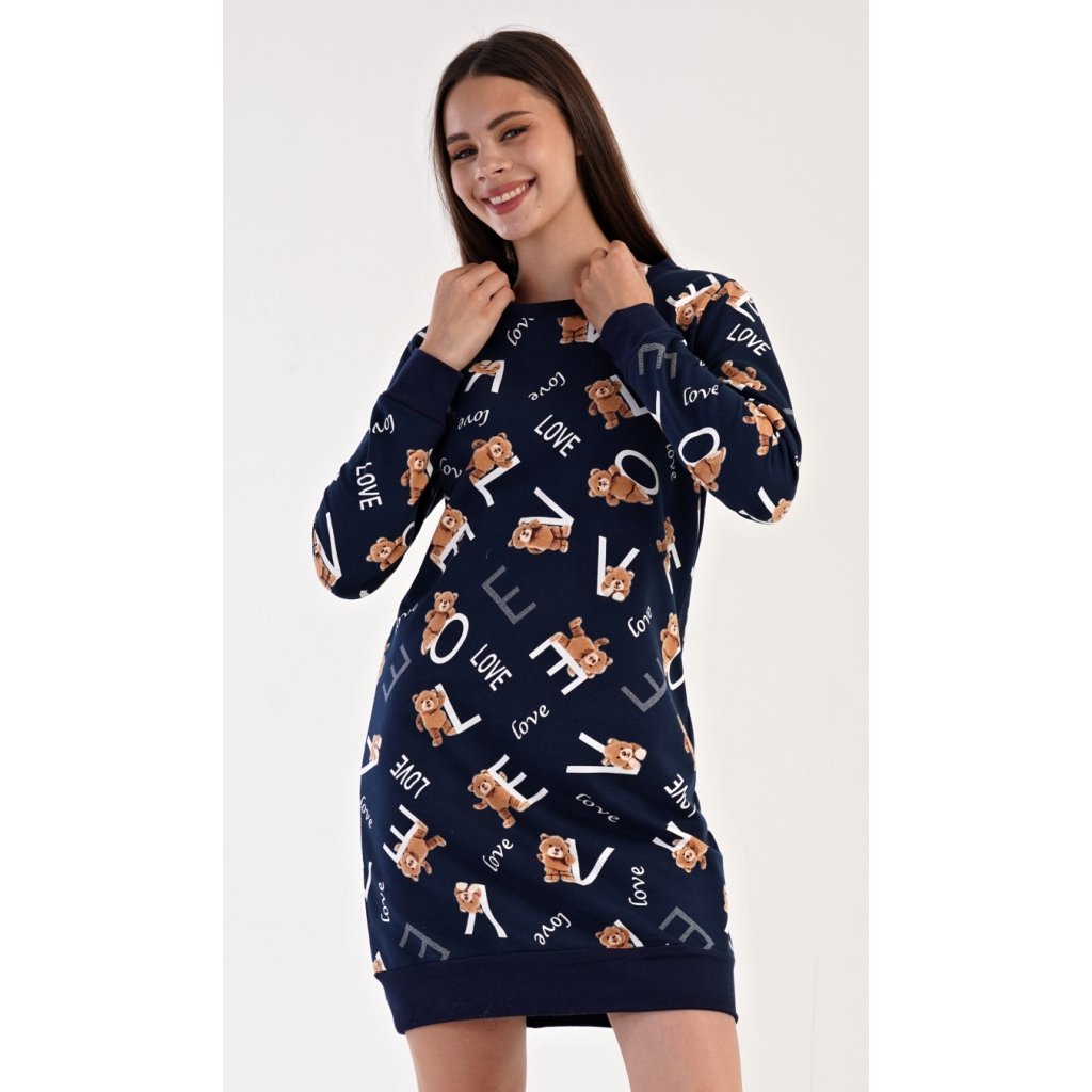 Dámská bavlněná noční košile s dlouhým rukávem Méďa. Silnější oteplený materiál je potištěný obrázky pyšových medvídků a nápisy LOVE. Rukávy a spodní lem jsou zakončeny pantem. Košile je vhodná i na denní nošení jako domácí šaty. Doplněnou o legíny ji oceníte v chladnějších dnech.
