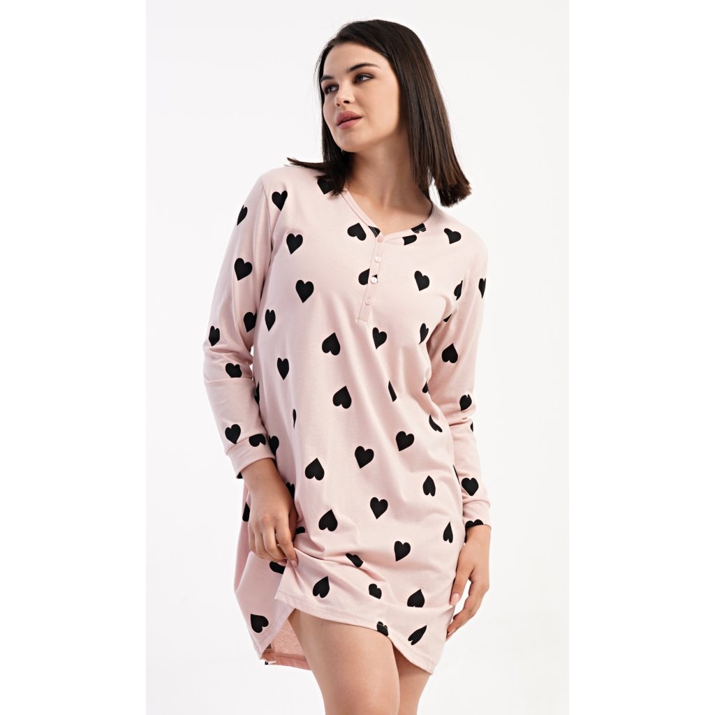 Dámská bavlněná noční košile s dlouhým rukávem Srdce. Noční košile s kulatým výstřihem a légou na knoflíčky má příjemnou délku nad kolena. Látka košile je potištěna srdíčky, dlouhý tukáv je zakončen manžetou. Použitý materiál s podílem bavlny 100% je příjemný a poddajný na dotek.