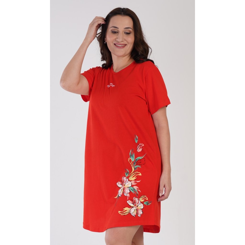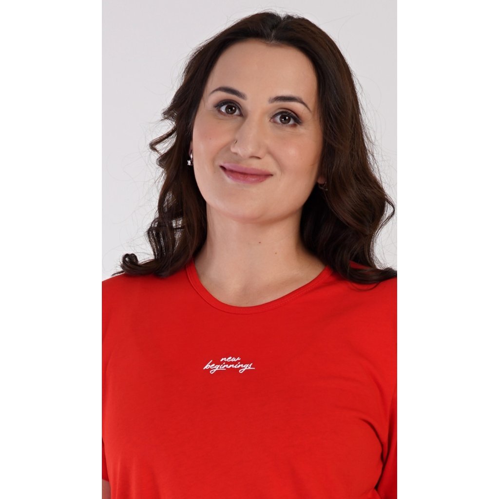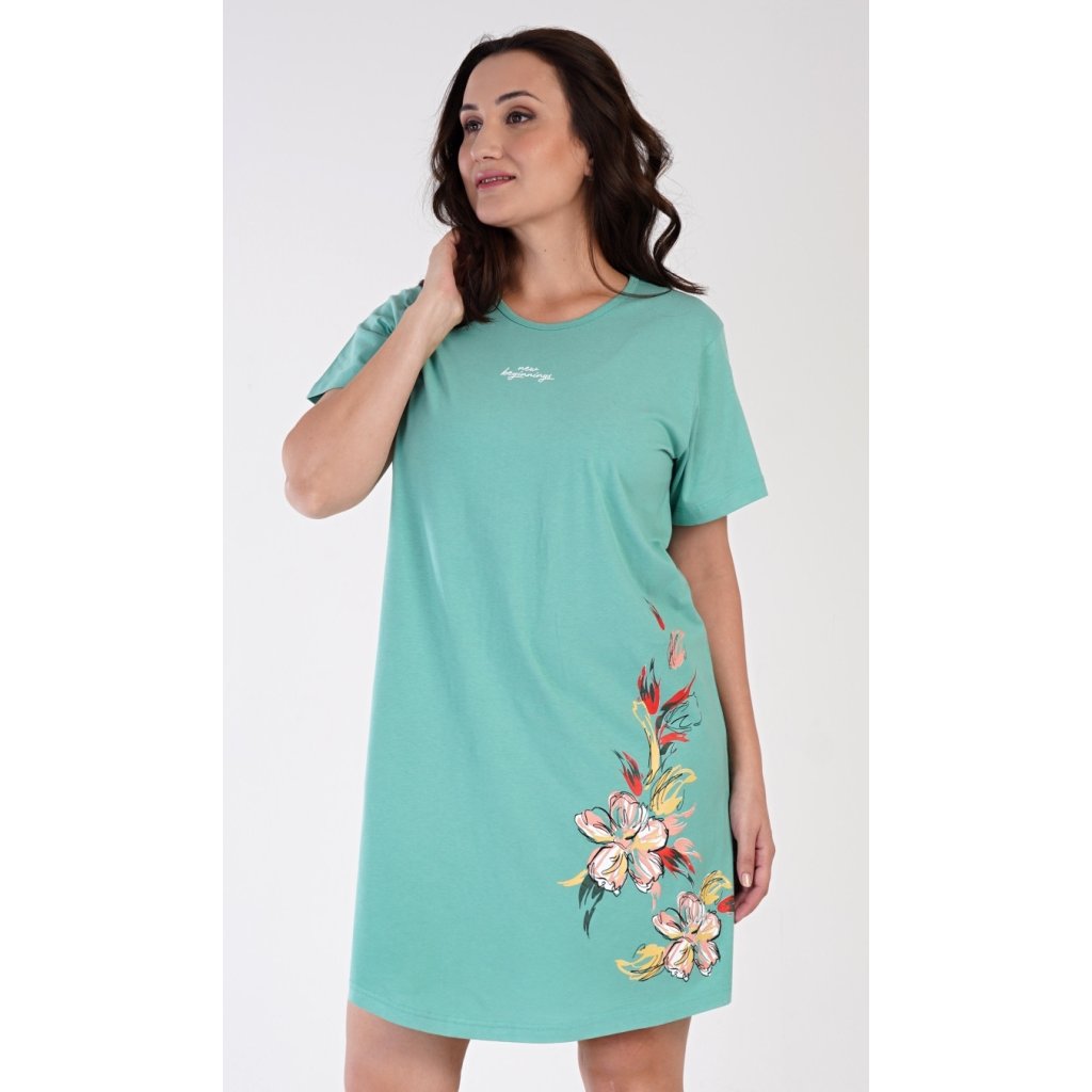 Dámská bavlněná noční košile s krátkým rukávem Alena. Noční košile s kulatým výstřihem má na hrudi má drobný nápis 'New beginnings' a ve spodní části potisk květů. Použitý materiál s obsahem bavlny 100% je příjemný a poddajný na dotek.