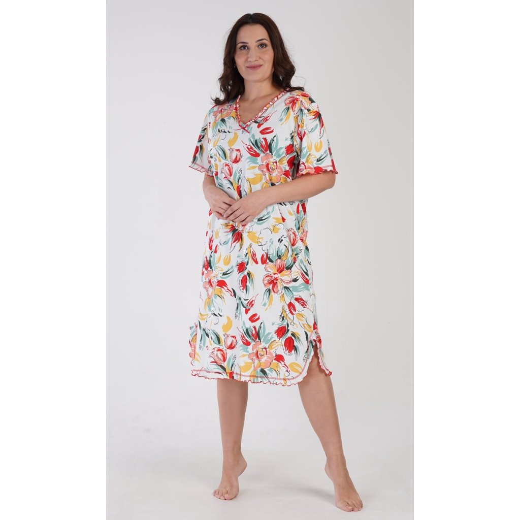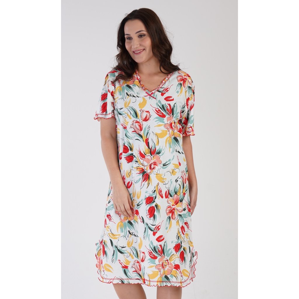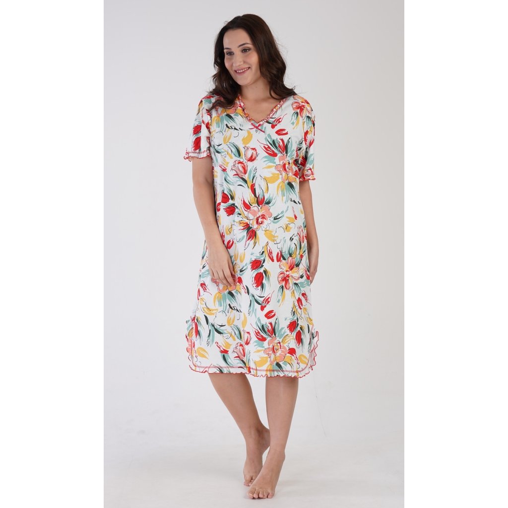 Dámská bavlněná noční košile s krátkým rukávem Alex. Noční košile pro všechny milovníky retra a starých časů s příjemnou délkou pod kolena má ozdobné žlábkování kolem výstřihu, rukávů a spodního lemu. Na látce košile jsou natištěny florální motivy. Použitý bavlněný materiál je příjemný a poddajný na dotek.