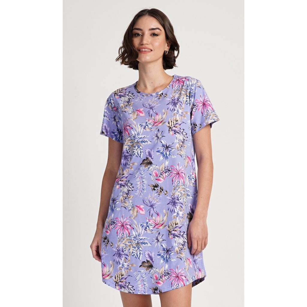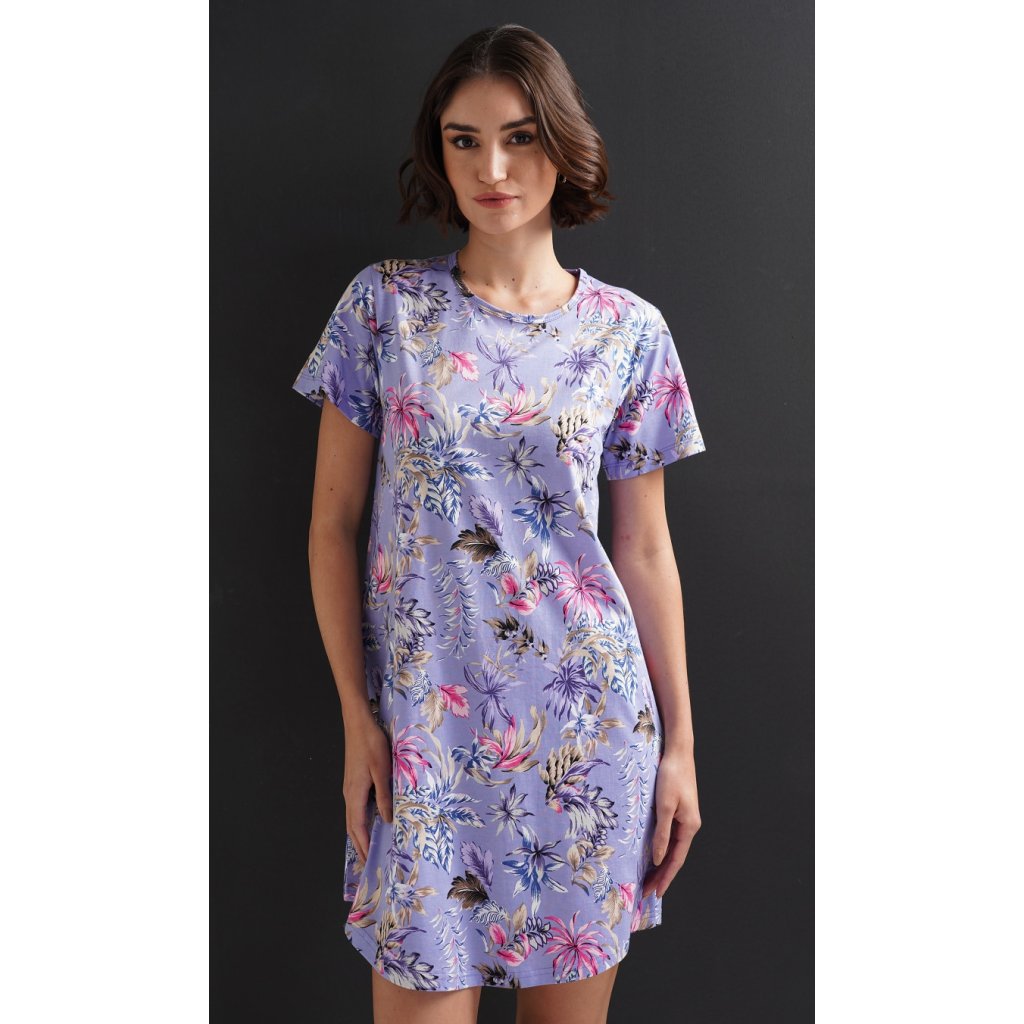 Dámská bavlněná noční košile s krátkým rukávem Alžběta. Dámská noční košile s kulatým výstřihem má příjemnou délkou nad kolena. Košile s krátkým rukávem je potištěna exotickými květy. Použitý bavlněný materiál je příjemný a poddajný na dotek.