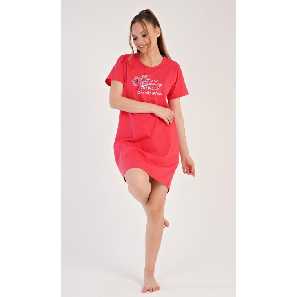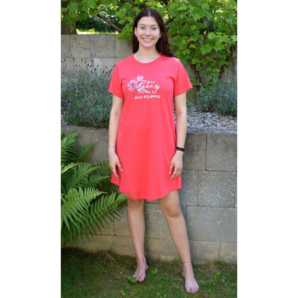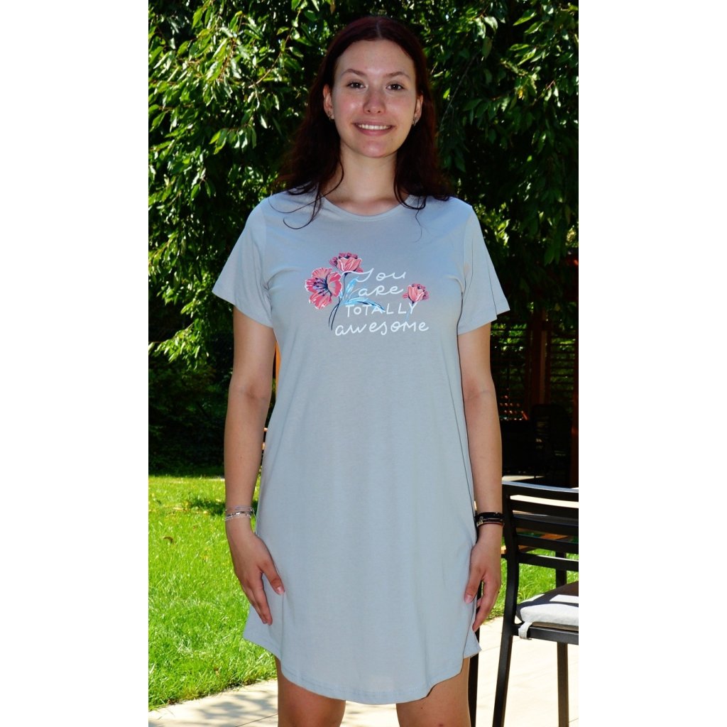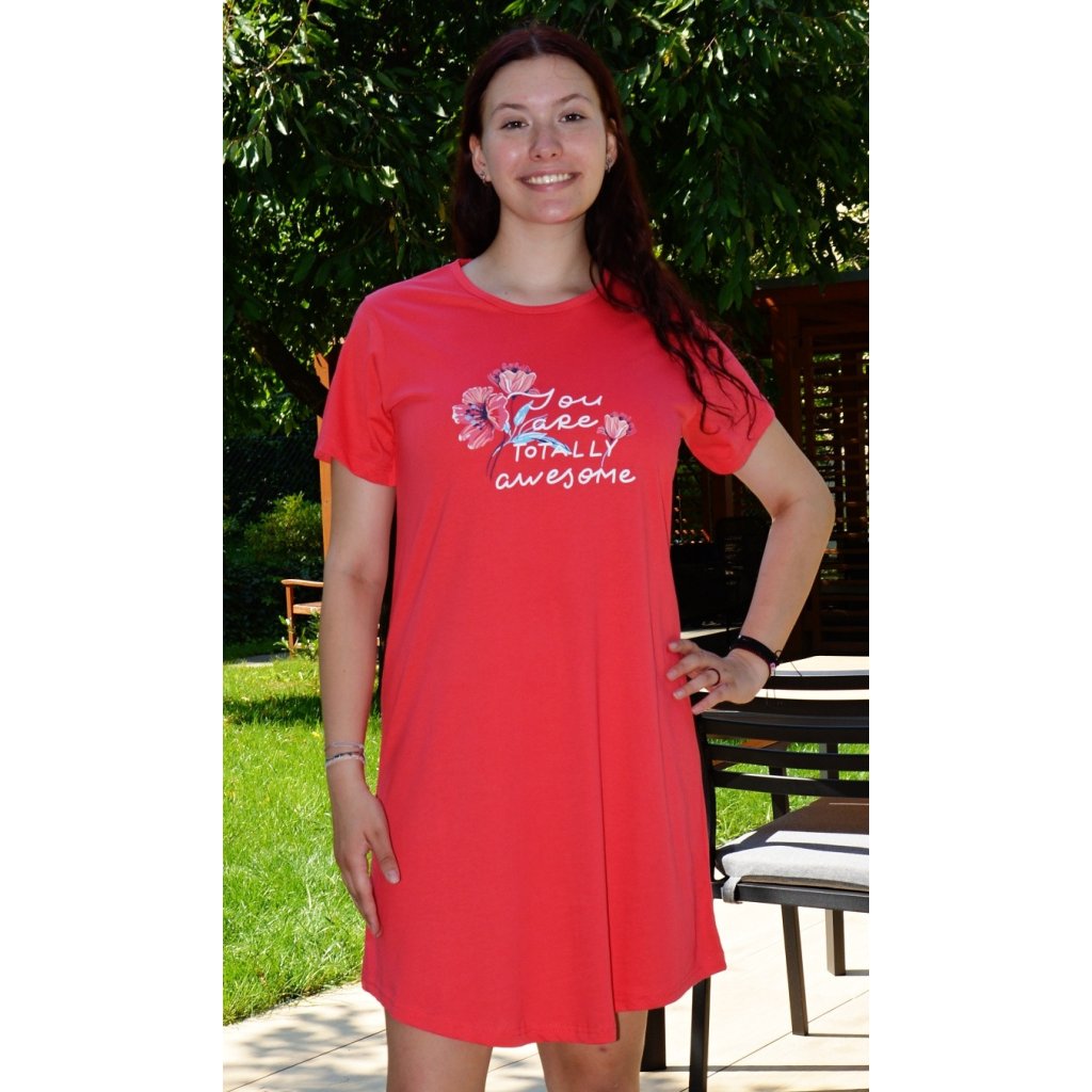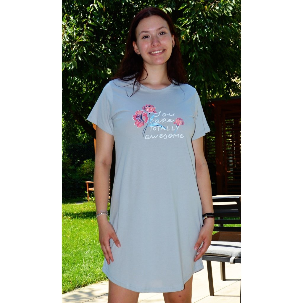 Dámská bavlněná noční košile s krátkým rukávem Cassie. Noční košile s kulatým výstřihem má na hrudi obrázek květů a nápis 'You are totally awesome'. Použitý bavlněný materiál je příjemný a poddajný na dotek.