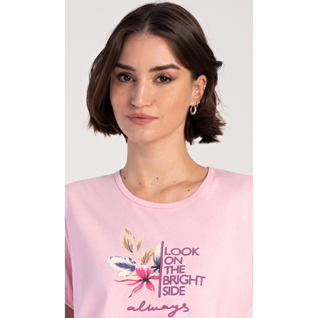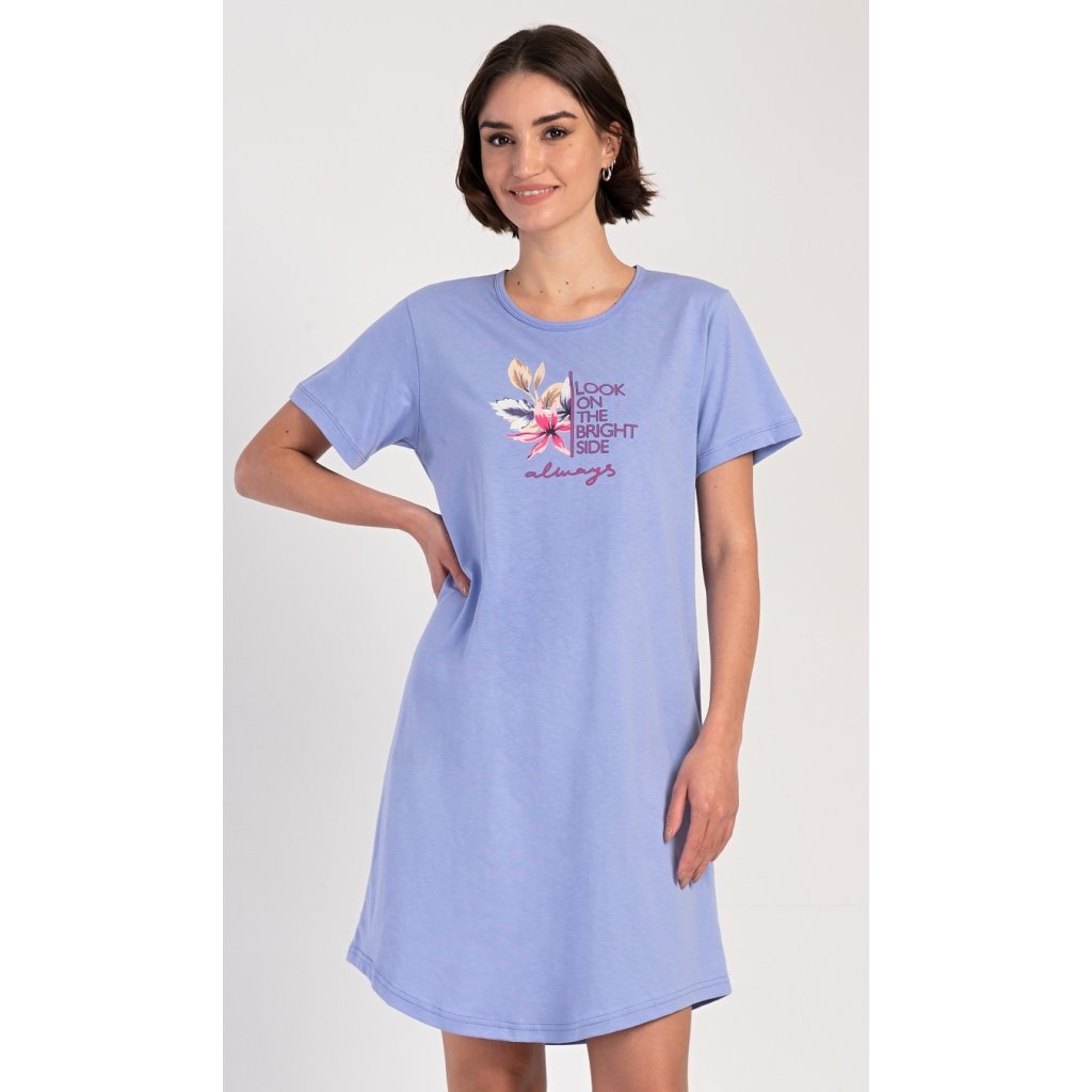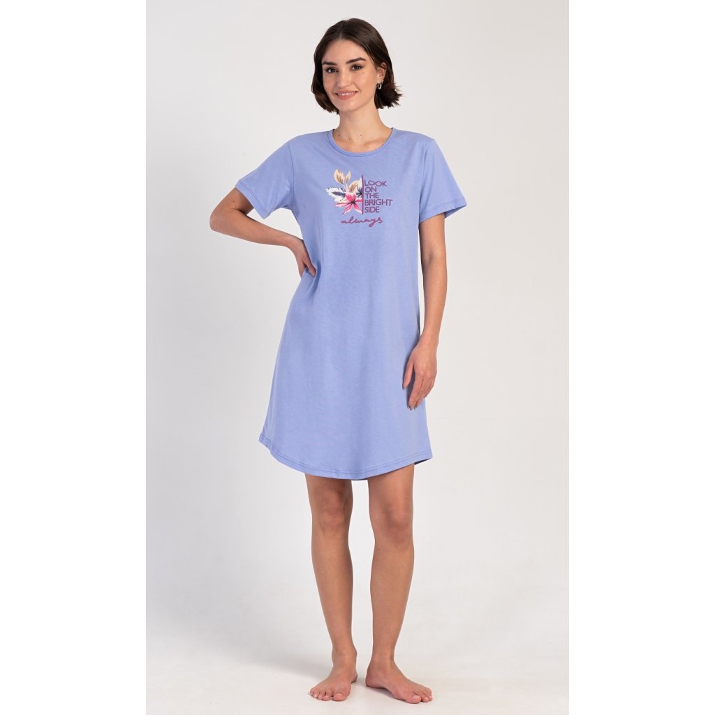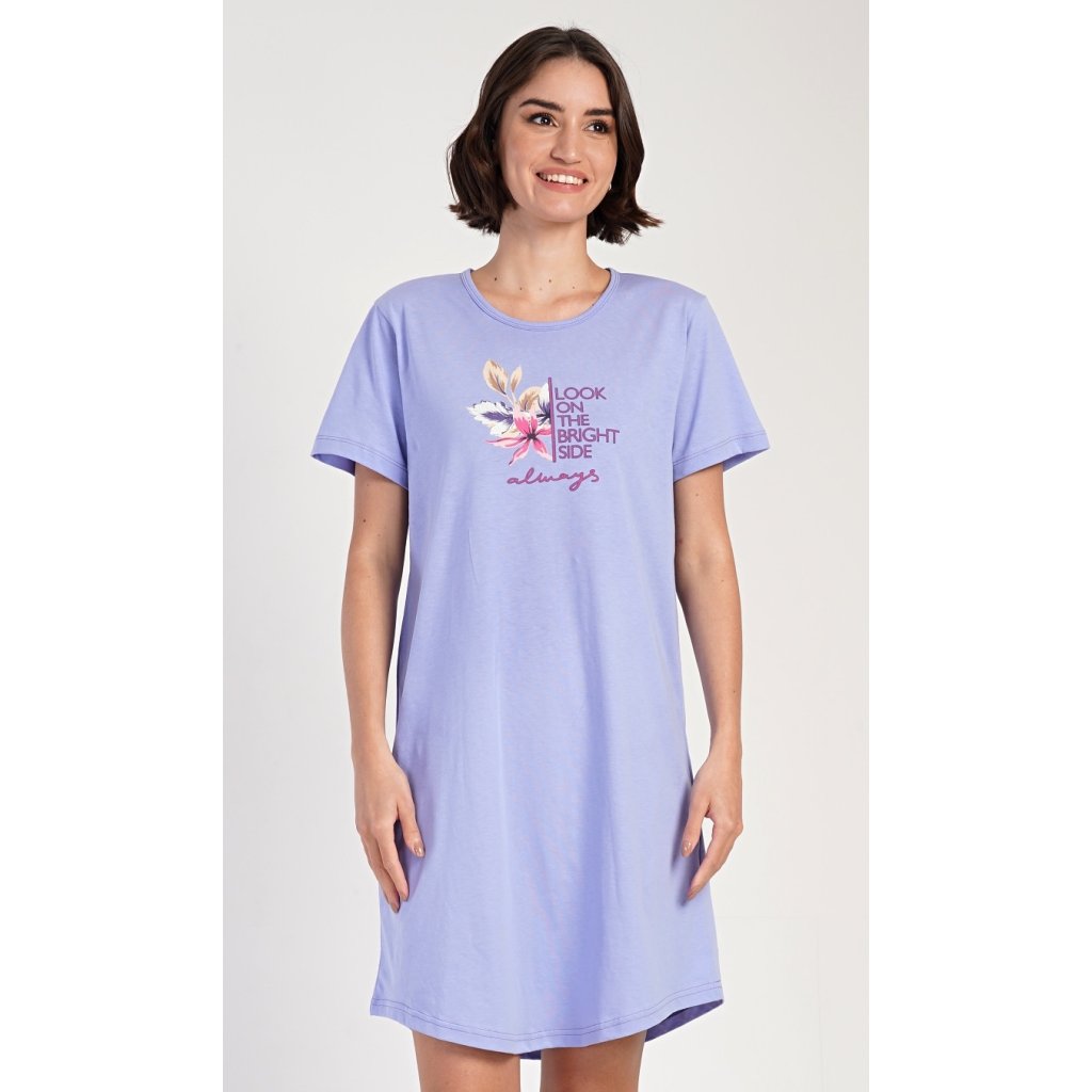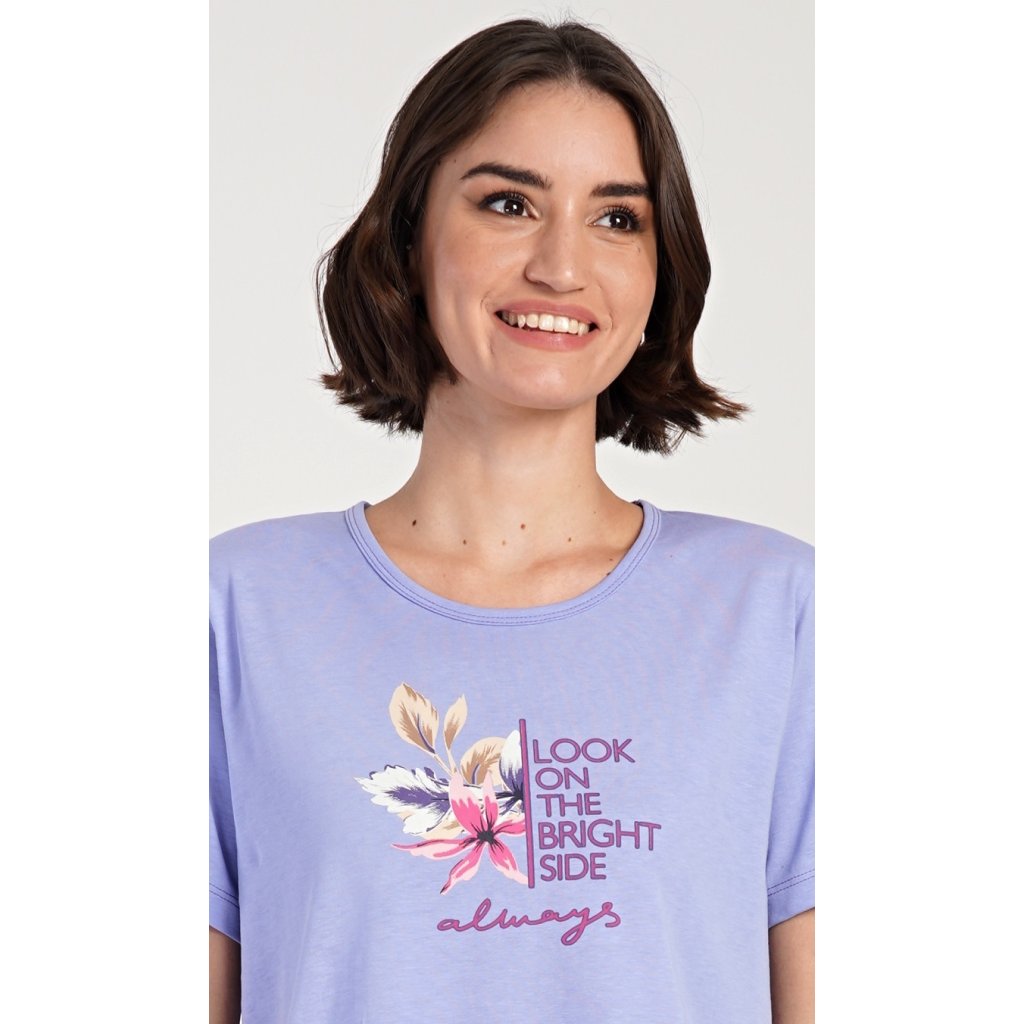 Dámská bavlněná noční košile s krátkým rukávem Elizabeth. Noční košile s kulatým výstřihem a příjemnou délkou nad kolena má na hrudi obrázek exotických květů a nápis 'Look on the bright side always'. Použitý materiál s obsahem bavlny 100% je příjemný a poddajný na dotek.
