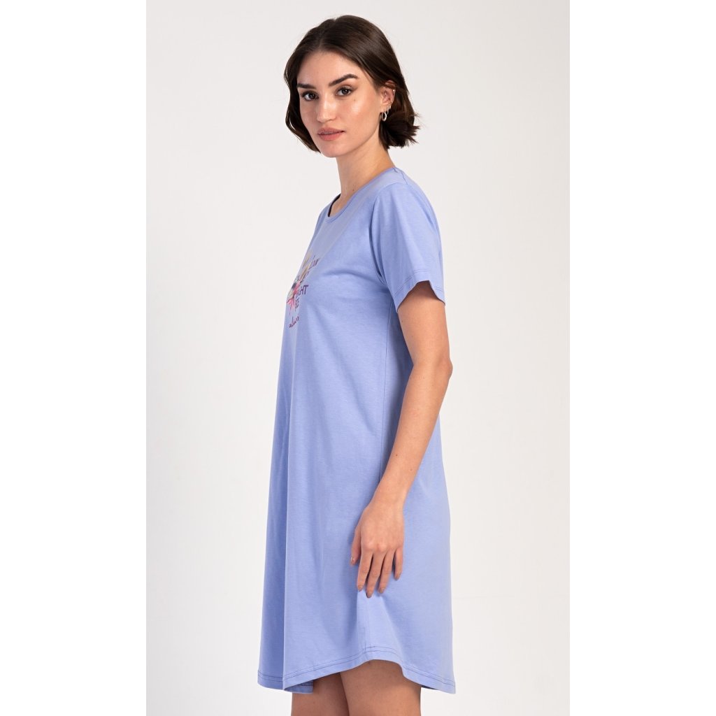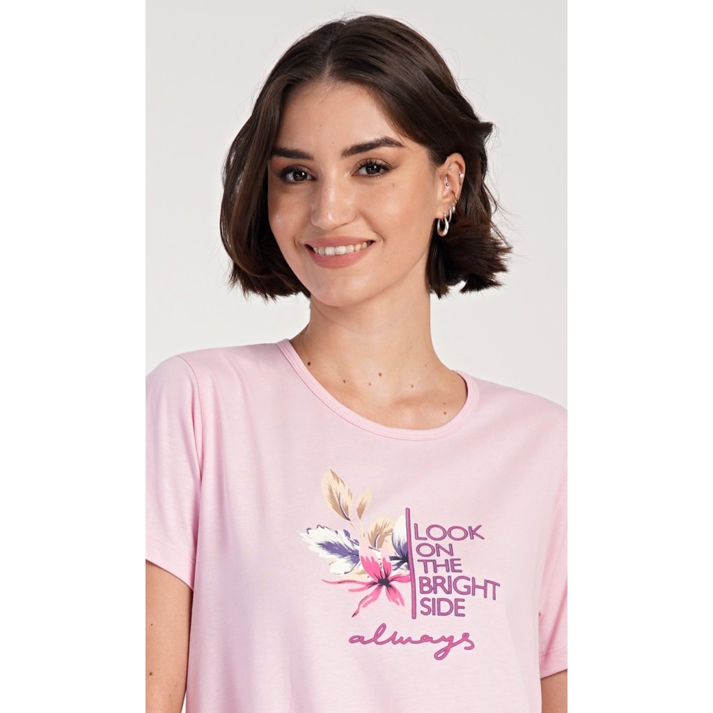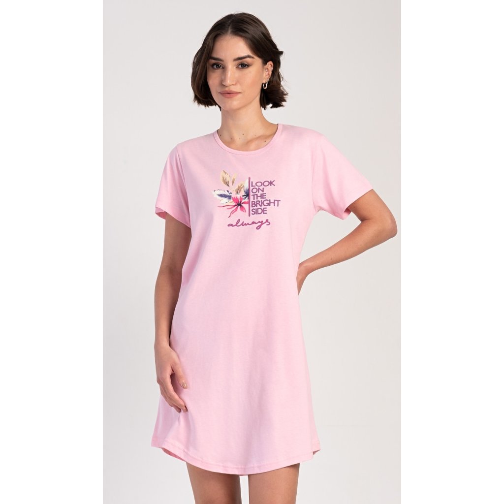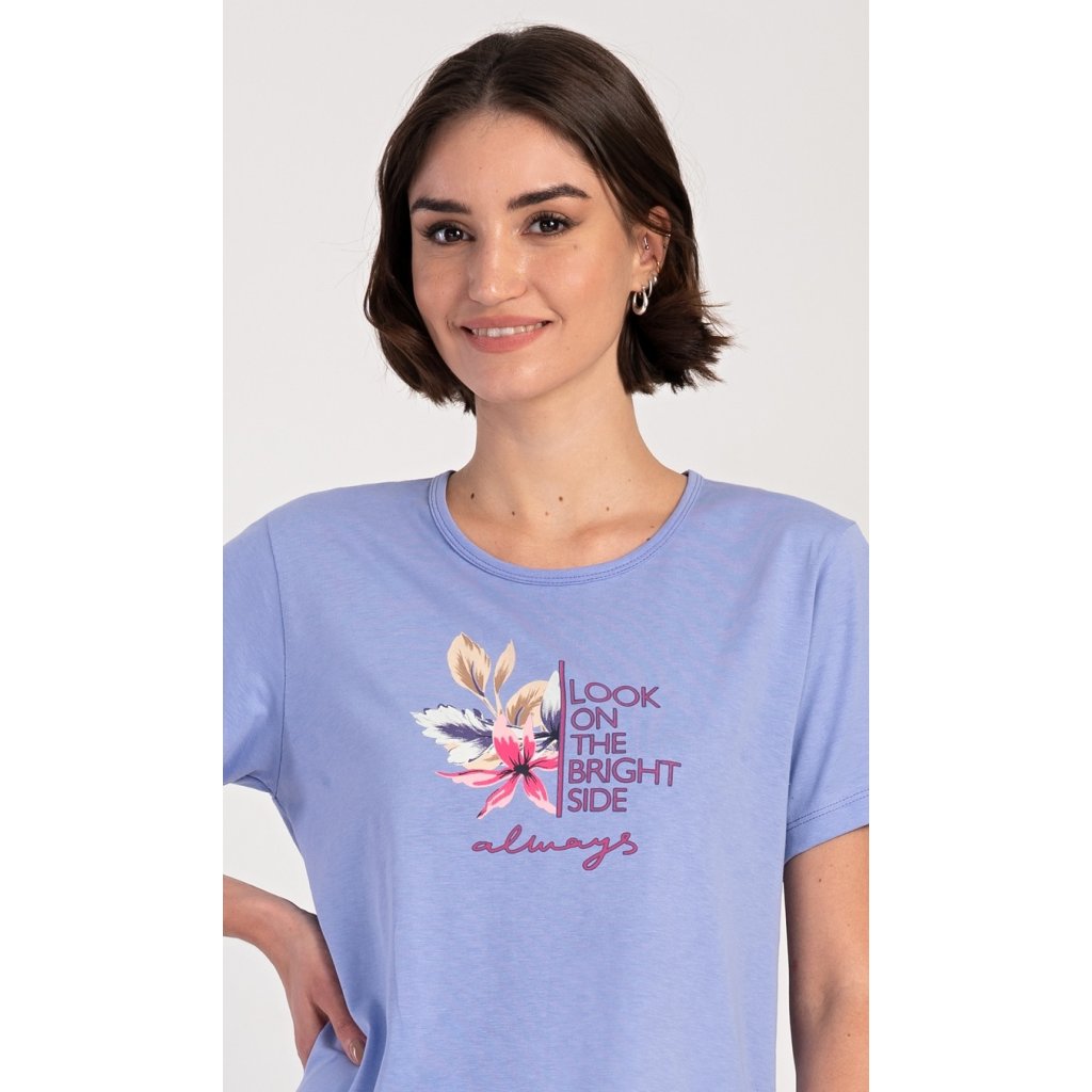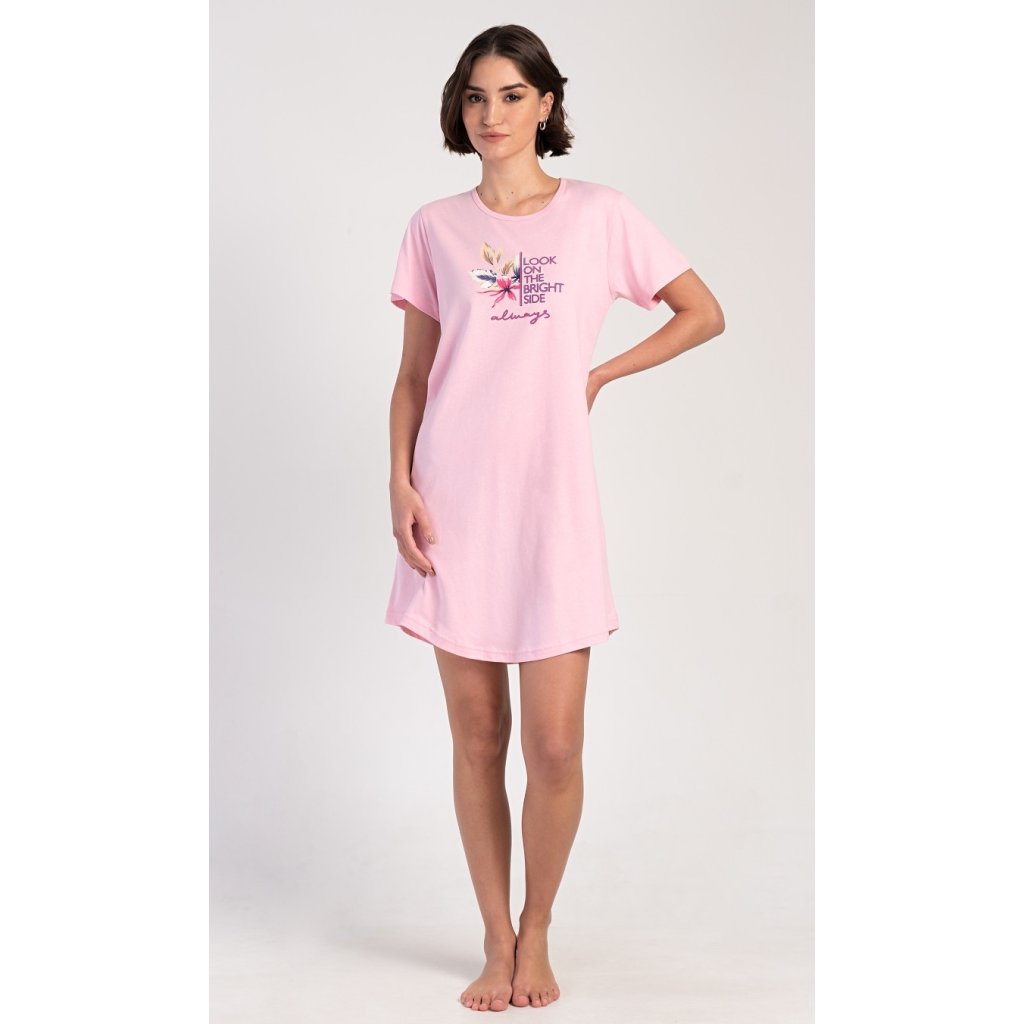 Dámská bavlněná noční košile s krátkým rukávem Elizabeth. Noční košile s kulatým výstřihem a příjemnou délkou nad kolena má na hrudi obrázek exotických květů a nápis 'Look on the bright side always'. Použitý materiál s obsahem bavlny 100% je příjemný a poddajný na dotek.