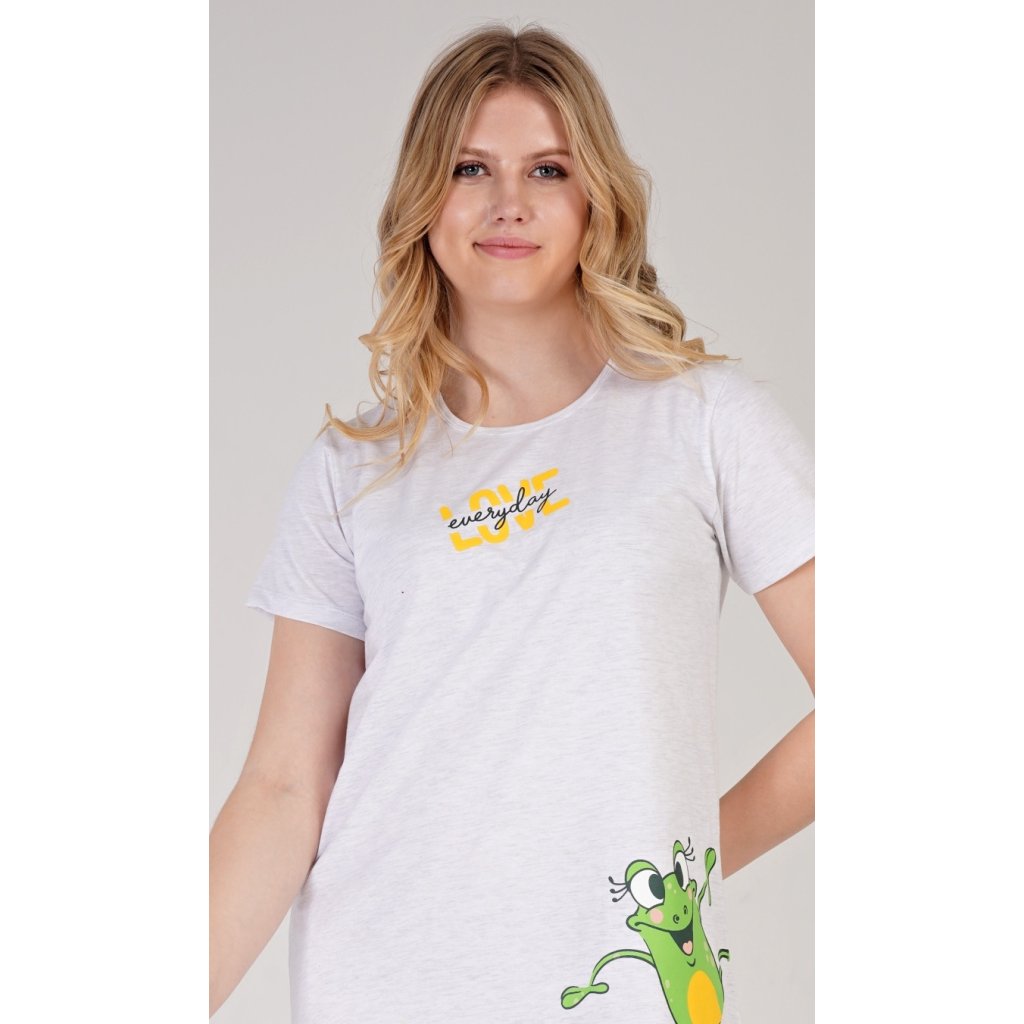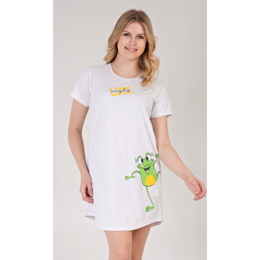 Dámská noční košile s krátkým rukávem Frog. Noční košile s kulatým výstřihem má ve spodní části na boku obrázek veselé žabky a na prsou nápis LOVE EVERYDAY. Použitý materiál s podílem bavlny 70% je příjemný a poddajný na dotek.