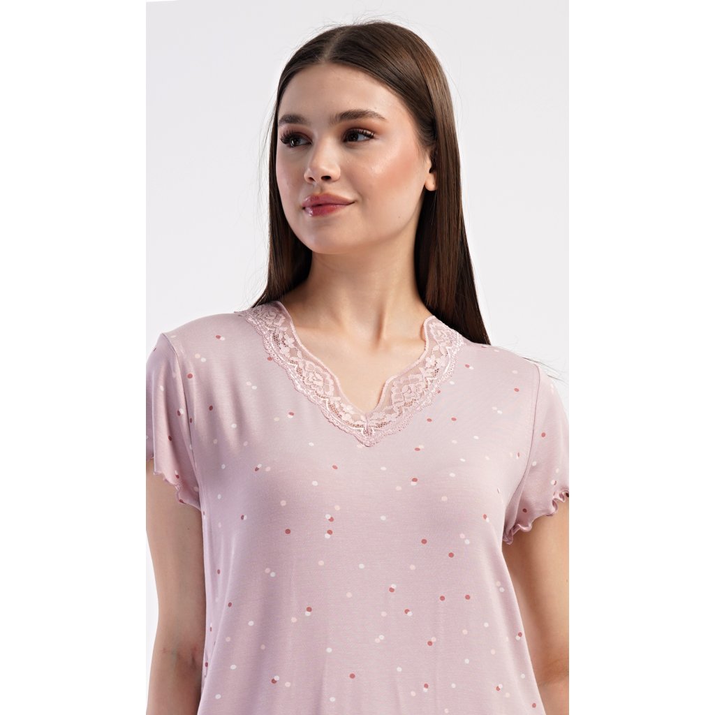 Dámská noční košile s krátkým rukávem Iris. Noční košile s příjemnou délkou po kolena má žlábkování na rukávech a spodním lemu, výstřih je ozdoben krajkou. Na látce košile jsou natištěny drobné puntíky. Použitý viskózový materiál s příměsí lycry je příjemný a poddajný na dotek.