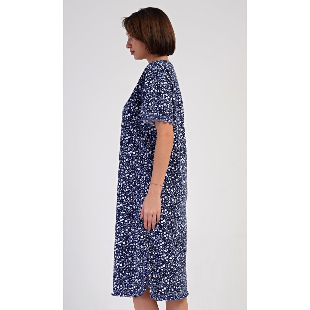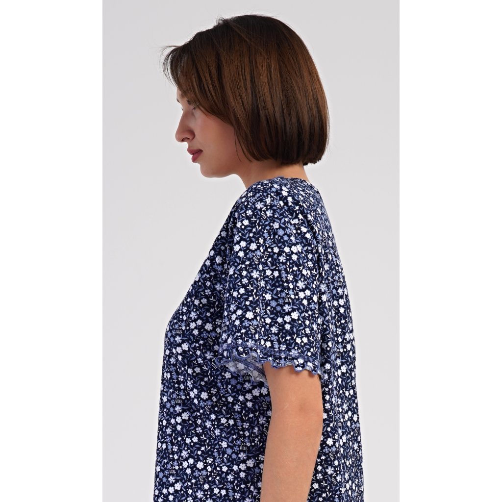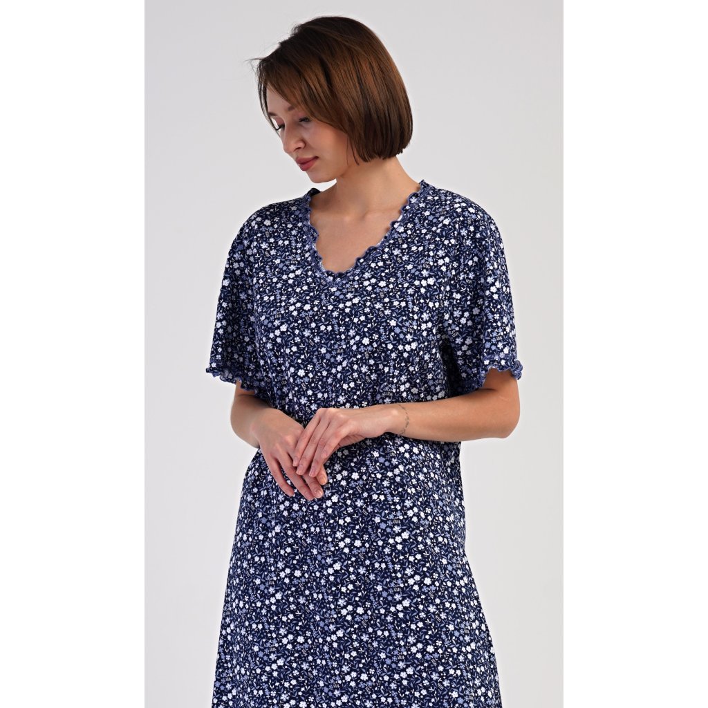 Dámská bavlněná noční košile s krátkým rukávem Miriam. Dámská noční košile má příjemnou délkou pod kolena a ozdobné žlábkování okolo výstřihu, rukávů a spodního lemu. Košile s krátkým rukávem je potištěna drobnými květy. Použitý materiál s podílem bavlny 100% je příjemný a poddajný na dotek.