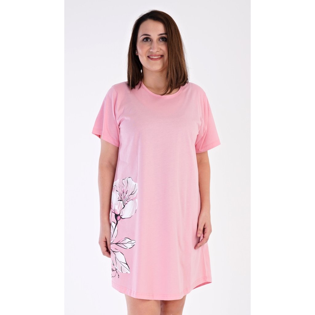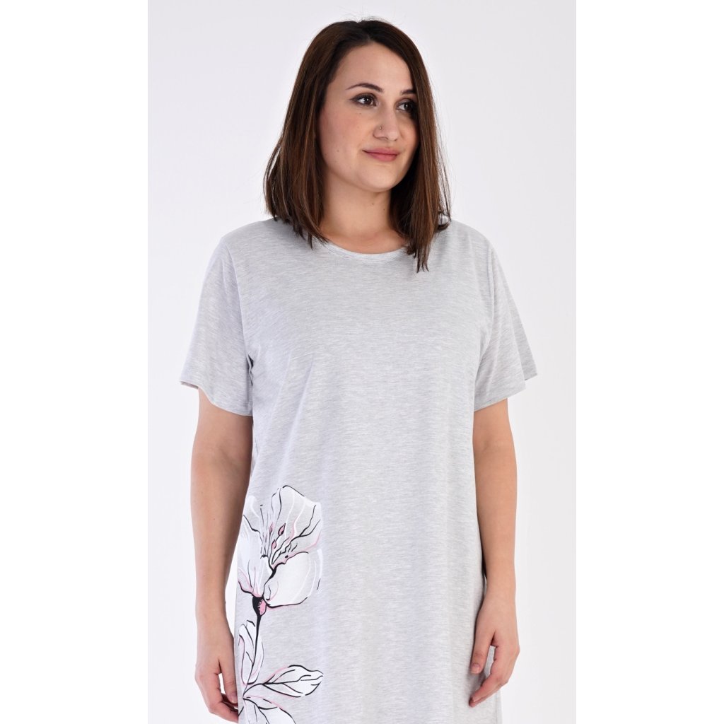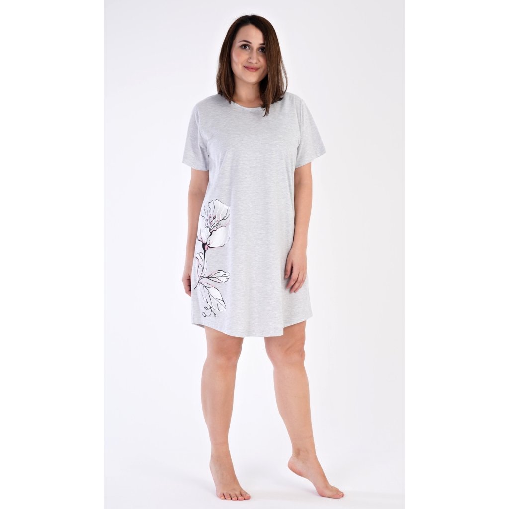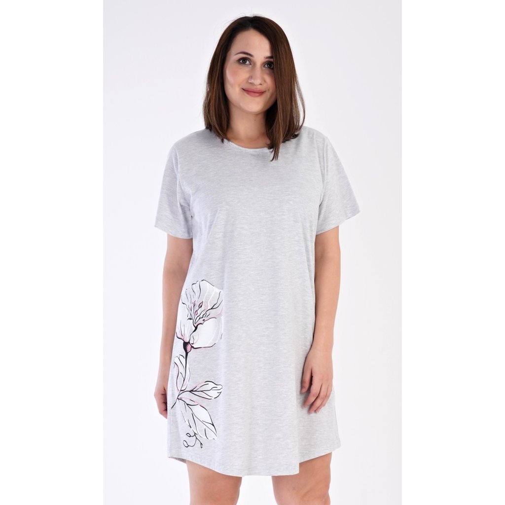 Dámská noční košile s krátkým rukávem Nicol. Noční košile s kulatým výstřihem má ve spodní části na boku obrázek květiny. Použitý materiál je příjemný a poddajný na dotek. Obsah bavlny u lososové barvy je 100% a u světle šedé 70%.
