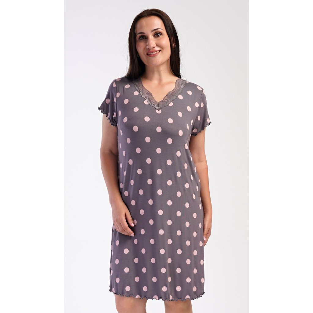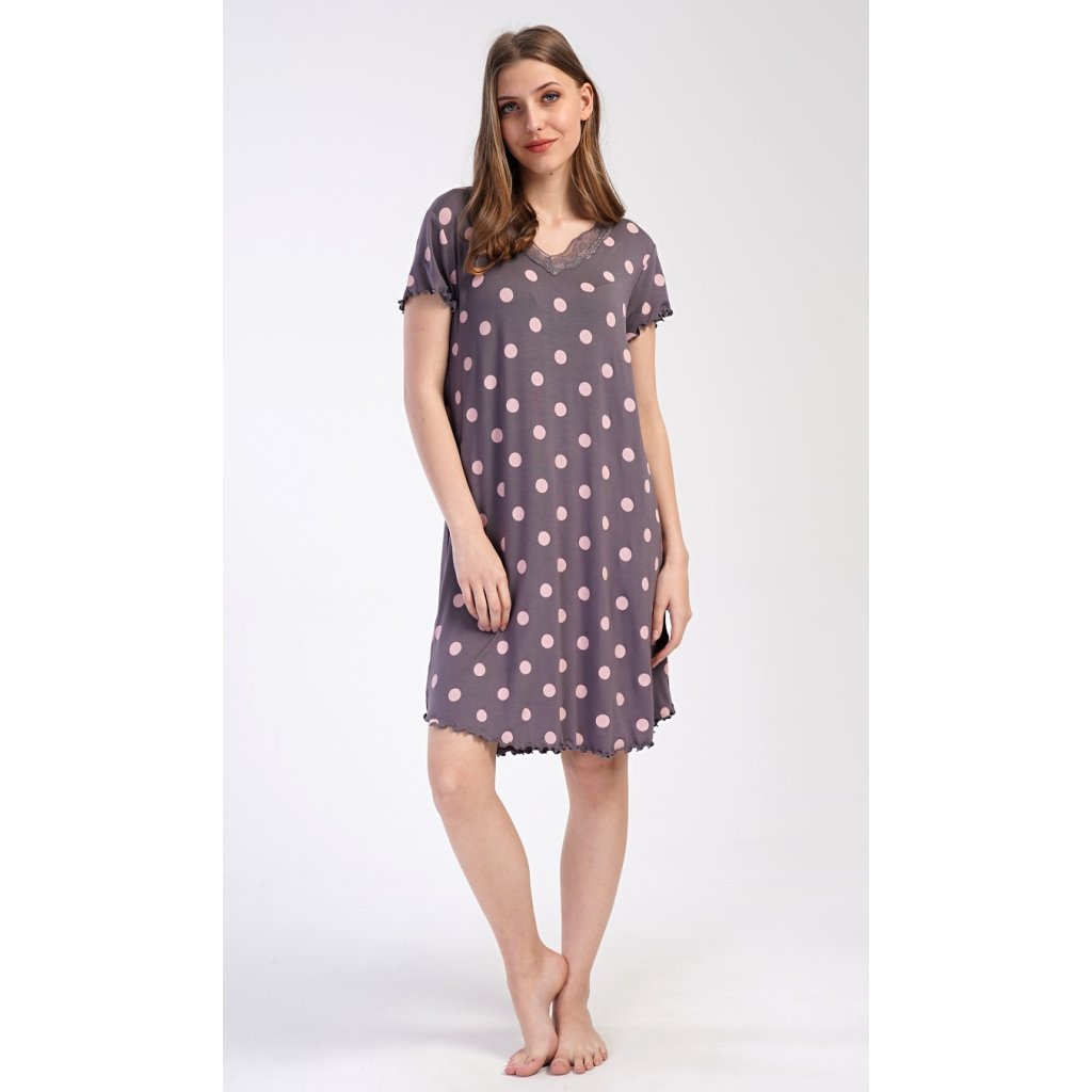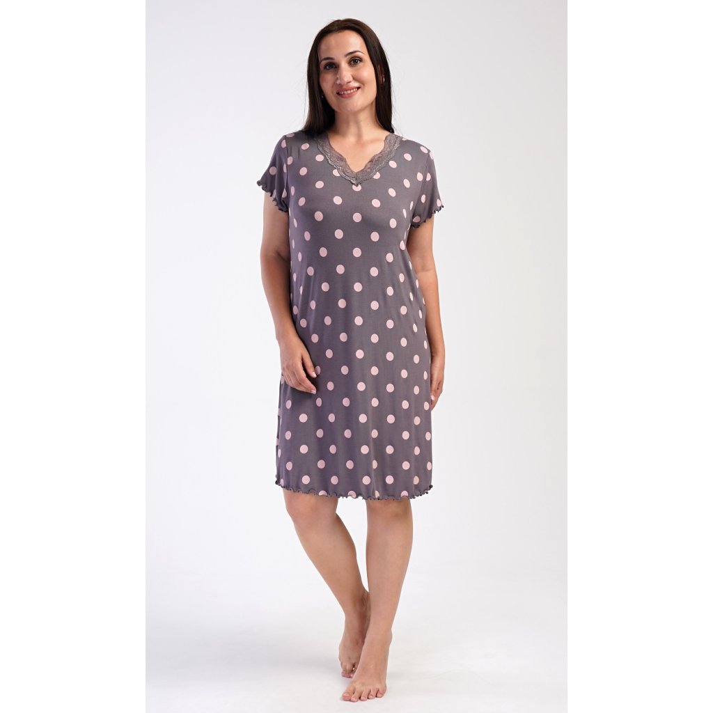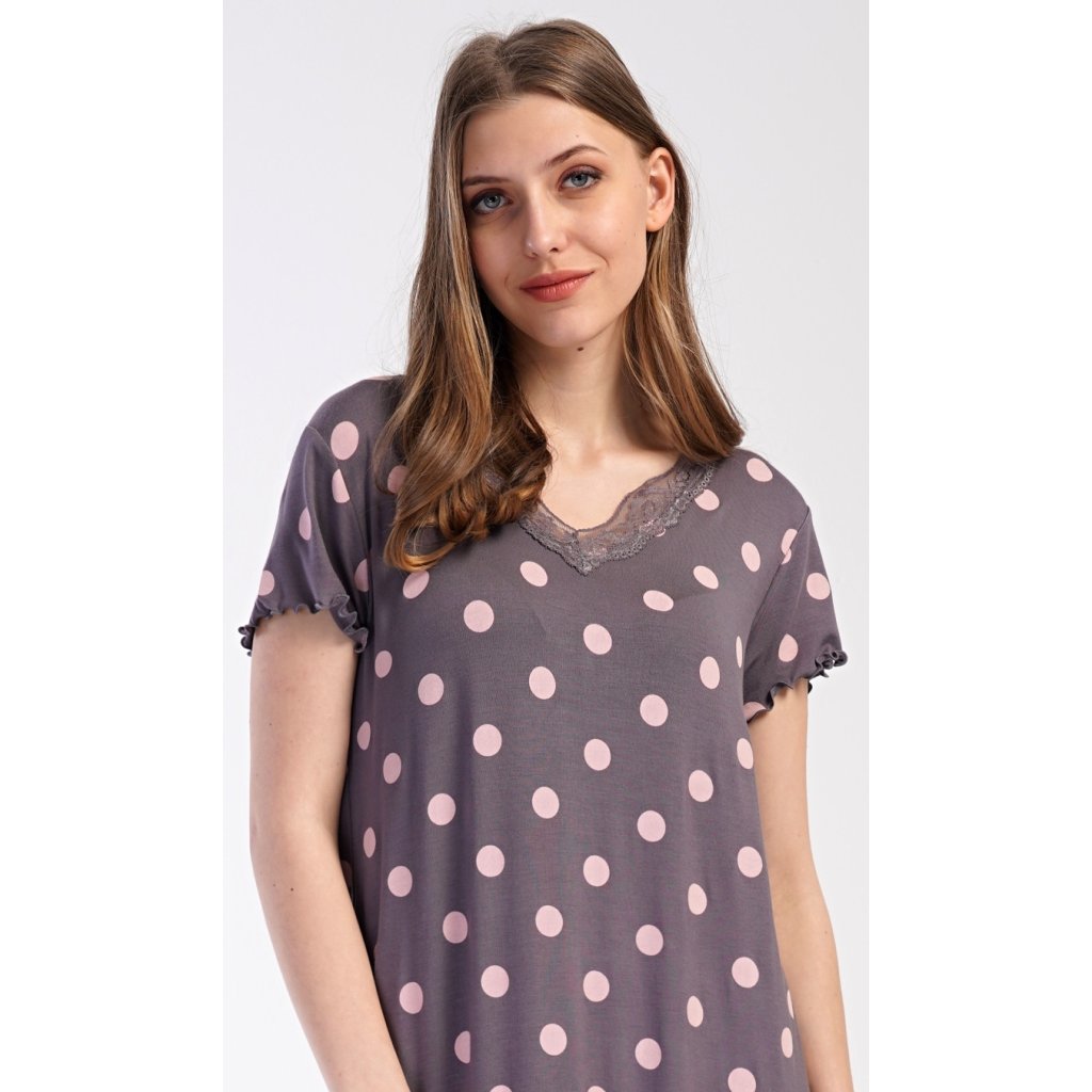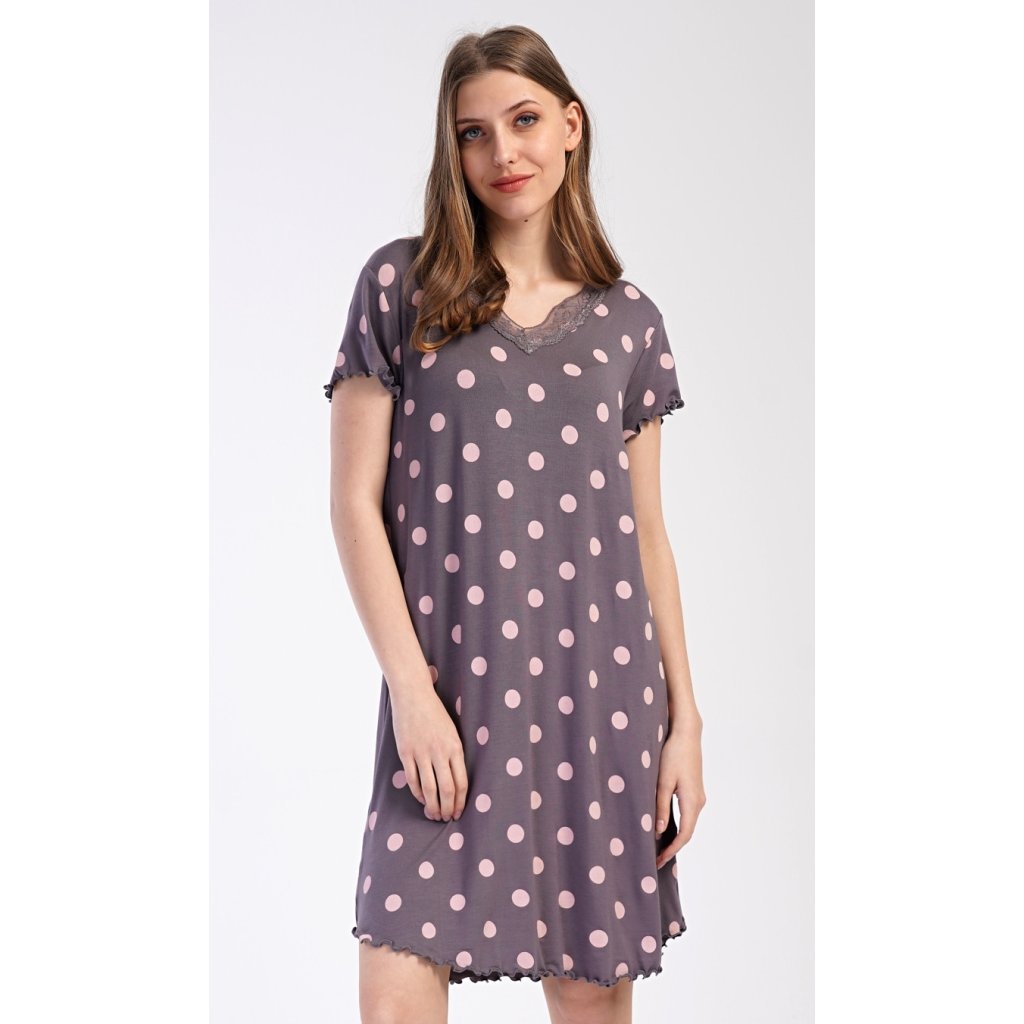 Dámská noční košile s krátkým rukávem Puntíky. Dámská noční košile má příjemnou délkou nad kolena a ozdobné žlábkování okolo rukávů a spodního lemu. Výstřih je ozvláštněn jemnou krajkou. Košile s krátkým rukávem je potištěna puntíky ve světle lososové barvě. Použitý materiál ze směsi viskózy a lycry je příjemný a poddajný na dotek.