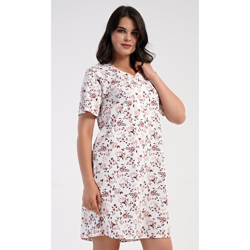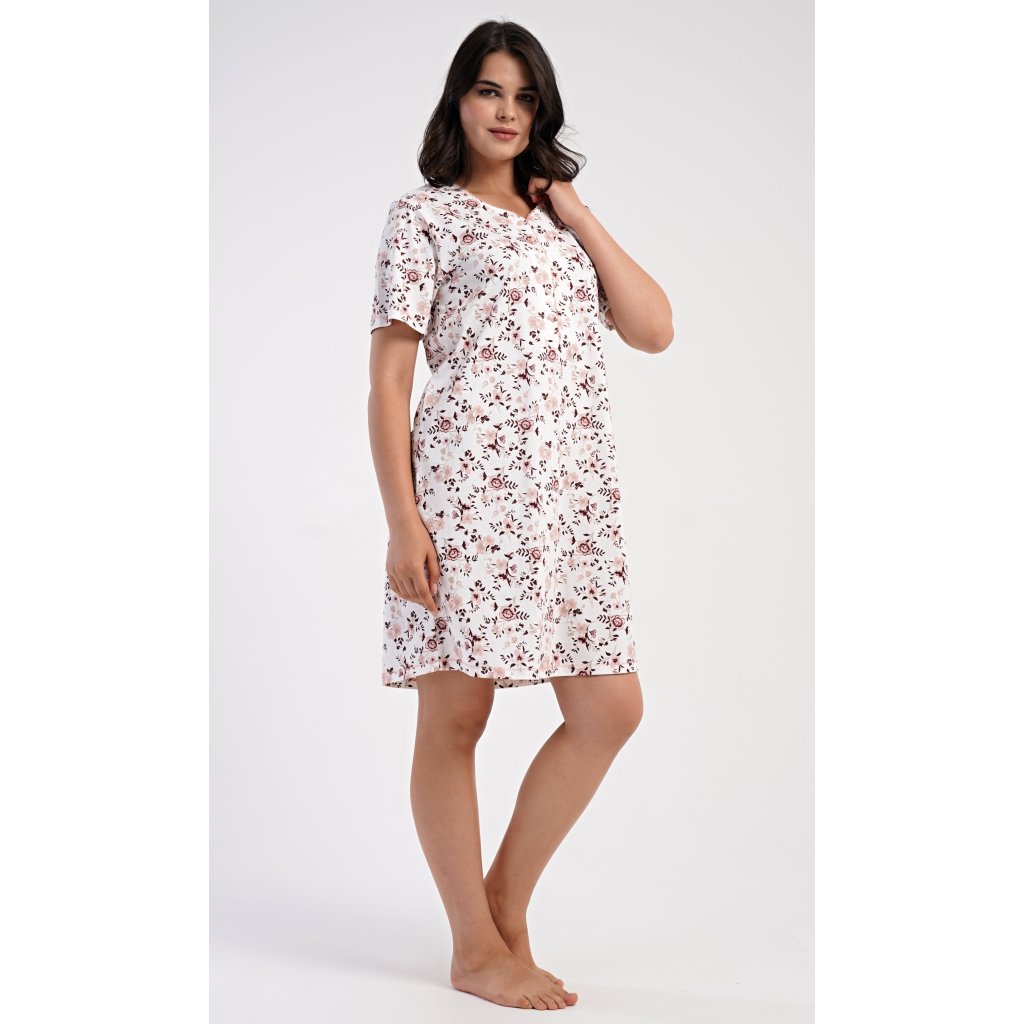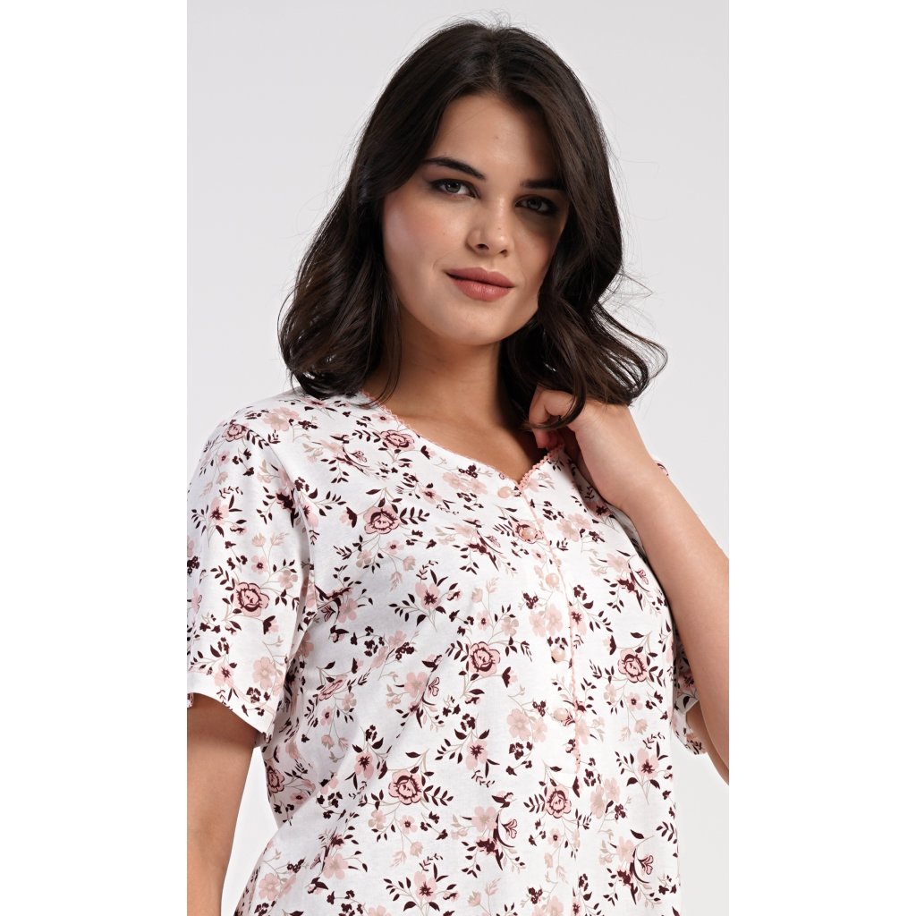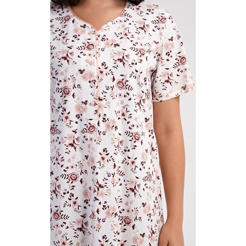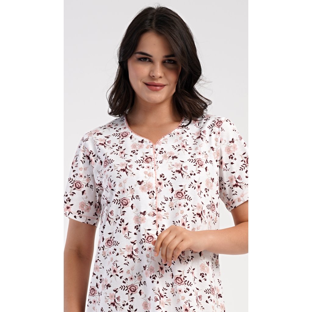 Dámská bavlněná noční košile s krátkým rukávem Růže. Dámská noční košile má příjemnou délkou po kolena a delší légu s pěti knoflíky. Košile s krátkým rukávem je potištěna růžemi v lososové barvě. Použitý materiál s podílem bavlny 100% je příjemný a poddajný na dotek.
