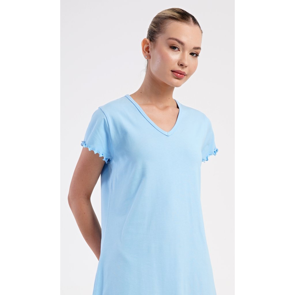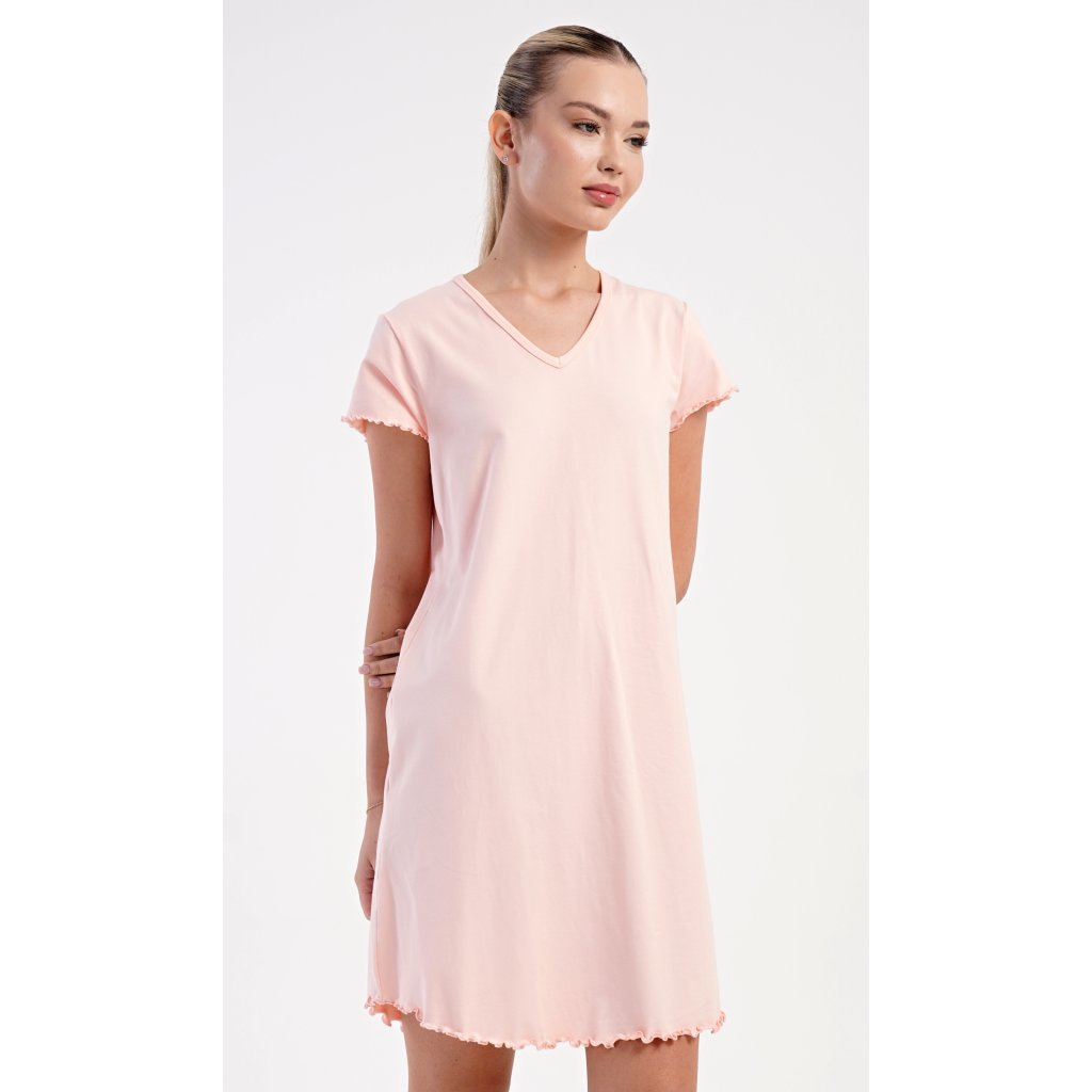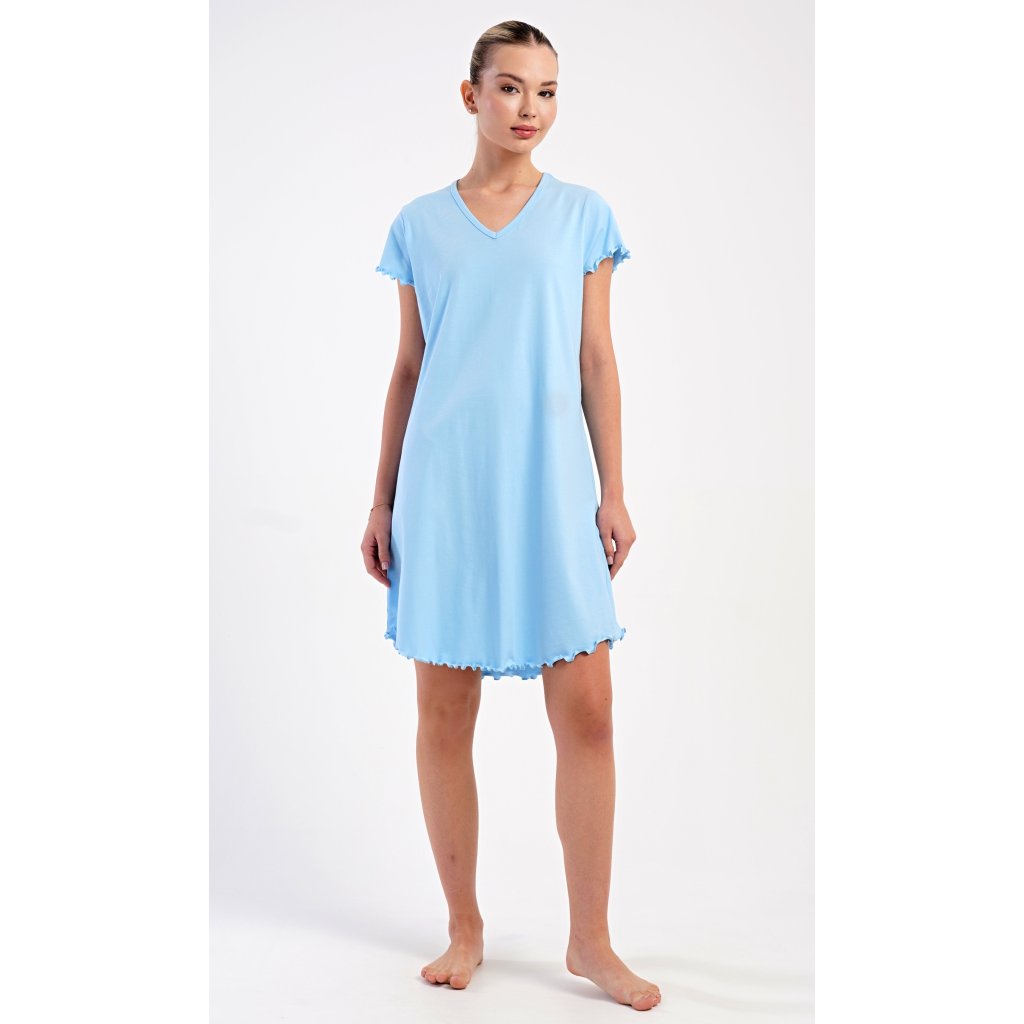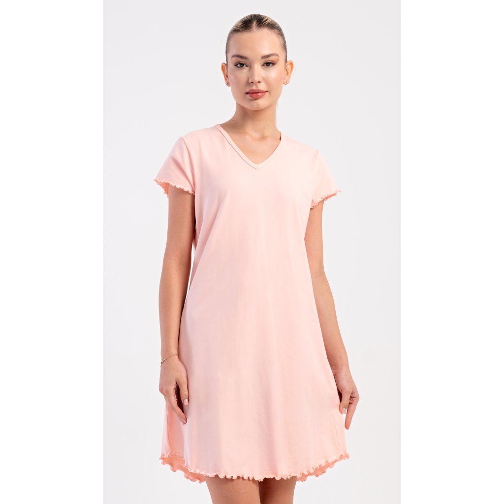 Dámská bavlněná noční košile s krátkým rukávem Sandra. Košile má příjemnou délkou nad kolena a výstřih do V, je ozdobena žlábkováním na rukávech a spodním lemu. Použitý materiál s podílem bavlny 95% je příjemný a poddajný na dotek.