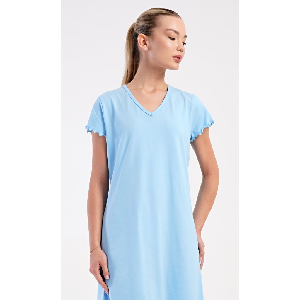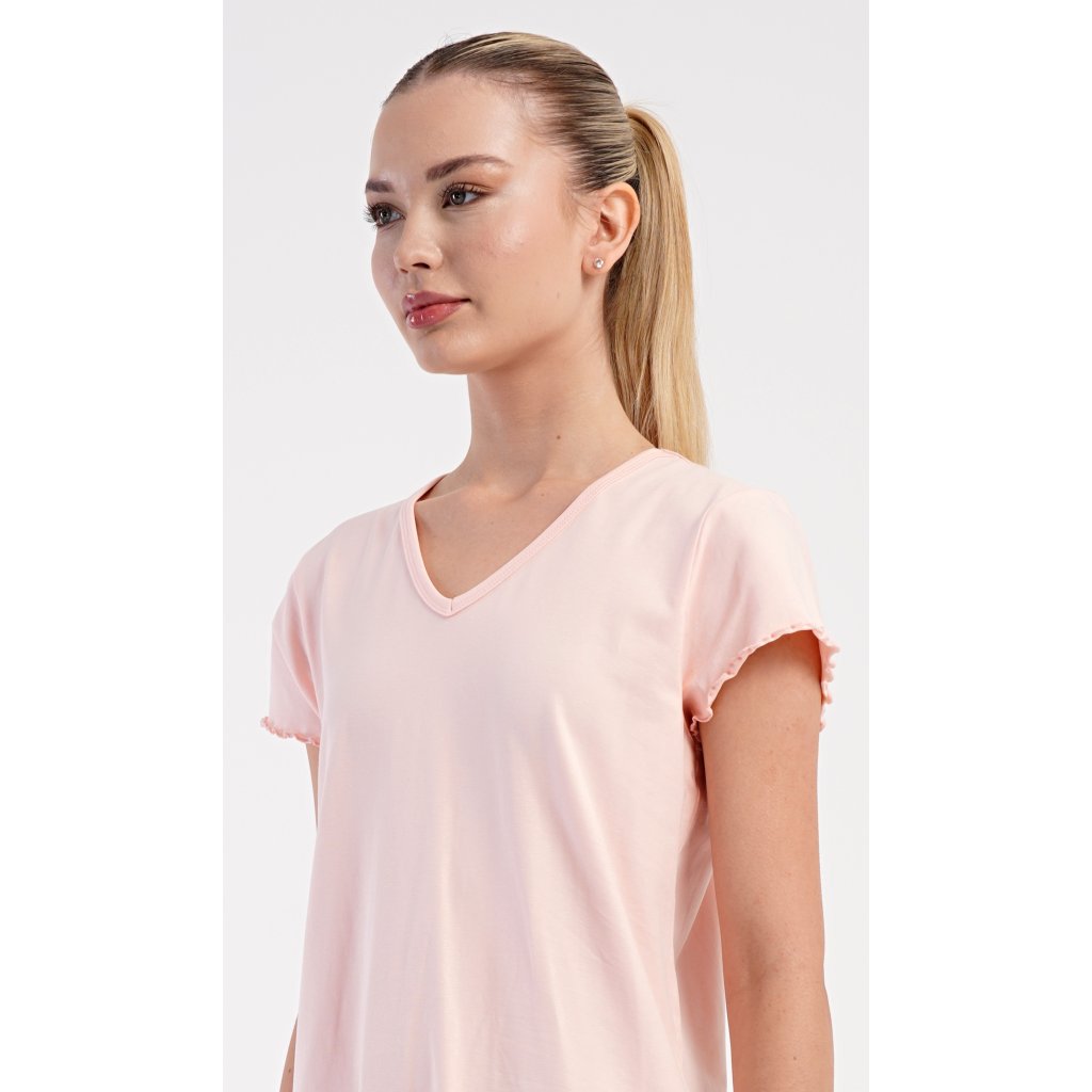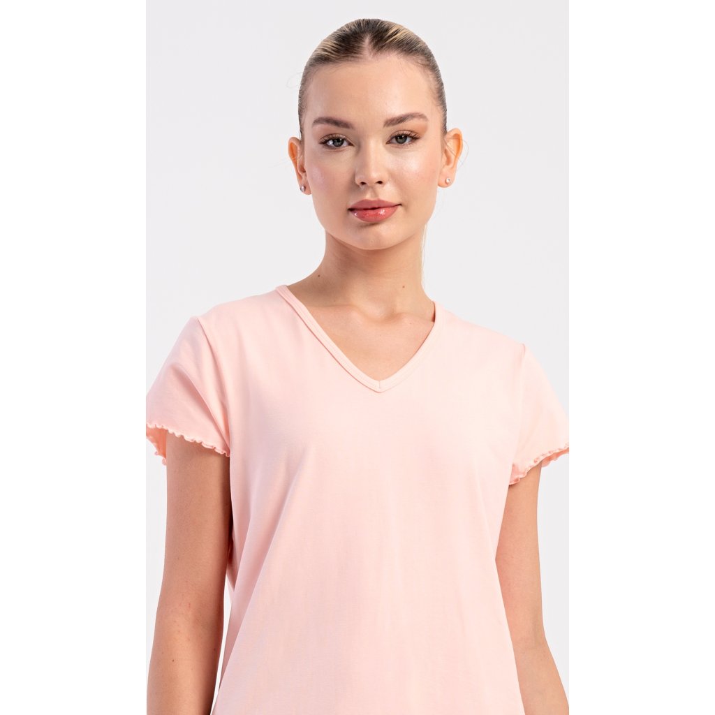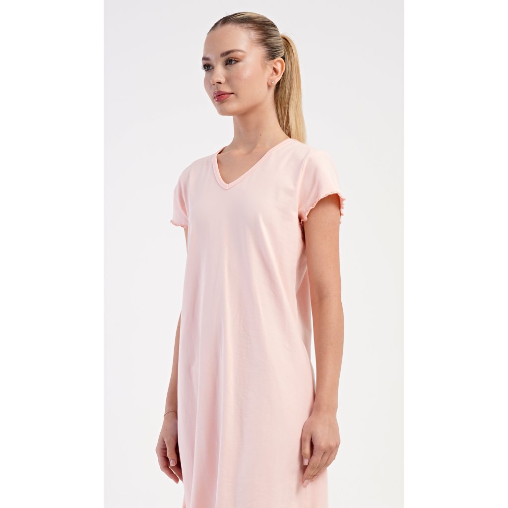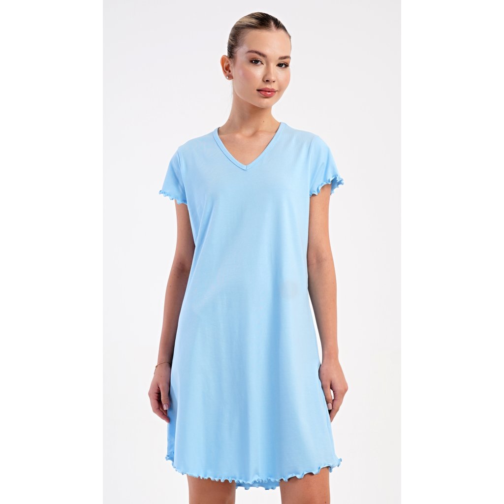Dámská bavlněná noční košile s krátkým rukávem Sandra. Košile má příjemnou délkou nad kolena a výstřih do V, je ozdobena žlábkováním na rukávech a spodním lemu. Použitý materiál s podílem bavlny 95% je příjemný a poddajný na dotek.