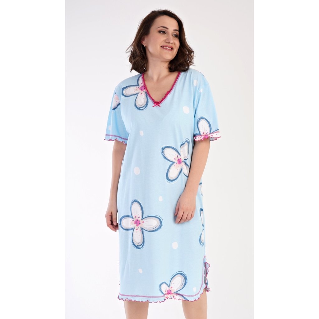 Dámská bavlněná noční košile s krátkým rukávem Veronika. Noční košile s příjemnou délkou pod kolena má ozdobné žlábkování kolem výstřihu, rukávů a spodního lemu, který je ozvláštněn rozparkem. Na látce košile jsou natištěny velké květy. Použitý bavlněný materiál je příjemný a poddajný na dotek.