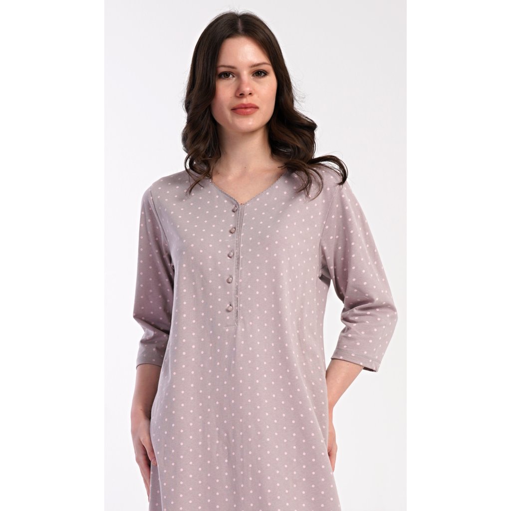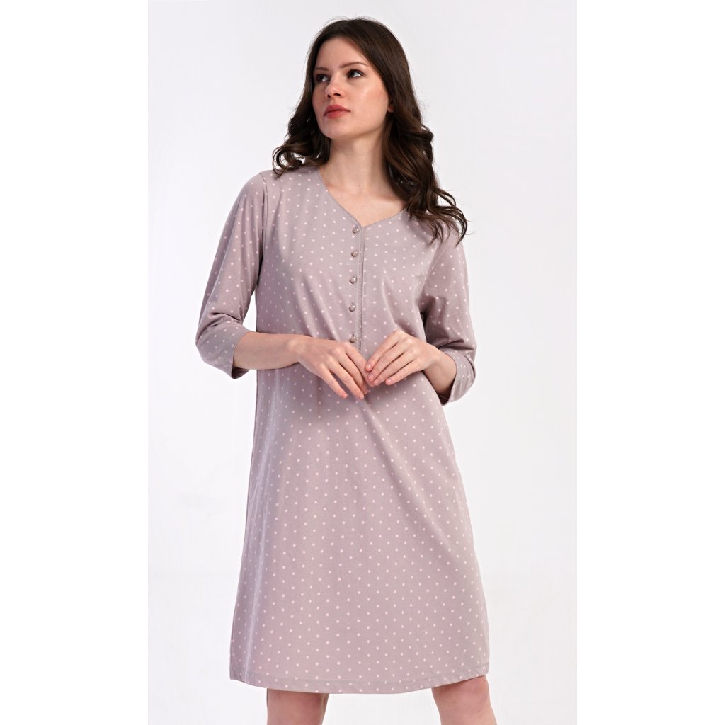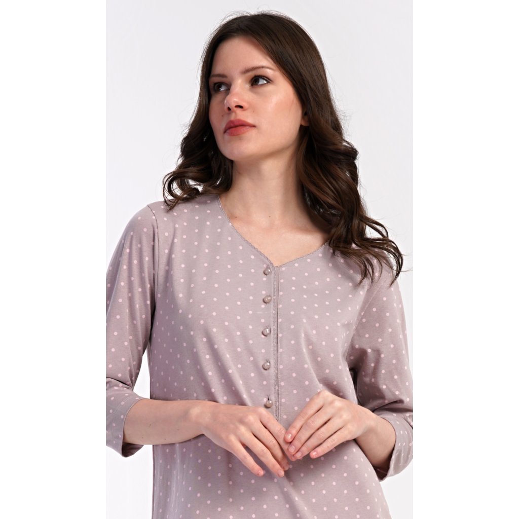 Dámská bavlněná noční košile s tříčtvrtečním rukávem Adélka. Noční košile se zapínáním na knoflíky a příjemnou délkou nad kolena je ozdobena drobnými puntíky. Použitý materiál s obsahem bavlny 100% je příjemný a poddajný na dotek.