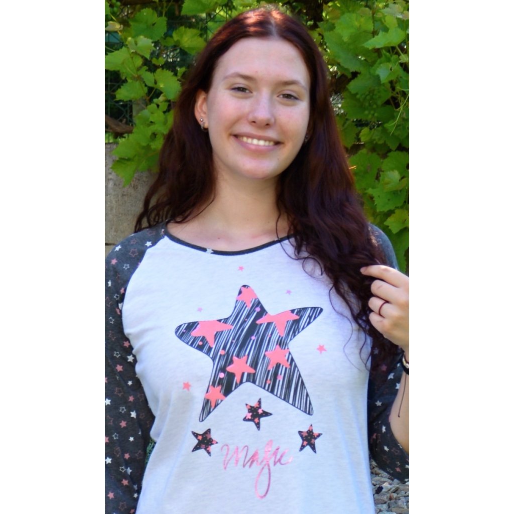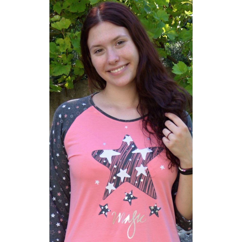 Dámská noční košile s tříčtvrtečním rukávem Hvězda. Dámská noní košilka má pohledově odlišené rukávy, které jsou potištěné drobnými hvězdičkami. Na hrudi je velká hvězda, která má v sobě menší hvězdičky a je ještě dalšími hvězdami obklopena. Pod hvězdou je stříbřitý nápis. Použitý materiál je jemný a poddaný na dotek. Košile je vhodná i na denní nošení.