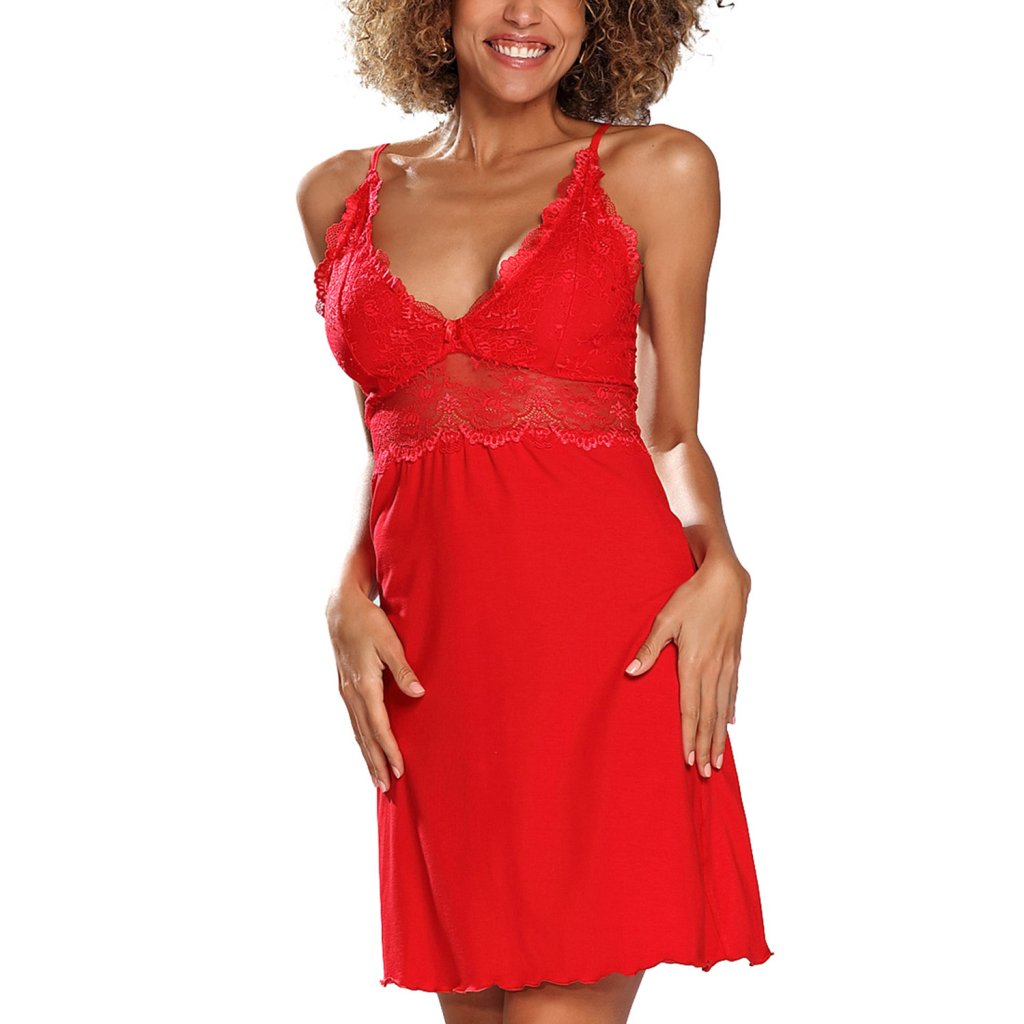 Svůdná, sexy noční košilka.- vypasovaný střih zvýrazňuje postavu- Výstřih ve tvaru V- poprsí zdobené krajkou- spodní část zdobená krajkou- tenké, nastavitelné popruhy- příjemné a kvalitní pletené výrobkySložení: 92 % viskóza, 8 % elastan.Doplňkové parametry