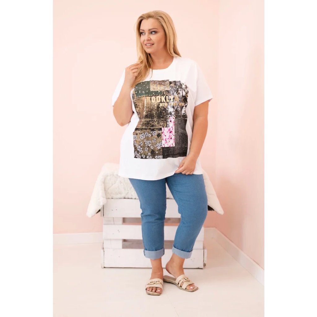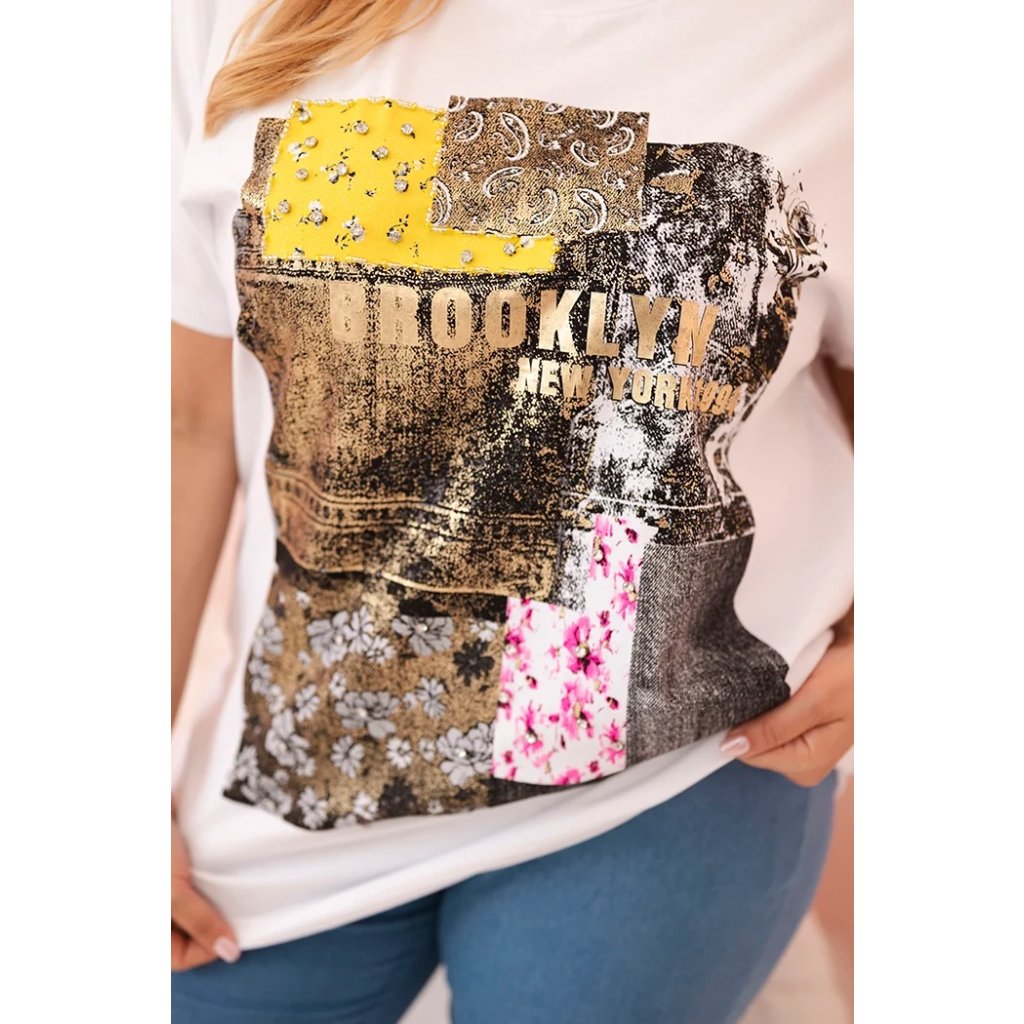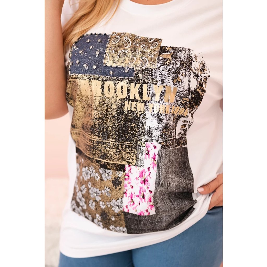 Pokud hledáte pohodlnou a zároveň originální halenku na každodenní nošení – tato nabídka vás jistě zaujme! Dámská halenka s krátkým rukávem, ozdobená barevným potiskem ve stylu patchworku, je ideální kombinací pohodlí a městského stylu. Přední část zdobí zajímavý kontrastní potisk s motivem "Brooklyn New York", který celku dodává moderní charakter. Tento model je ideální jak pro neformální stylizace s džínami, tak i jako pohodlný základ pod koženou bundu nebo kardigan. Díky volnému střihu krásně sedí na postavě a příjemný materiál s převahou bavlny zajišťuje pohodlí po celý den.