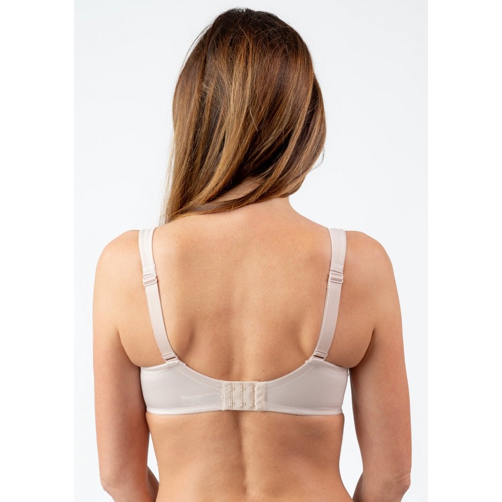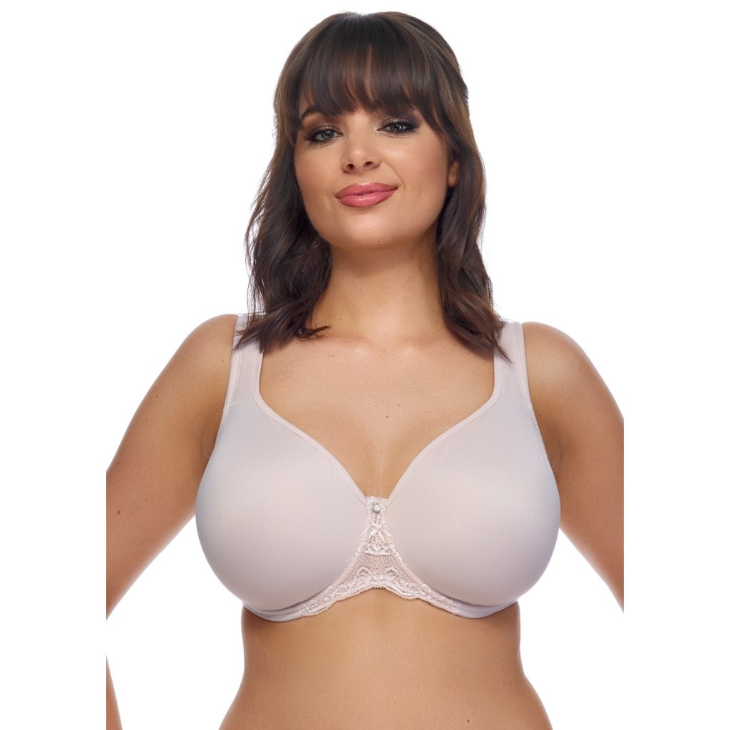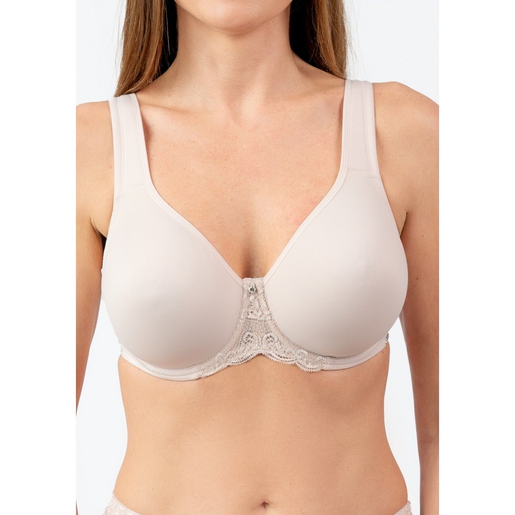 Dámská podprsenka značky Fantasy. Podprsenka je nevyztužená. Košíčky má hladké, v horní části jsou olemované. Uprostřed košíčků je stříbrná ozdoba se štrasovým kamínkem, která je našitá na ozdobné krajce mezi košíčky. Ramínka začínají z boční strany od košíčků a dále pokračují do širokých ramínek, která jsou lehounce vyztužená, aby se nikde nezařezávaly. Ramínka jsou délkově nastavitelná. Boční část je hladká. Zapínání je na dva háčky a ve třech řadách. Na boční straně podprsenky je našité stříbrné logo značky.