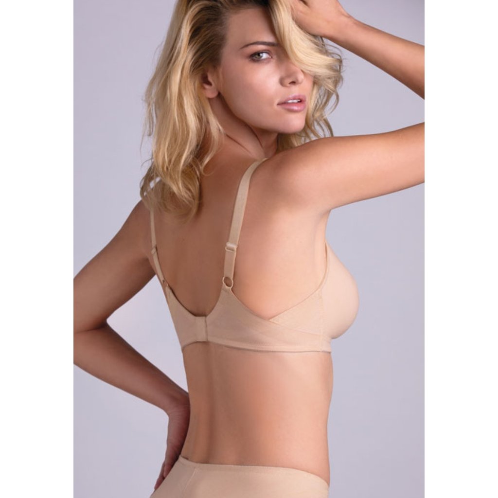 Dámská podprsenka od italské značky LEILIEVE. Bavlněná podprsenka klasického střihu s vyšším středem je vhodná na běžné každodenní nošení. Košíčky nejsou vyztuženy a nemají kostice. Tvar košíčků je do trojúhelníku, vnitřní stranu tvoří měkký pružný pruh látky, který dokonale sedne na jakýkoliv hrudník, zbytek košíčku tvoří pevnější pružná látka, která poprsí lehce přitáhne ze strany do středu a hezky ho podrží. Pod prsy mají košíčky pevnější šití. Obvod je širší, dostatečně pevný i pružný, v bocích jsou všity flexibiní kostice a aplikované překřížení pro maximální podporu. Ramínka jsou pevně všitá lehce délkově nastavitelná, hladká. Podprsenka se zapíná v zadní části na dva háčky a čtyři pozice.