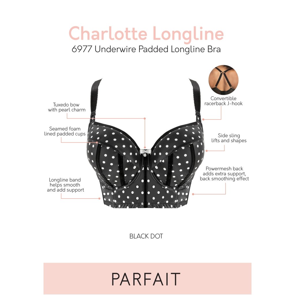 Mírně vyztužená podprsenka od značky Parfait v luxusní černé barvičce. Výborný střih dokáže udělat krásný kulatý dekolt, perfektně sedí plnějšímu poprsí. Tvaruje poprsí pěkně k sobě, nadzvedává je a tím vylepšuje i celkově opticky postavu. Podprsenka je uprostřed košíčků ozdobena malou mašličkou. U větších velikostí jsou širší ramínka a pětiháčkové zapínání. Podprsenka je zhotovena z jemného saténu. Tato série zaznamenala velký úspěch na výstavě v Paříži pro svůj originální vzhled a netradiční spojení materiálů.