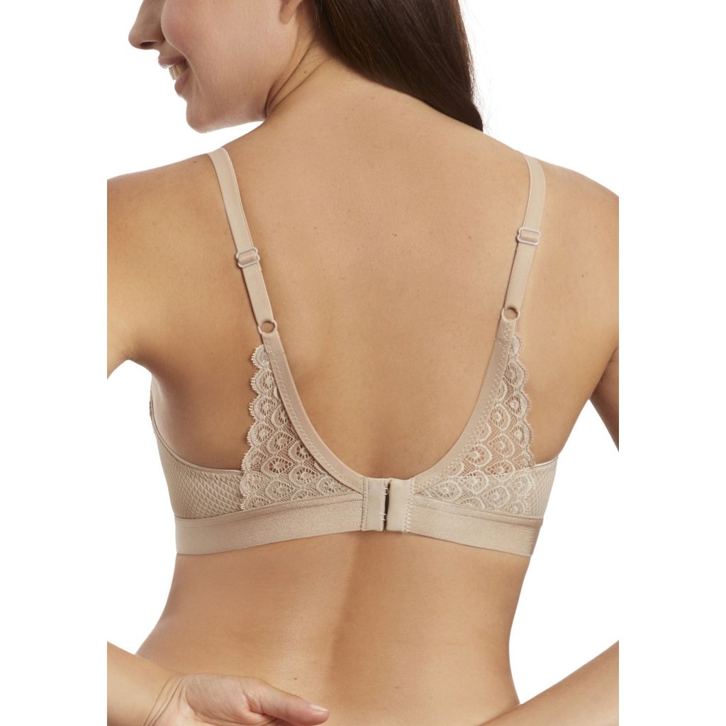 Dámská braletka od španělské značky Selene. Podprsenka má jemně strukturované nevyztužené košíčky bez kostic, které mají na hrudníku dekorovanou kraječku sahající až k ramenům. Pevně všitá ramínka jsou lehce délkově nastavitelná. Spodní část podprsenky tvoří jemná pružná guma. Zadní část ramínek je zdobena krajkou, která sahá ke spodní části podprsenky. Zapínání je na dva háčky a čtyři řady.