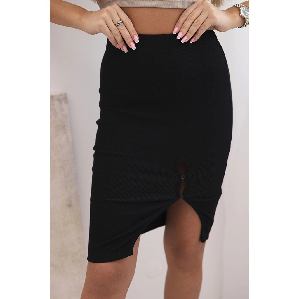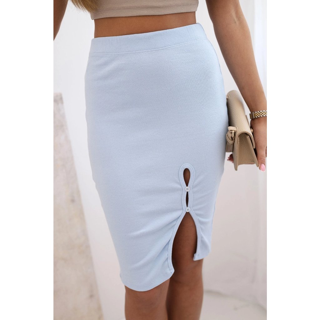 Tato dámská pruhovaná bavlněná sukně je výjimečně ženský model, který zdůrazňuje siluetu a díky elastickému úpletu se dokonale přizpůsobuje tělu. Subtilní rozparek na stehně zakončený ozdobnými knoflíky dodává stylizaci jemný, módní charakter. Ideální na léto, jaro a do každodenních stylizací — skvěle se kombinuje s topy, tričky a lehkými košilemi.