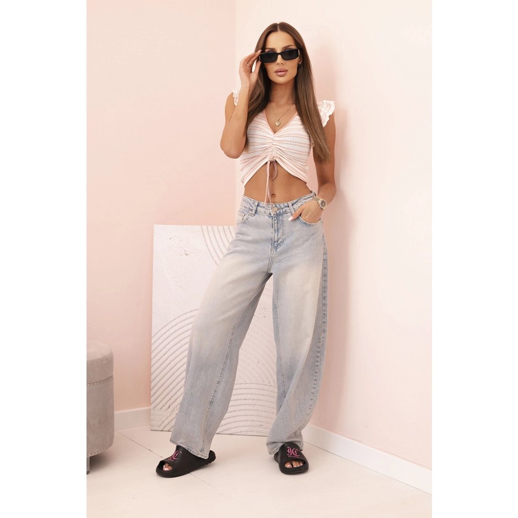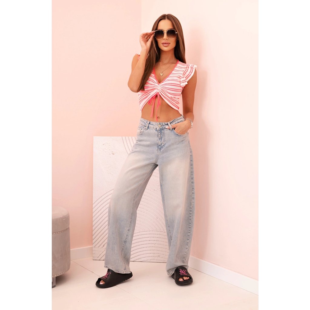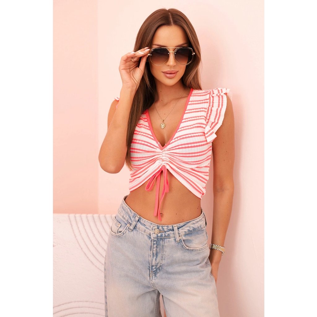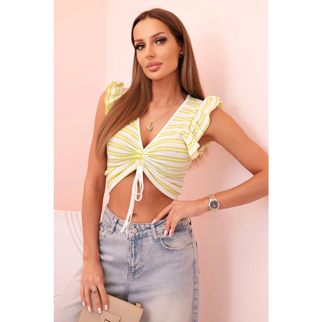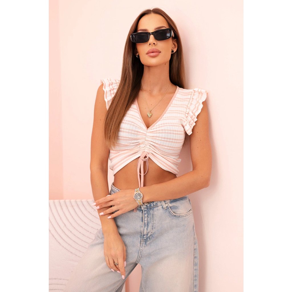 Roztomilá dámská blůzka z žebrované tkaniny je skvělou volbou na teplejší dny. Model s krátkým rukávem zakončeným ozdobnou volánkovou lemovkou a výstřihem do V podtrhuje ženskou siluetu a dodává dívčí kouzlo. Charakteristické nařasení vpředu s vázáním umožňuje jemně regulovat délku, přizpůsobující střih vaší postavě.