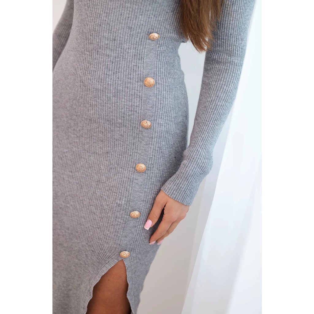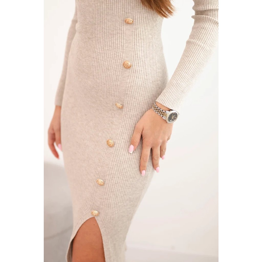 Tento elegantní dámský šaty jsou ideální volbou na chladnější dny! Vyrobené z elastického, pruhovaného materiálu, krásně se přizpůsobí postavě a zvýrazňuje ženské tvary. Šaty mají módní rolák, který zajišťuje pohodlí a teplo, a ozdobné zlaté knoflíky na boku, které dodávají výjimečný charakter. Midi délka a jemný rozparek na spodní části dělají tento model jak stylovým, tak pohodlným.