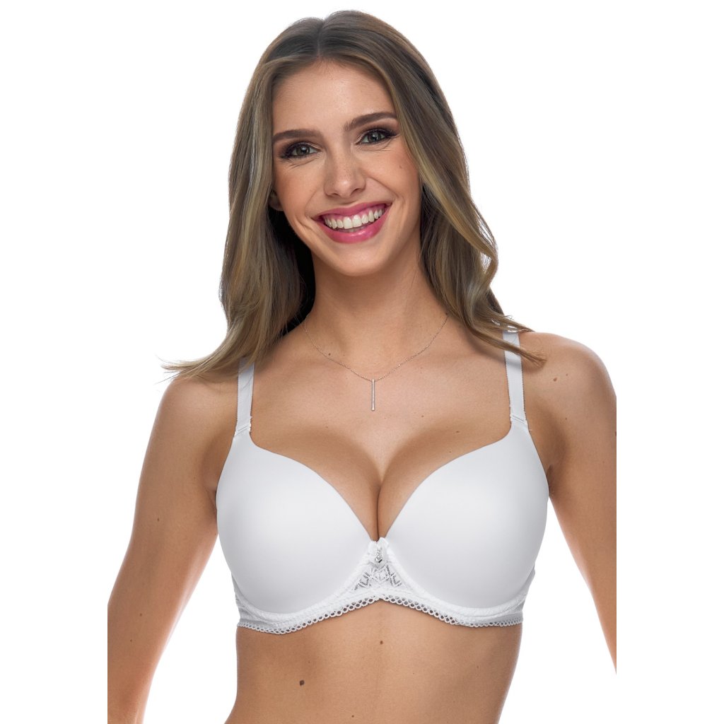 Dámská push up podprsenka značky Fantasy. Jemné a měkké košíčky s kosticemi jsou formovány do push up efektu pomocí měkké pěnové výplně, vytvarují Vám krásný a plný dekolt. Ramínka jsou lehce délkově nastavitelná, dají se oddělit. Mezi košíčky je stříbrná aplikace s blyštivým kamínkem. Dvojitě podšitý celokrajkový obvod je ukončen zapínáním na dva háčky a dvě pozice.