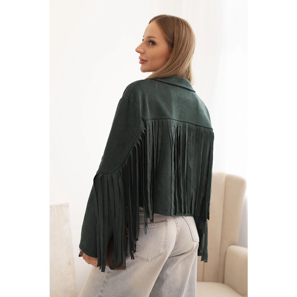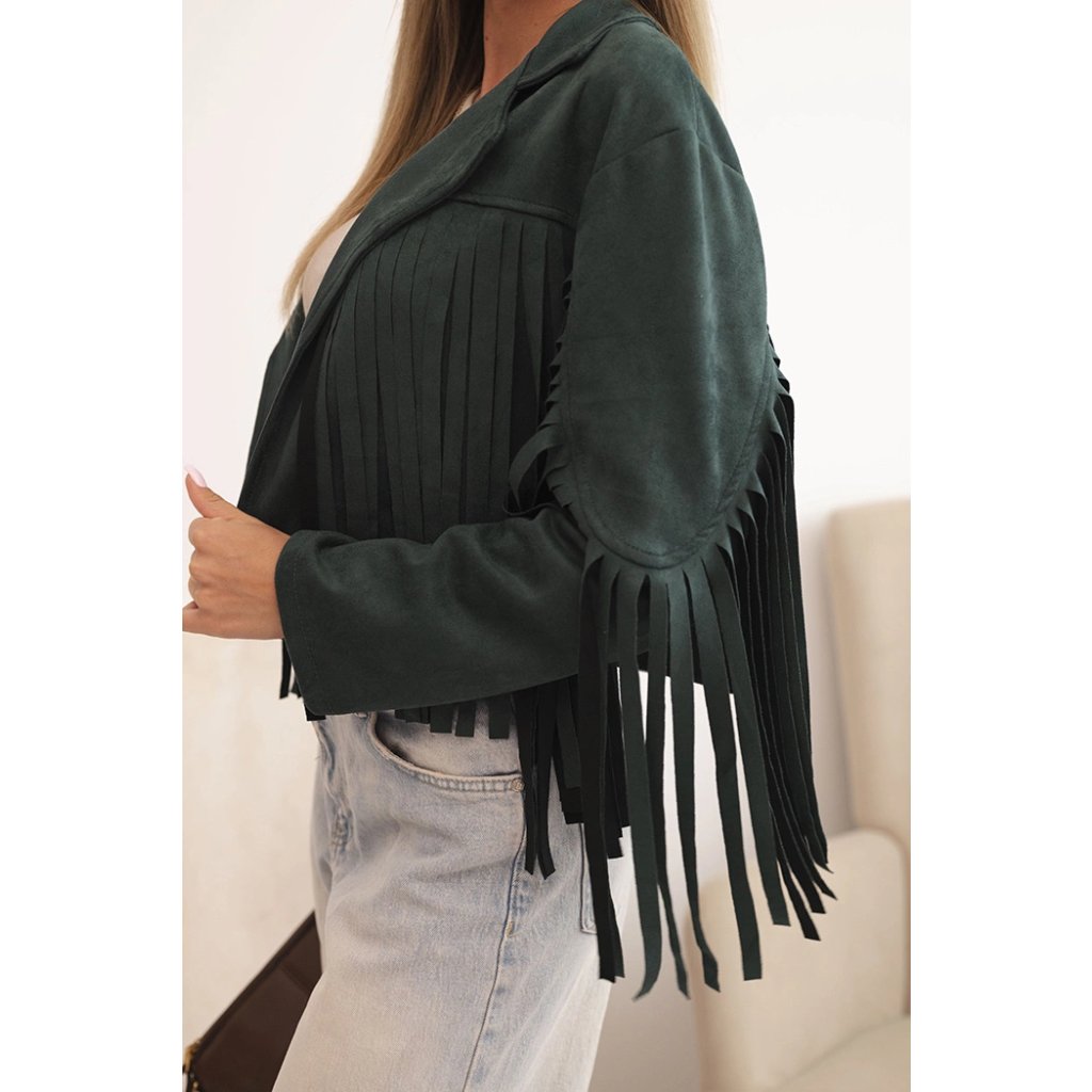 Dámská bunda s třásněmi je výjimečný model, který přitahuje pohledy a dodává outfitu charakter. Vyrobena z měkkého materiálu připomínajícího semiš, dokonale zapadá do nejnovějších boho a western trendů. Krátký střih krásně zdůrazňuje postavu a efektní třásně podél rukávů a přední části jí dodávají uvolněný a stylový vzhled. Skvěle se hodí jak na každodenní nošení, tak na festivaly či venkovní setkání. Tento model je skvělou volbou pro ženy, které si cení jedinečného stylu a pohodlí. Můžete ji nosit jak k džínům, tak k šatům, a vytvářet originální a módní outfity.Velikost je univerzální a bude vhodná pro dámy velikosti S, M nebo L.