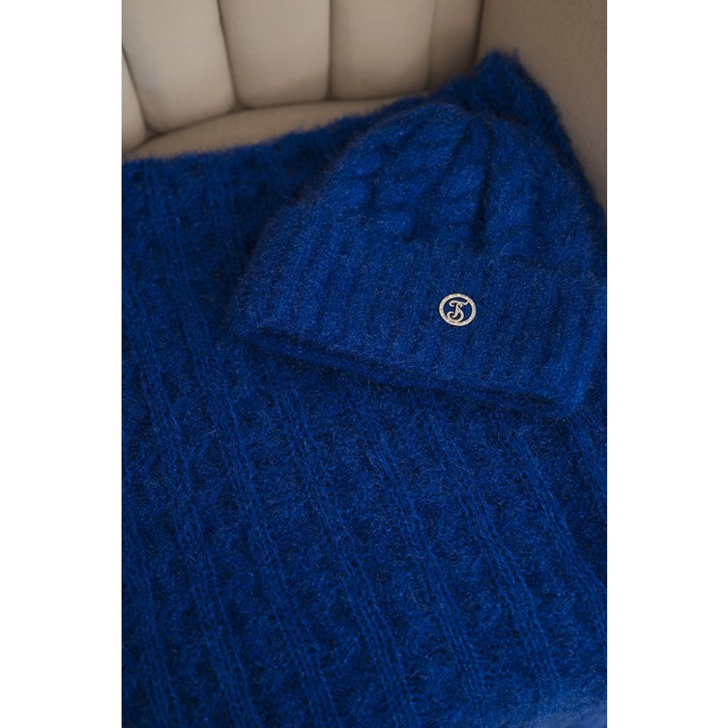 Čepice má klasický střih s módním ohrnutím a zlatou ozdobou vpředu, která dodává celku eleganci. Šála je dlouhá a široká – lze ji volně omotat kolem krku, což zajišťuje dodatečnou ochranu před zimou.