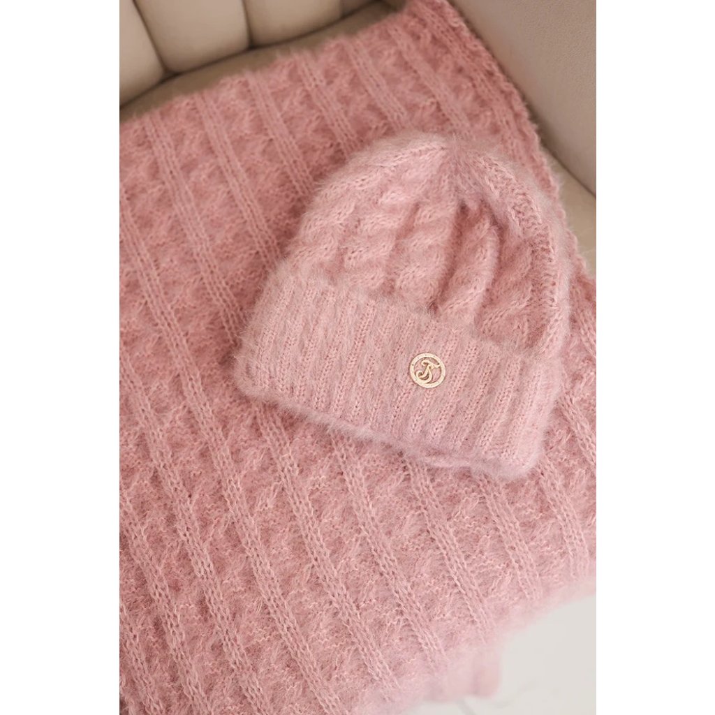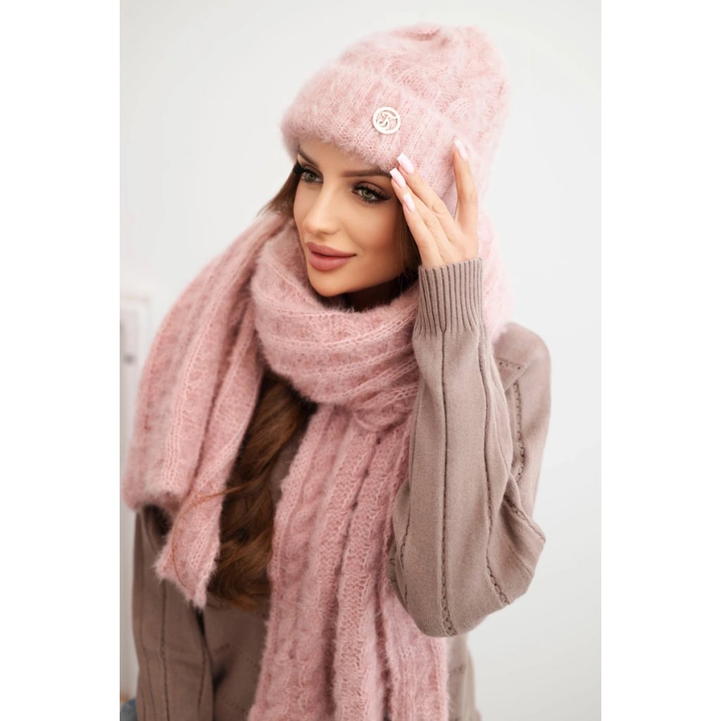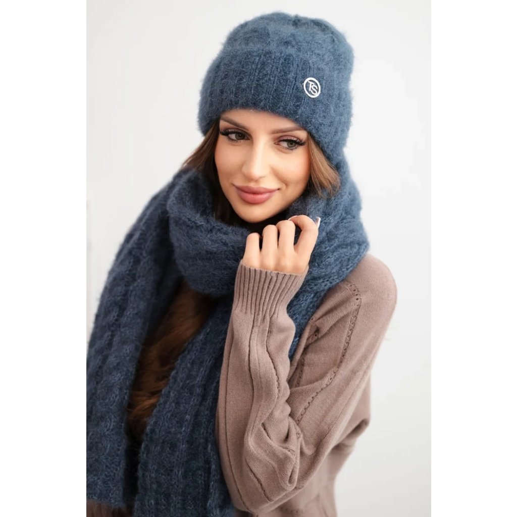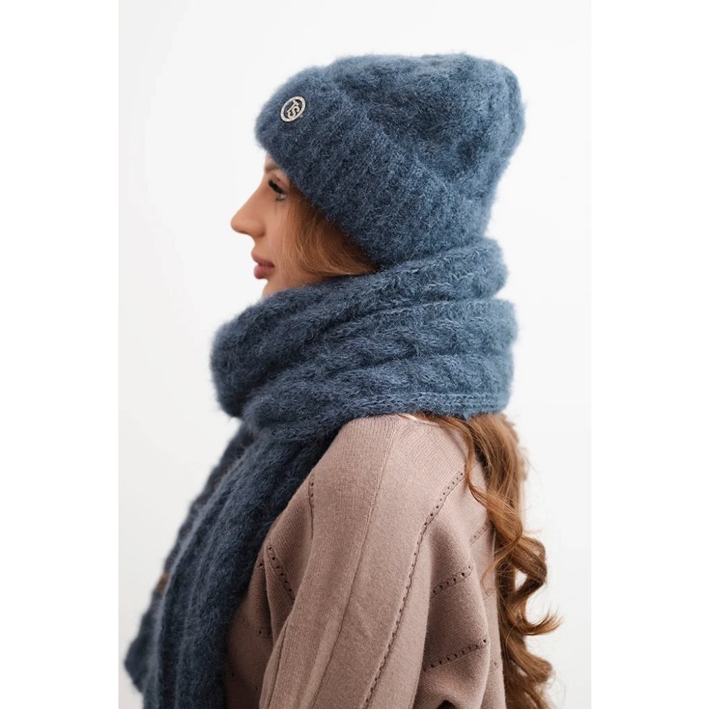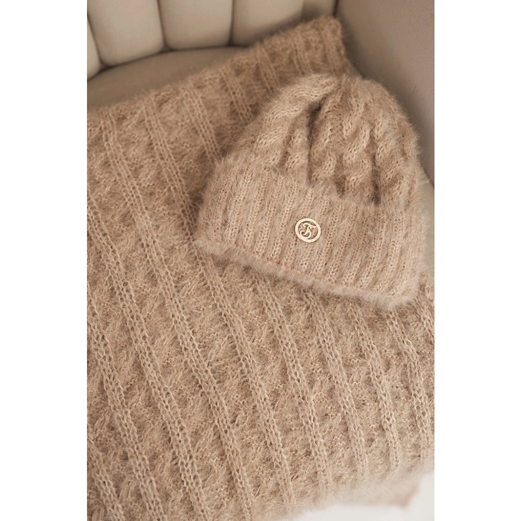 Čepice má klasický střih s módním ohrnutím a zlatou ozdobou vpředu, která dodává celku eleganci. Šála je dlouhá a široká – lze ji volně omotat kolem krku, což zajišťuje dodatečnou ochranu před zimou.