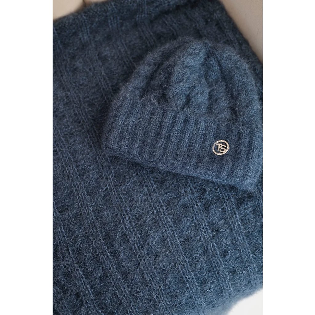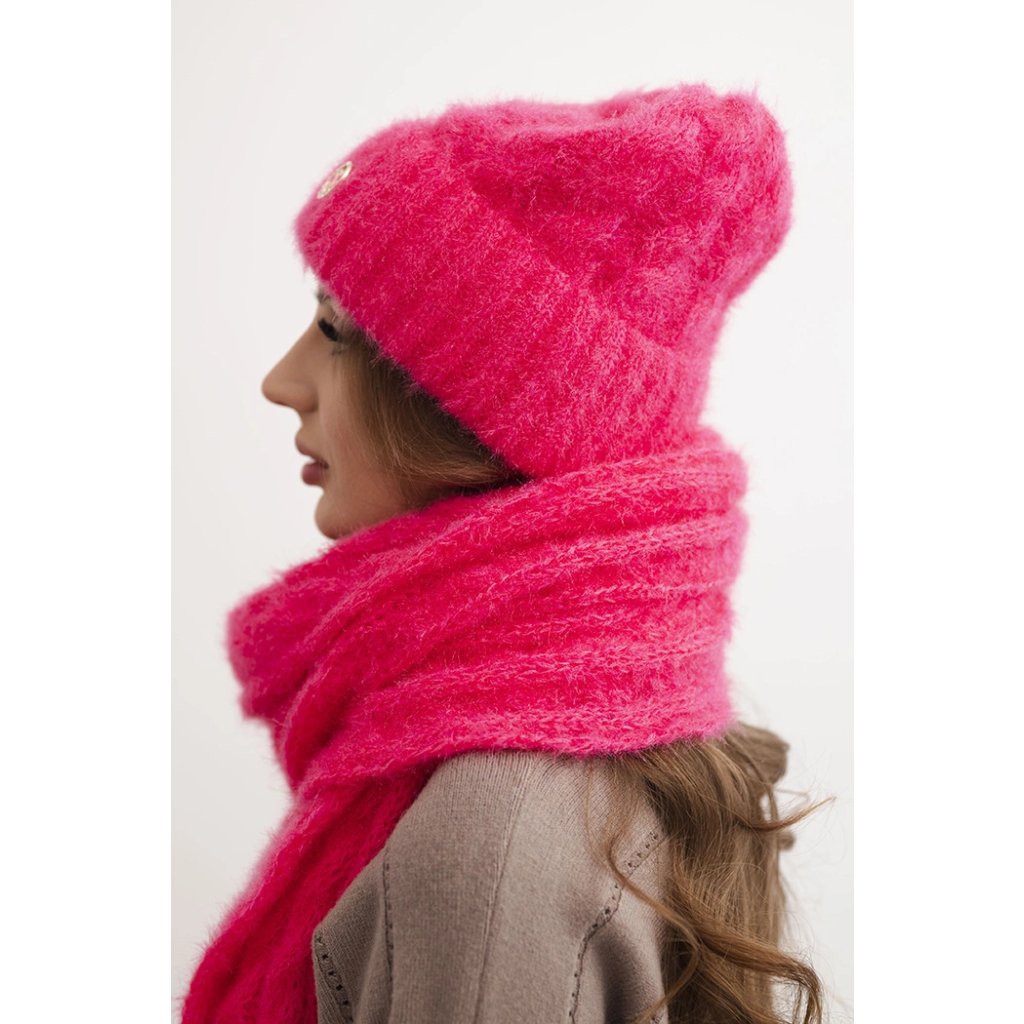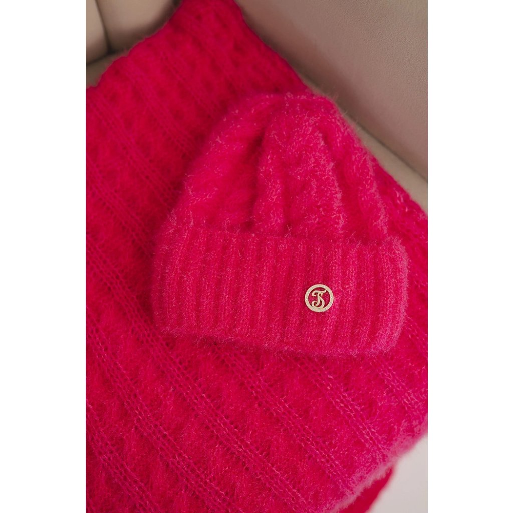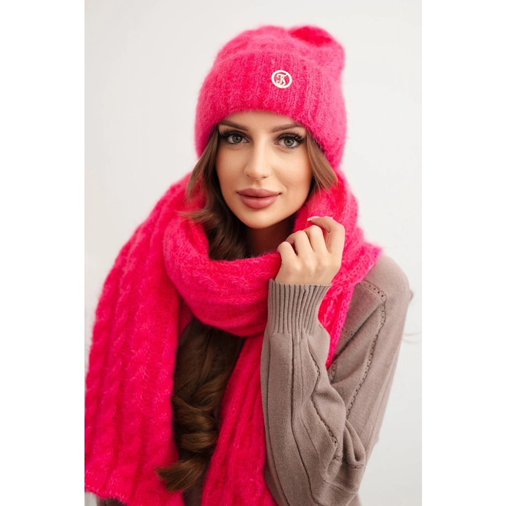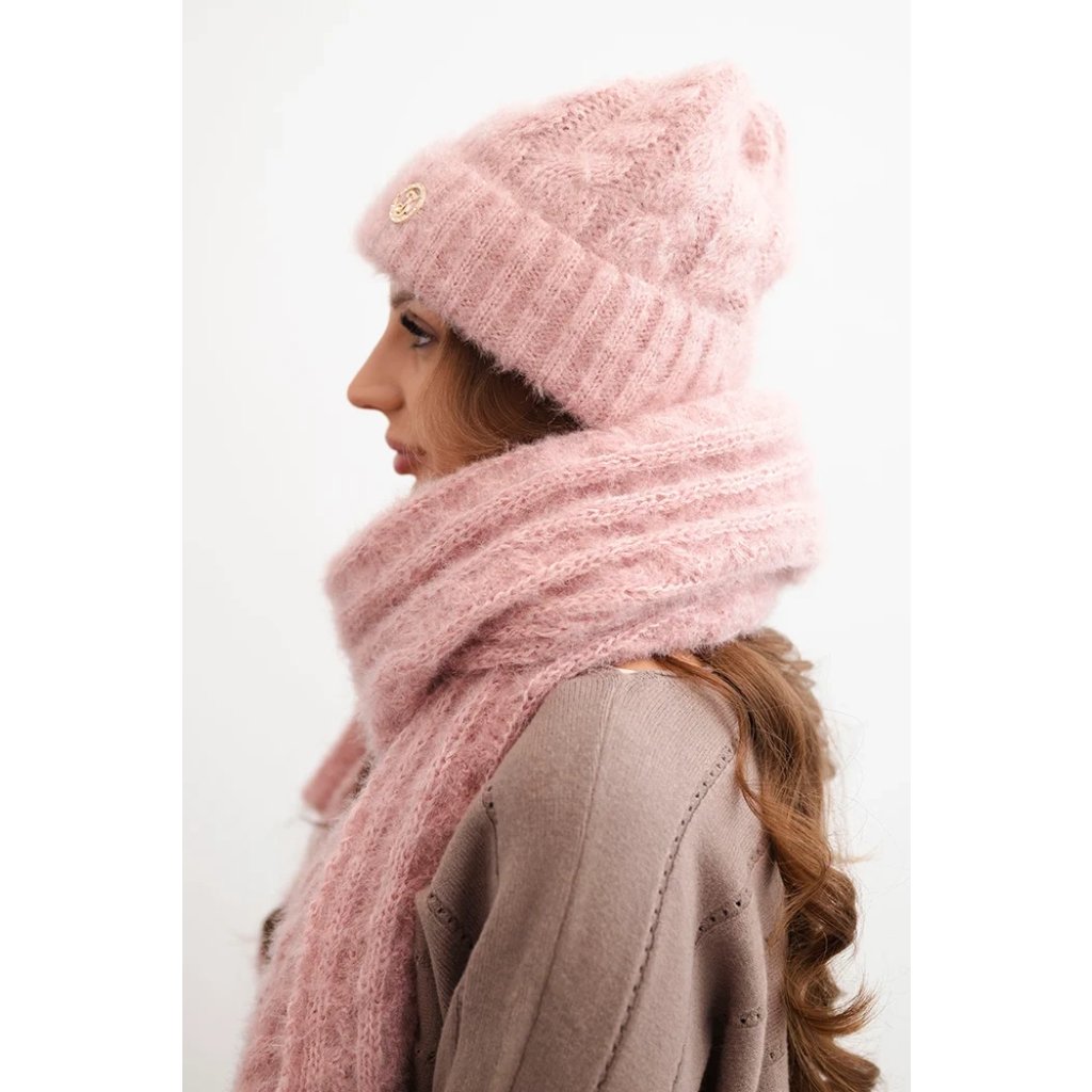 Čepice má klasický střih s módním ohrnutím a zlatou ozdobou vpředu, která dodává celku eleganci. Šála je dlouhá a široká – lze ji volně omotat kolem krku, což zajišťuje dodatečnou ochranu před zimou.