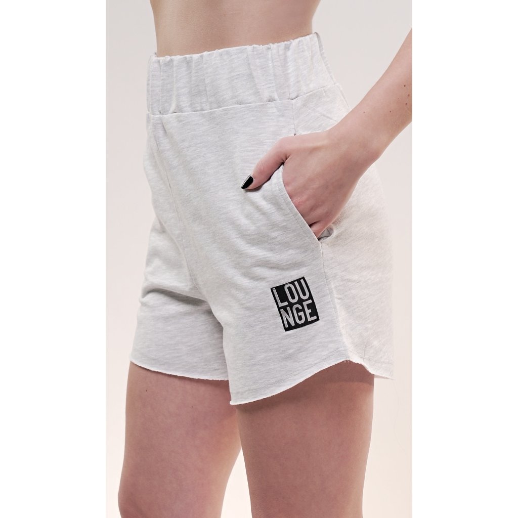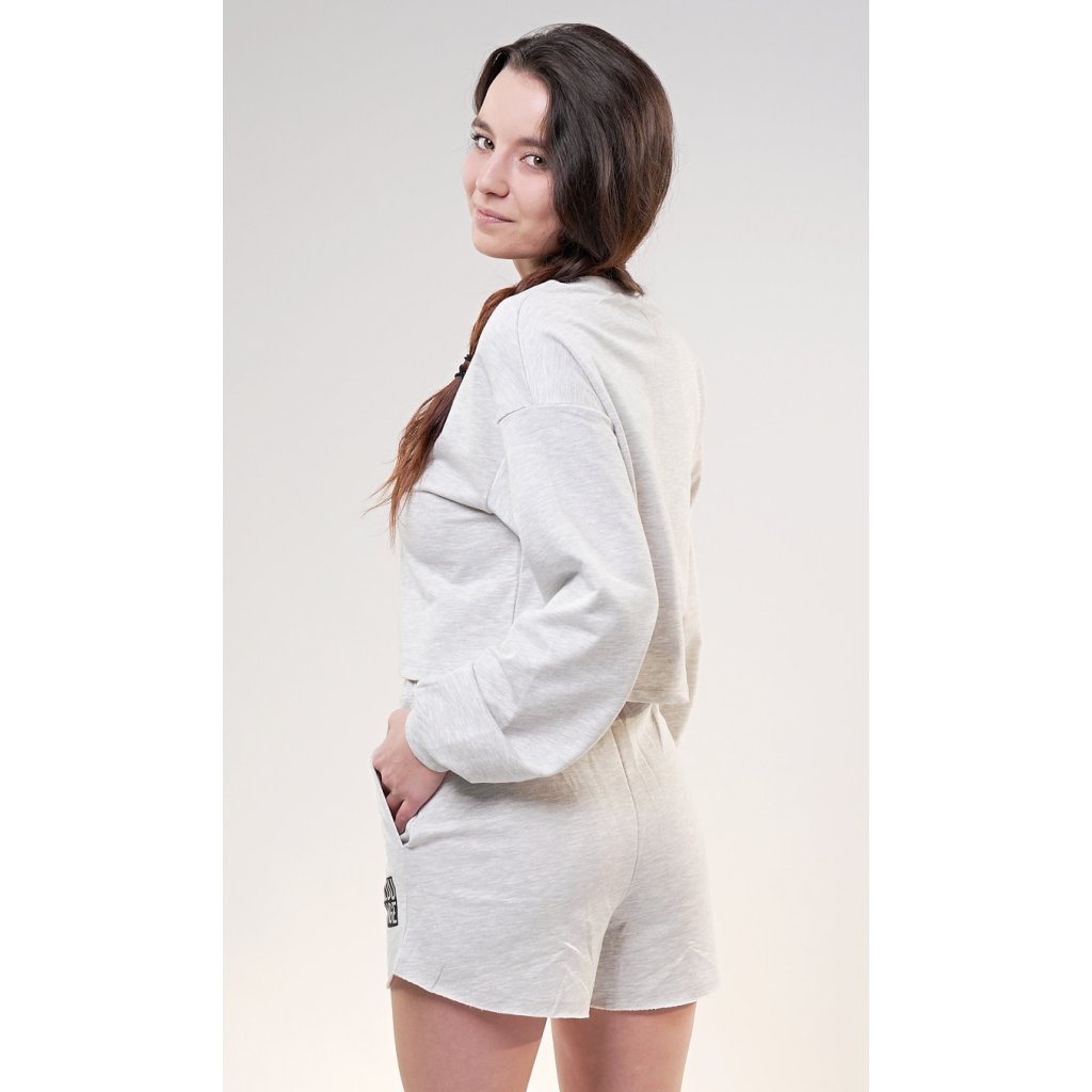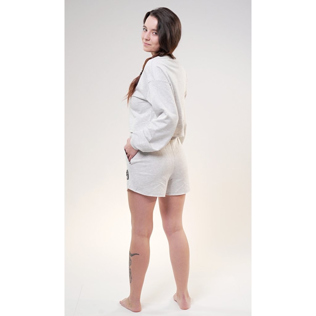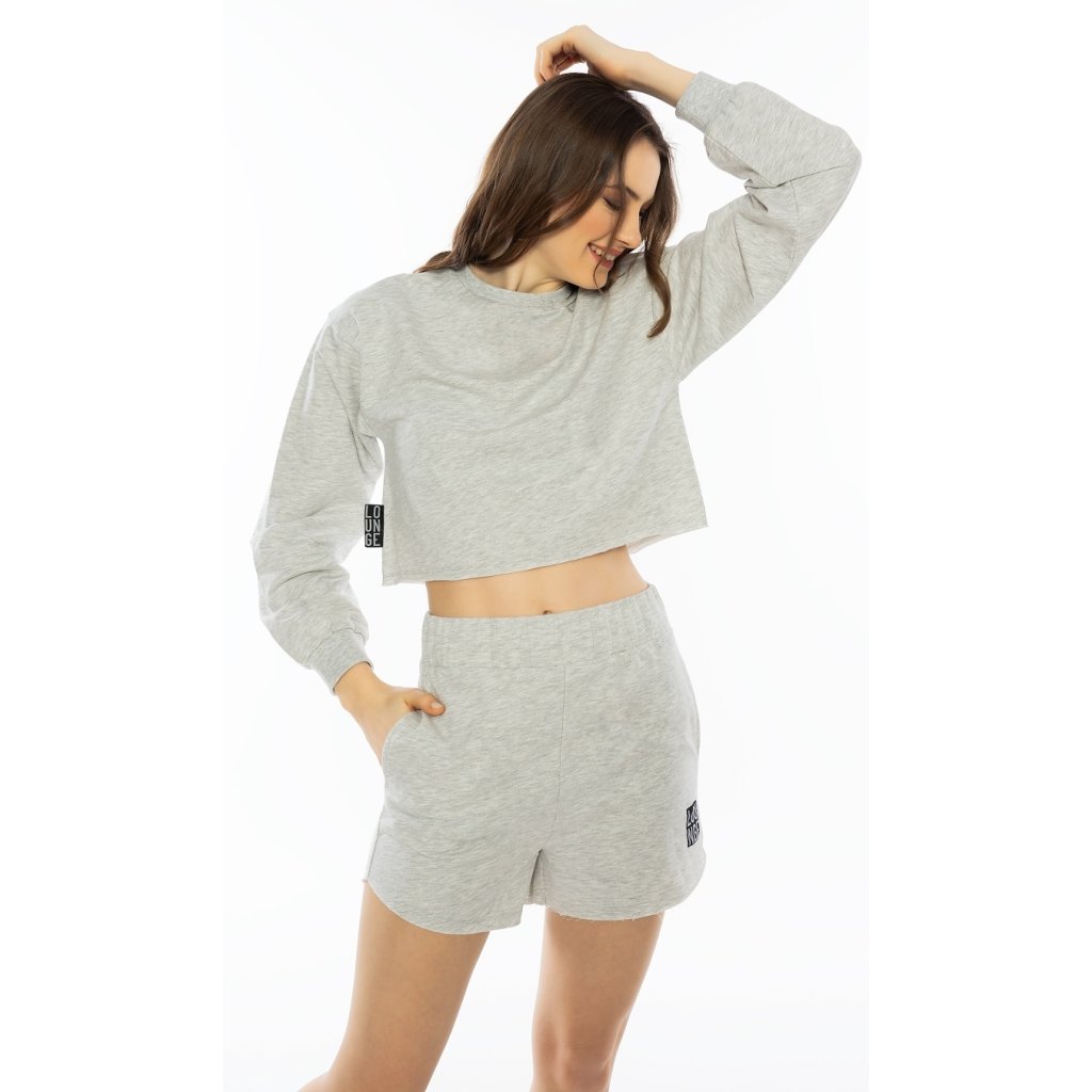 Dámská souprava Daniela. Dámská souprava se skládá z trička mikinového typu a šortkových kalhot. Světle šedá mikina má kulatý výstřih, rukávy zakončené panty a moderní zkrácenou délku. Je ozdobena černou nášivkou s nápisem Lounge. Krátké šortky se zvýšeným pasem mají praktické kapsy. Použitý materiál s vysokým obsahem bavlny je příjemný a poddajný na dotek. Souprava je pohodlná a využijete ji téměř při všech volnočasových aktivitách.
