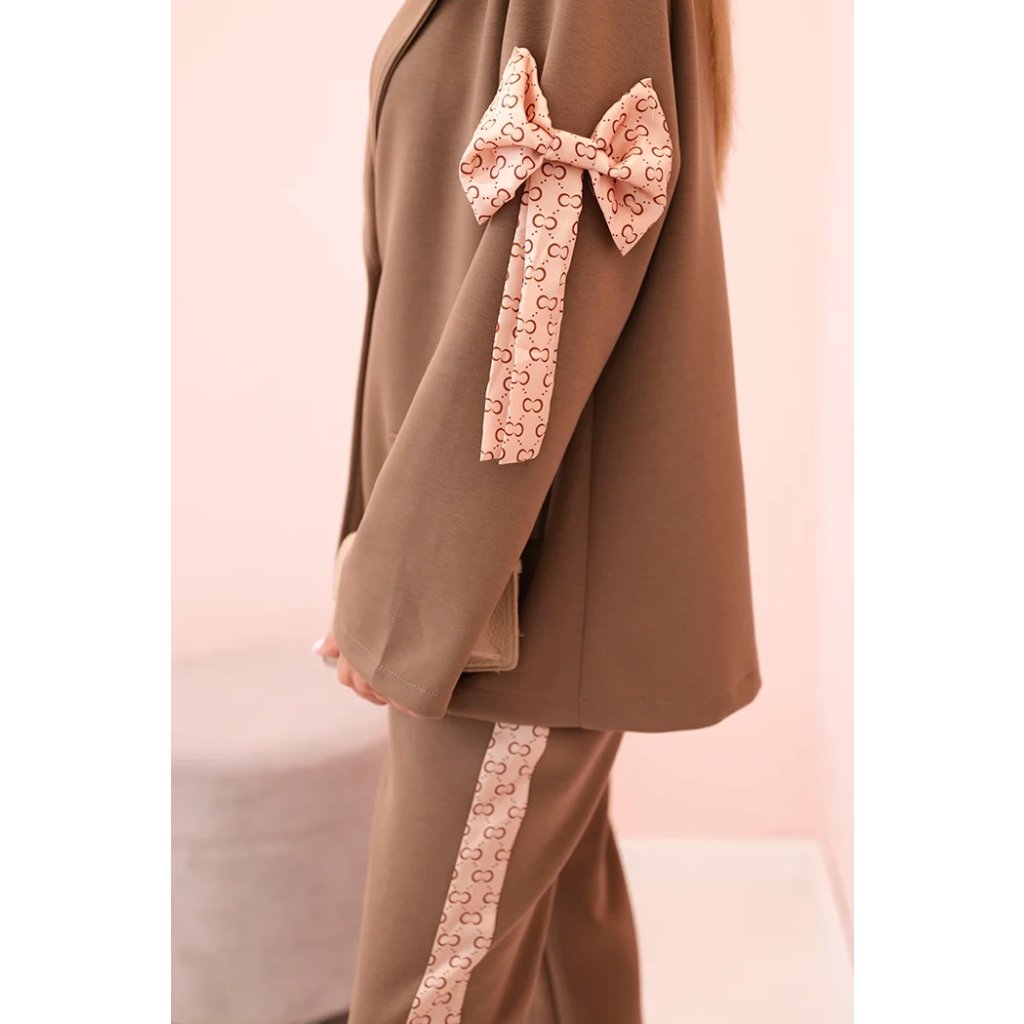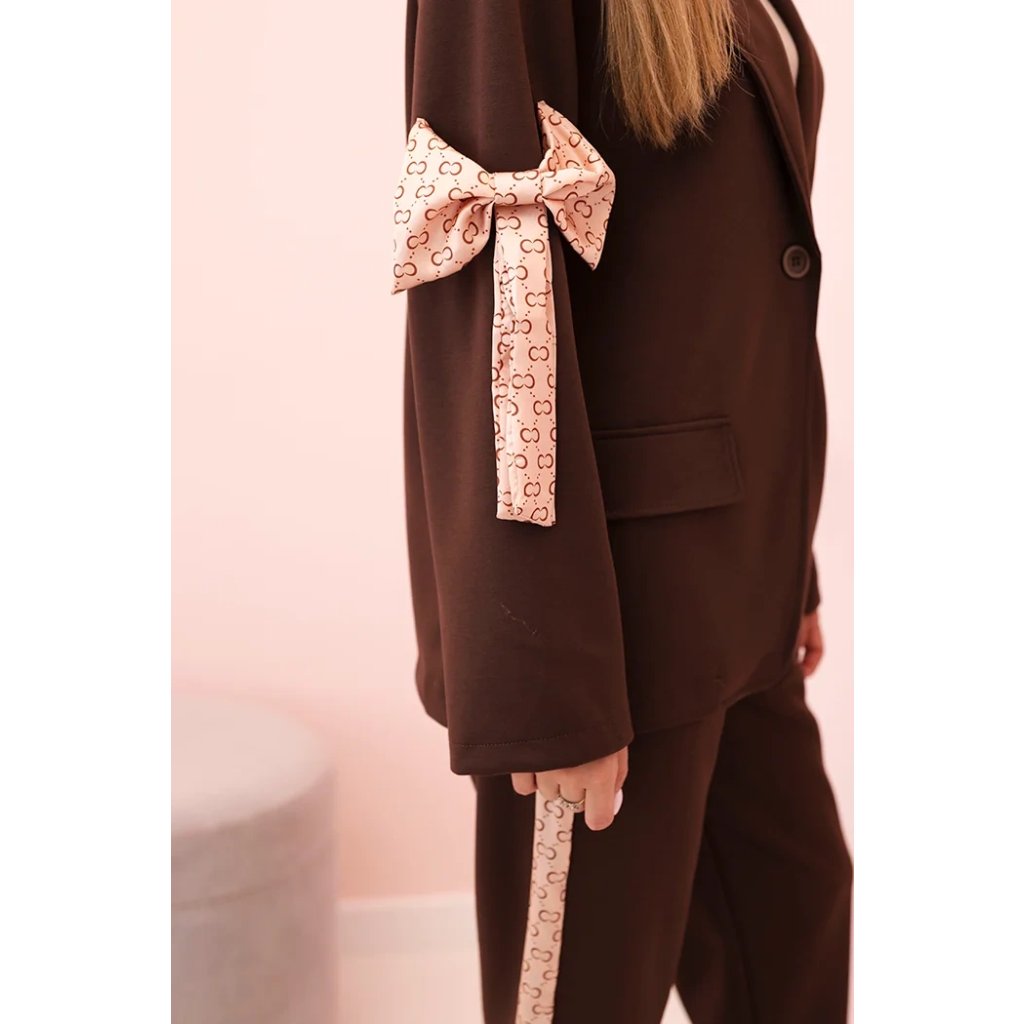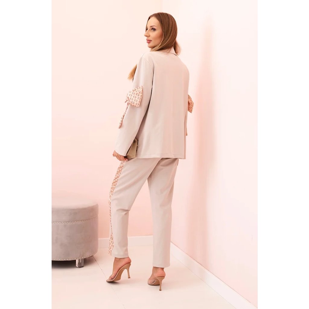 Stylový dámský komplet s blazerem a kalhotami je dokonalou kombinací elegance a pohodlí. Blazer klasického střihu s límcem a klopami krásně sedí na postavě, a dekorativní manžety s vzorovanou tkaninou dodávají originální charakter. Kalhoty s elastickým pasem a ozdobným lampasem podél nohavic skvěle zapadají do městských trendů a zajišťují pohodlí po celý den.