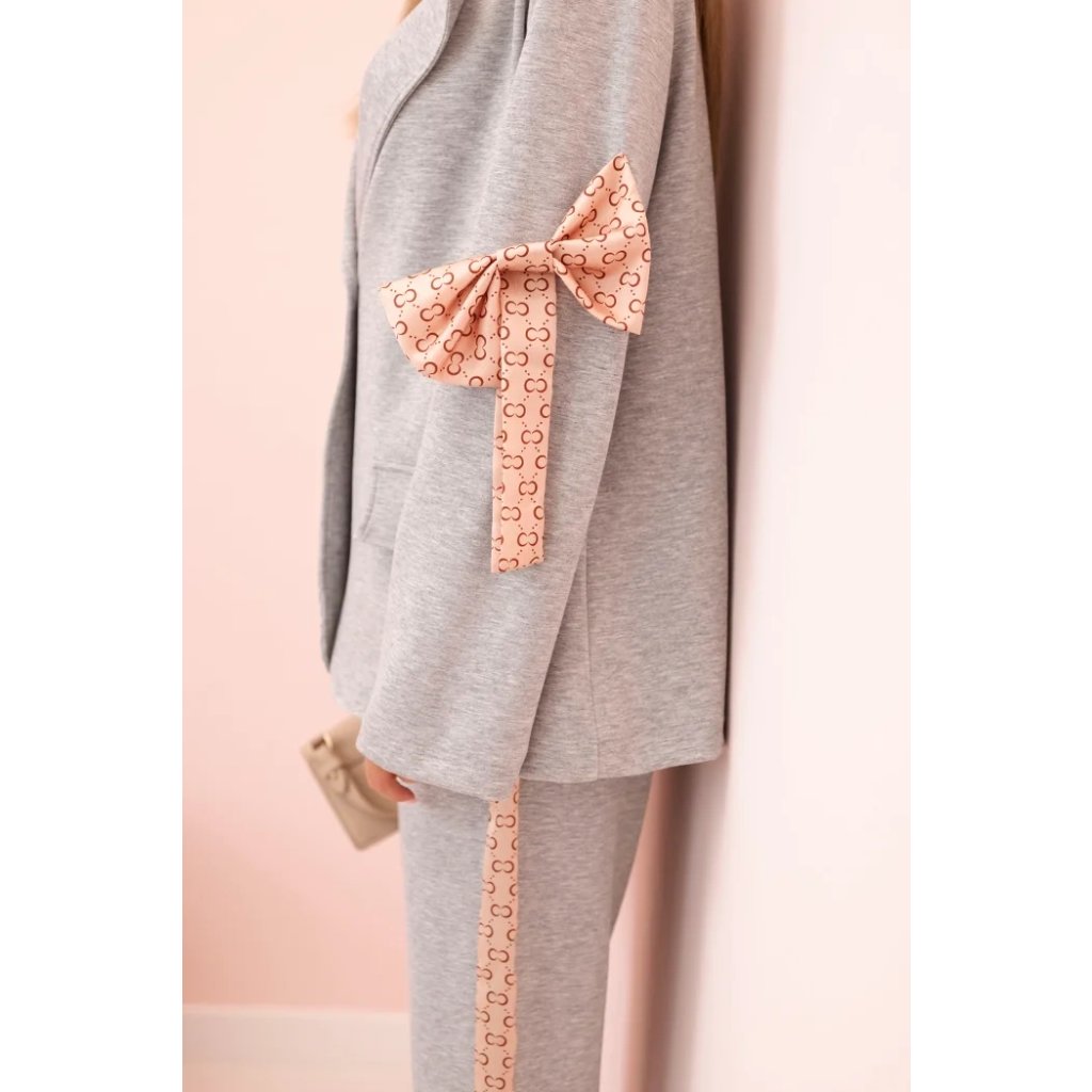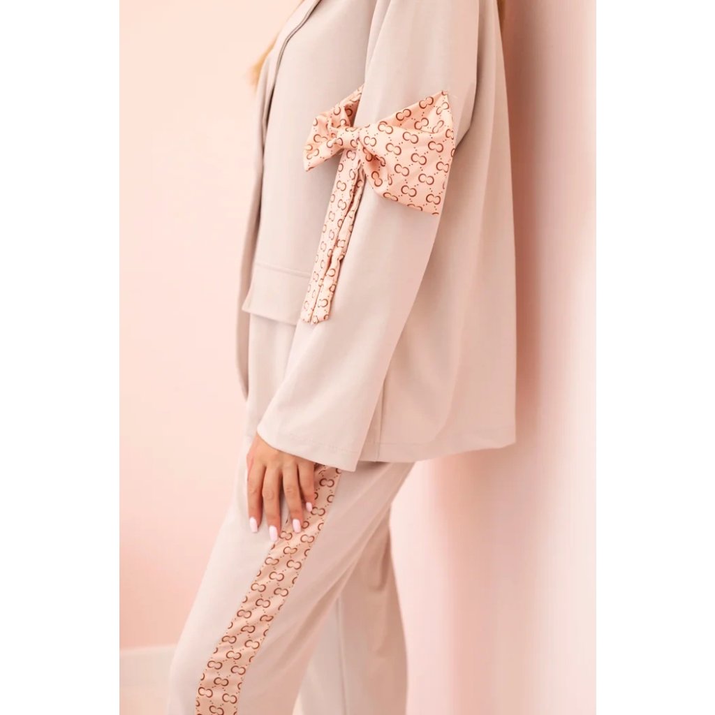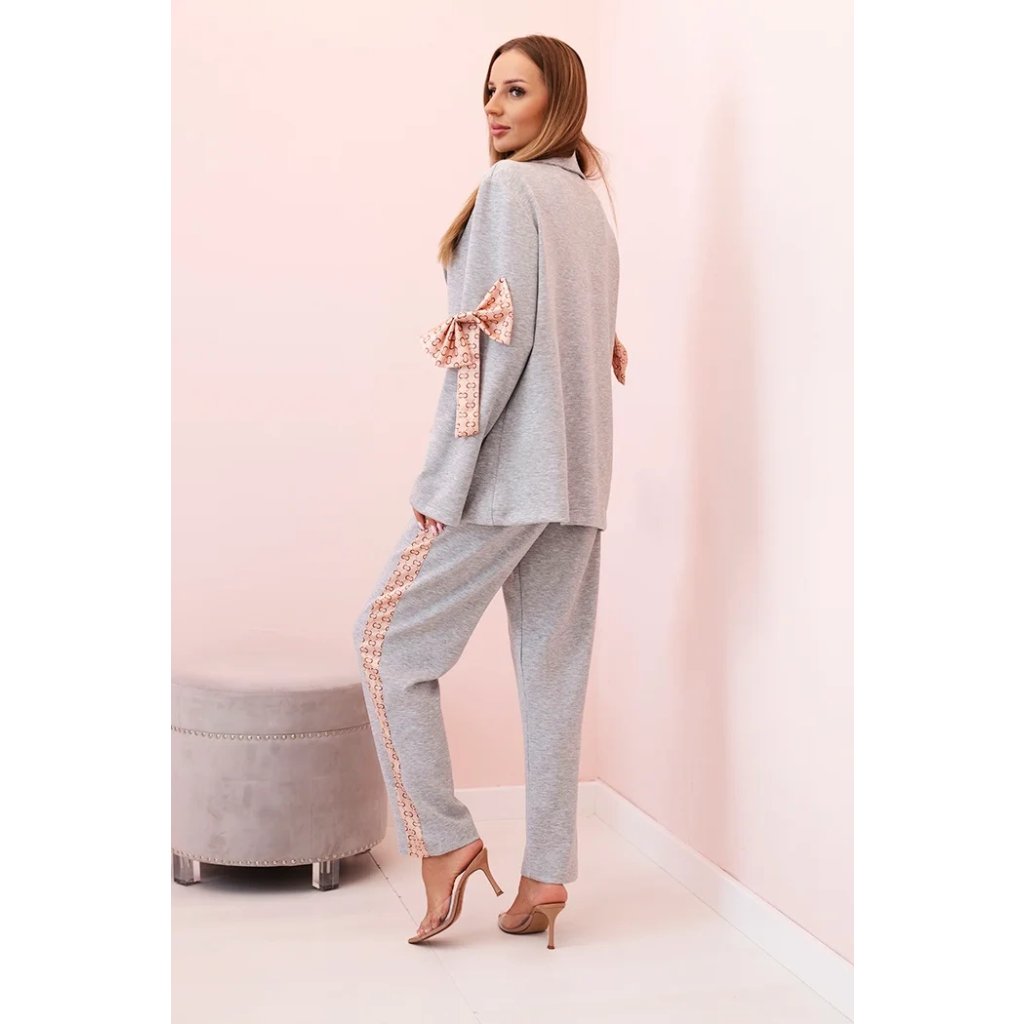 Stylový dámský komplet s blazerem a kalhotami je dokonalou kombinací elegance a pohodlí. Blazer klasického střihu s límcem a klopami krásně sedí na postavě, a dekorativní manžety s vzorovanou tkaninou dodávají originální charakter. Kalhoty s elastickým pasem a ozdobným lampasem podél nohavic skvěle zapadají do městských trendů a zajišťují pohodlí po celý den.