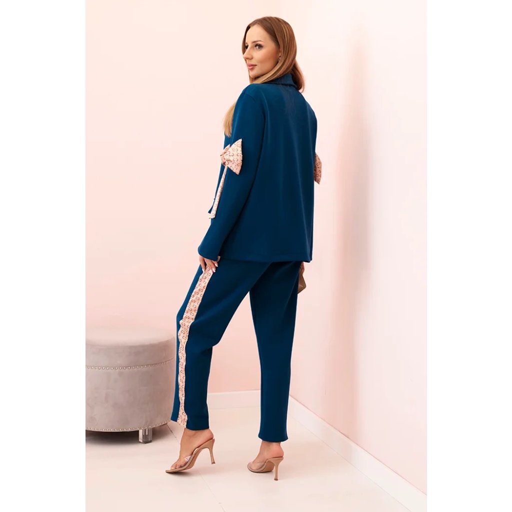 Stylový dámský komplet s blazerem a kalhotami je dokonalou kombinací elegance a pohodlí. Blazer klasického střihu s límcem a klopami krásně sedí na postavě, a dekorativní manžety s vzorovanou tkaninou dodávají originální charakter. Kalhoty s elastickým pasem a ozdobným lampasem podél nohavic skvěle zapadají do městských trendů a zajišťují pohodlí po celý den.