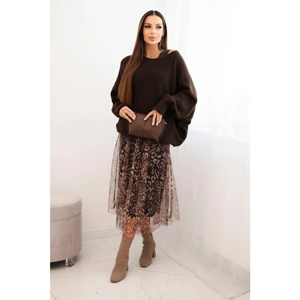 Stylový a ženský dámský komplet s měkkým svetrem a tylovými šaty je návrh, který se ideálně hodí jak na každodenní nošení, tak na výjimečné příležitosti. Horní část soupravy tvoří příjemný svetr s volným, oversize střihem a dlouhým rukávem, který zajišťuje komfort a módní zakončení stylizace. Spodní část tvoří lehké šaty s jemným tylem zdobeným subtilním zvířecím vzorem – celek vypadá velmi žensky a elegantně.