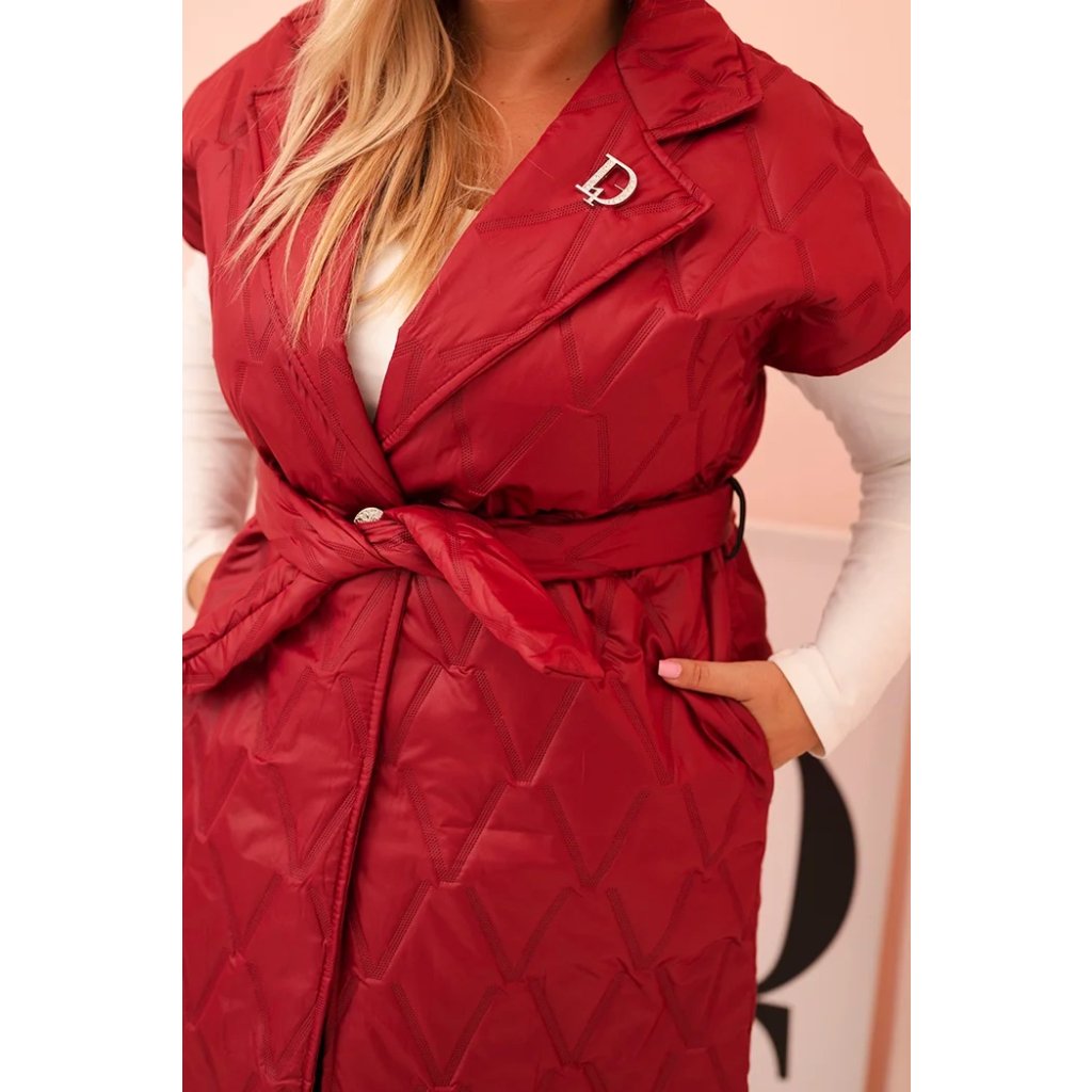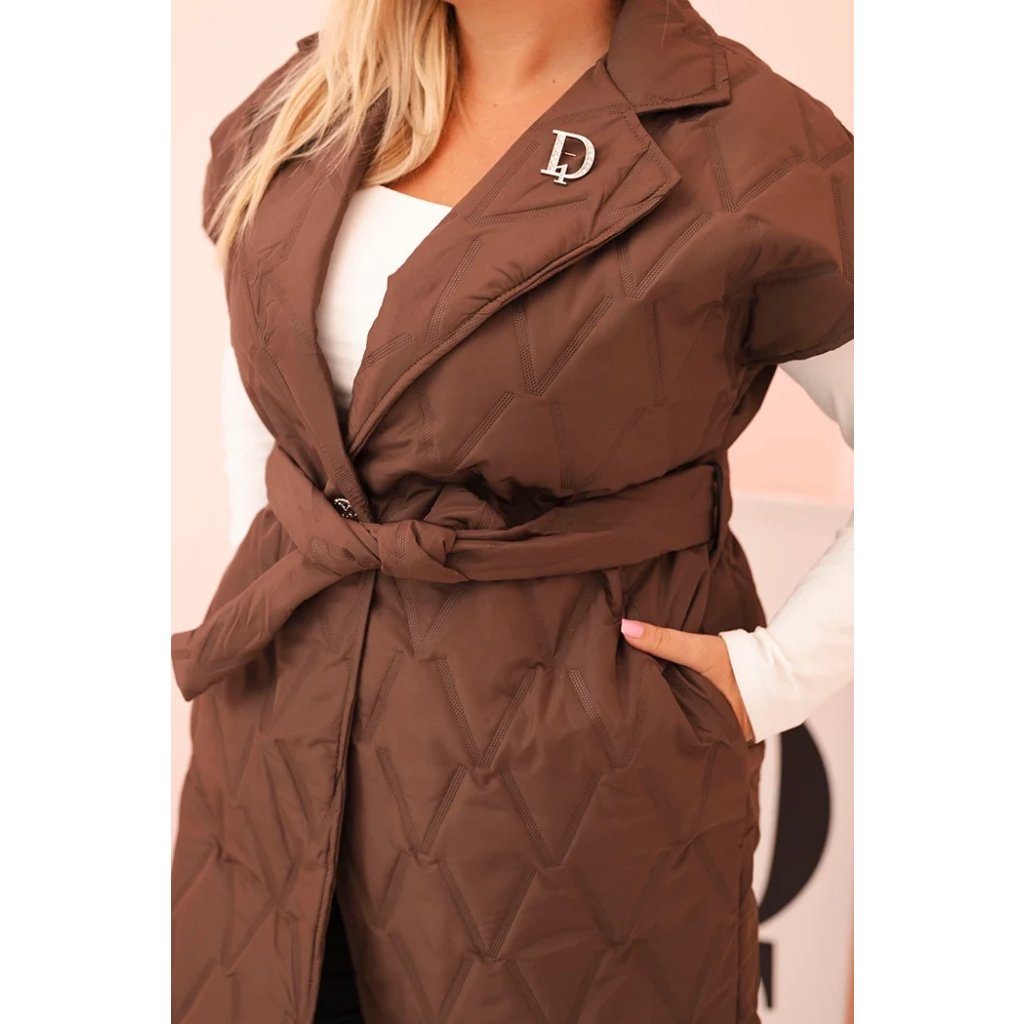 Stylová, prošívaná dámská vesta s páskem je nabídkou pro ženy, které si cení eleganci spojenou s pohodlím. Model s klasickým límcem a dekorativní broží „D” krásně zvýrazňuje siluetu díky přiloženému pásku, který lze regulovat v pase. Prošívaný materiál s geometrickým vzorem dodává celku moderní charakter a délka po kolena zajišťuje ochranu a komfort v chladnějších dnech.