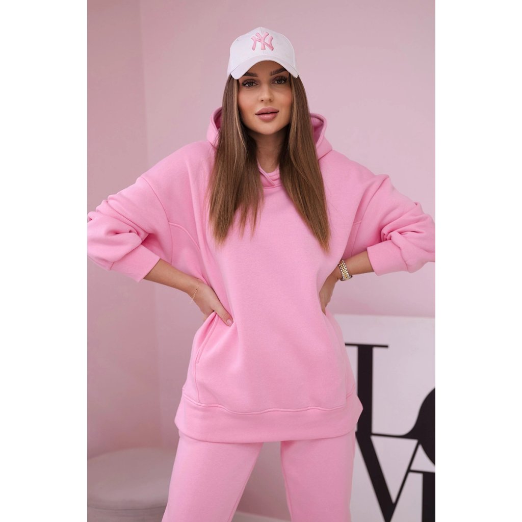 Představujeme vám sadu mikiny a kalhot. Mikina má kapuci a kapsy.