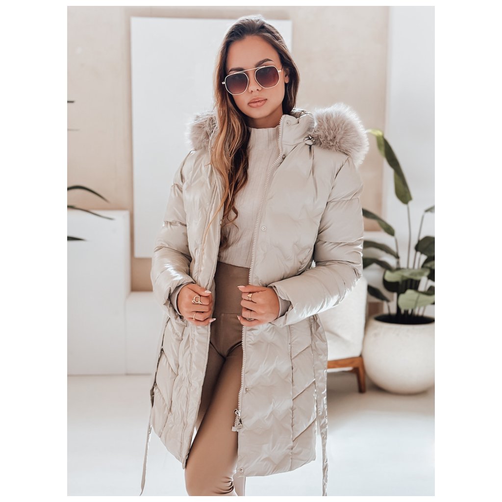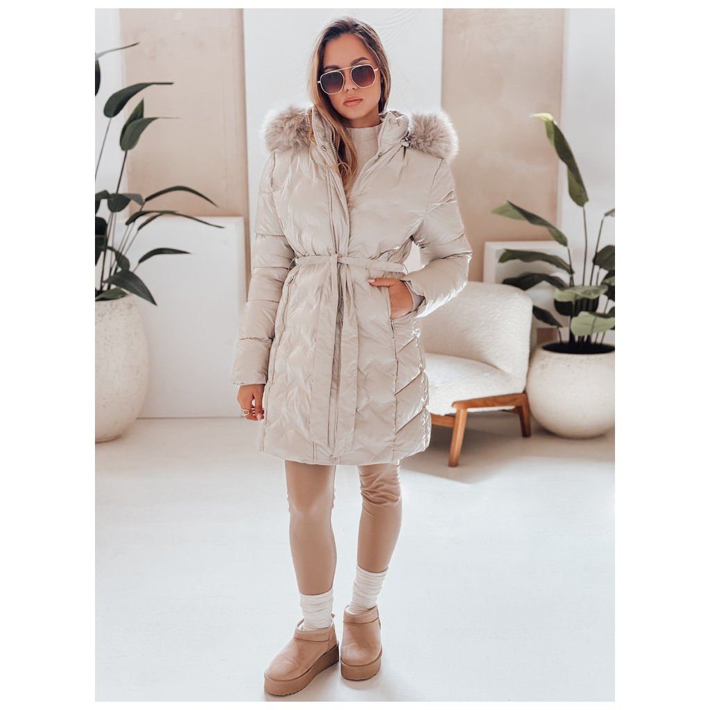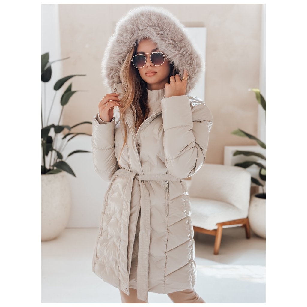 Dlouhá prošívaná zimní bunda se stahovacím páskem a kapucí lemovanou měkkou kožešinou. Poskytuje účinnou ochranu před chladem a větrem a zároveň vypadá stylově a žensky. Ideální pro chladnější dny, jak pro městské, tak i pro ležérní outfity.