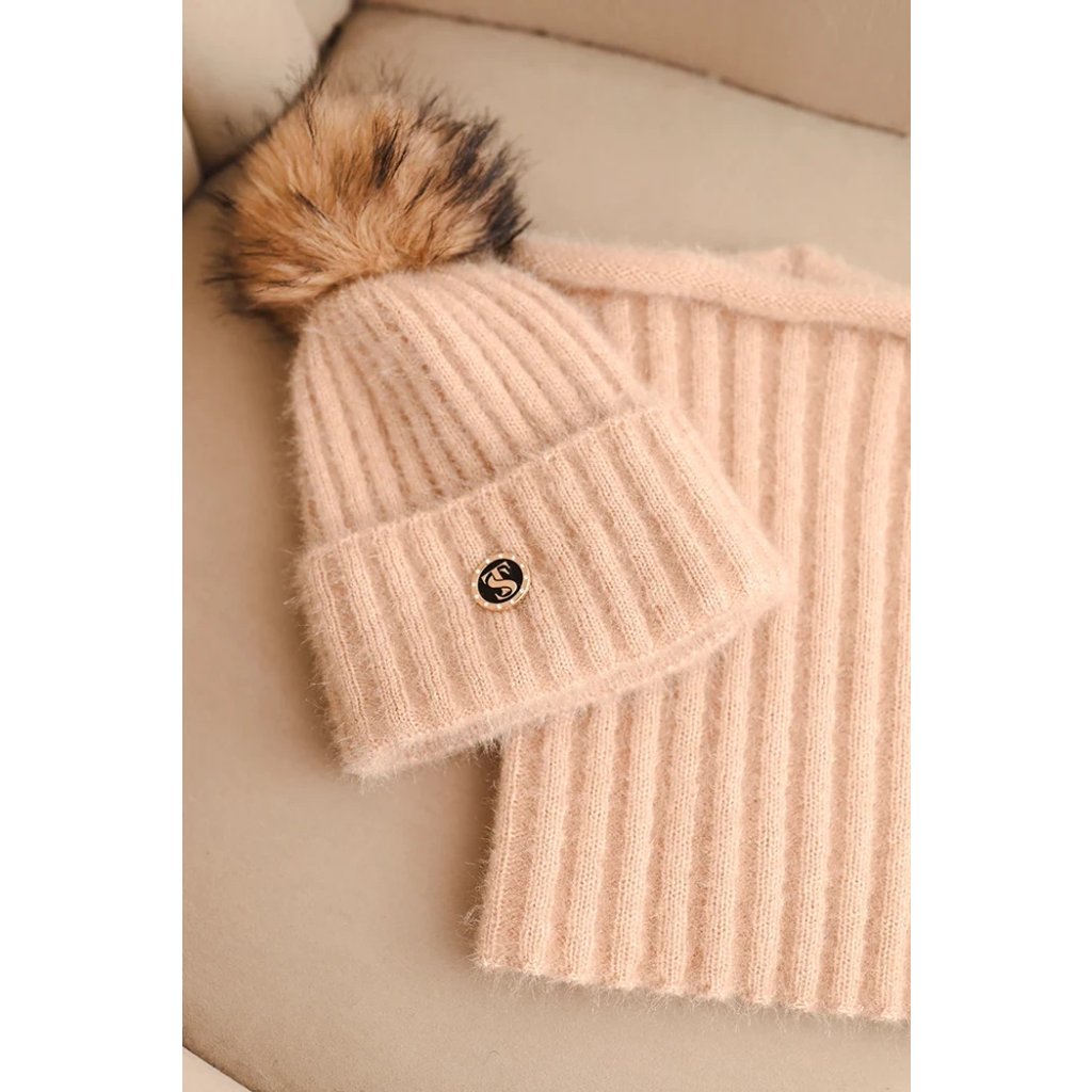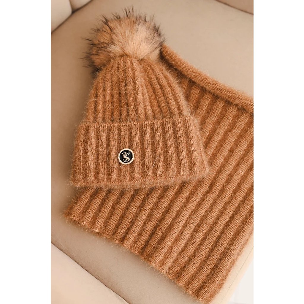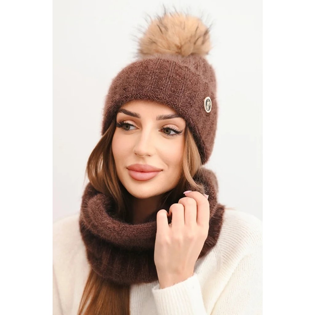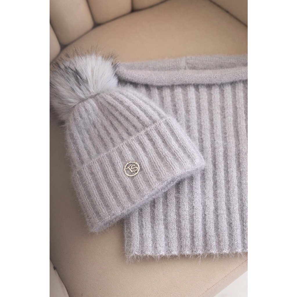 Stylový a praktický zimní set pro ženy – čepice s efektním velkým pomponem a měkký nákrčník. Vyrobeno z příjemného na dotek, nadýchaného úpletu s jemným leskem. Zajišťuje tepelný komfort a módní vzhled v chladných dnech.