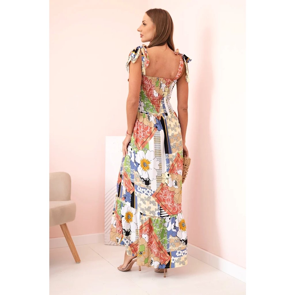 Výjimečné dámské maxi šaty se širokými zavazovacími ramínky jsou ideální volbou na slunečné dny! Zaujmou pestrým květinovým potiskem, který přitahuje pozornost a dodává letní nádech každému outfitu. Horní část šatů je zakončena elastickým řasením, díky čemuž se perfektně přizpůsobí postavě a zajišťuje pohodlí i skvělý vzhled. Dlouhá, volně splývající sukně dodává lehkost a krásně se pohybuje při chůzi. Skvělé na dovolenou, procházky po pláži, zahradní párty nebo letní setkání s přáteli.