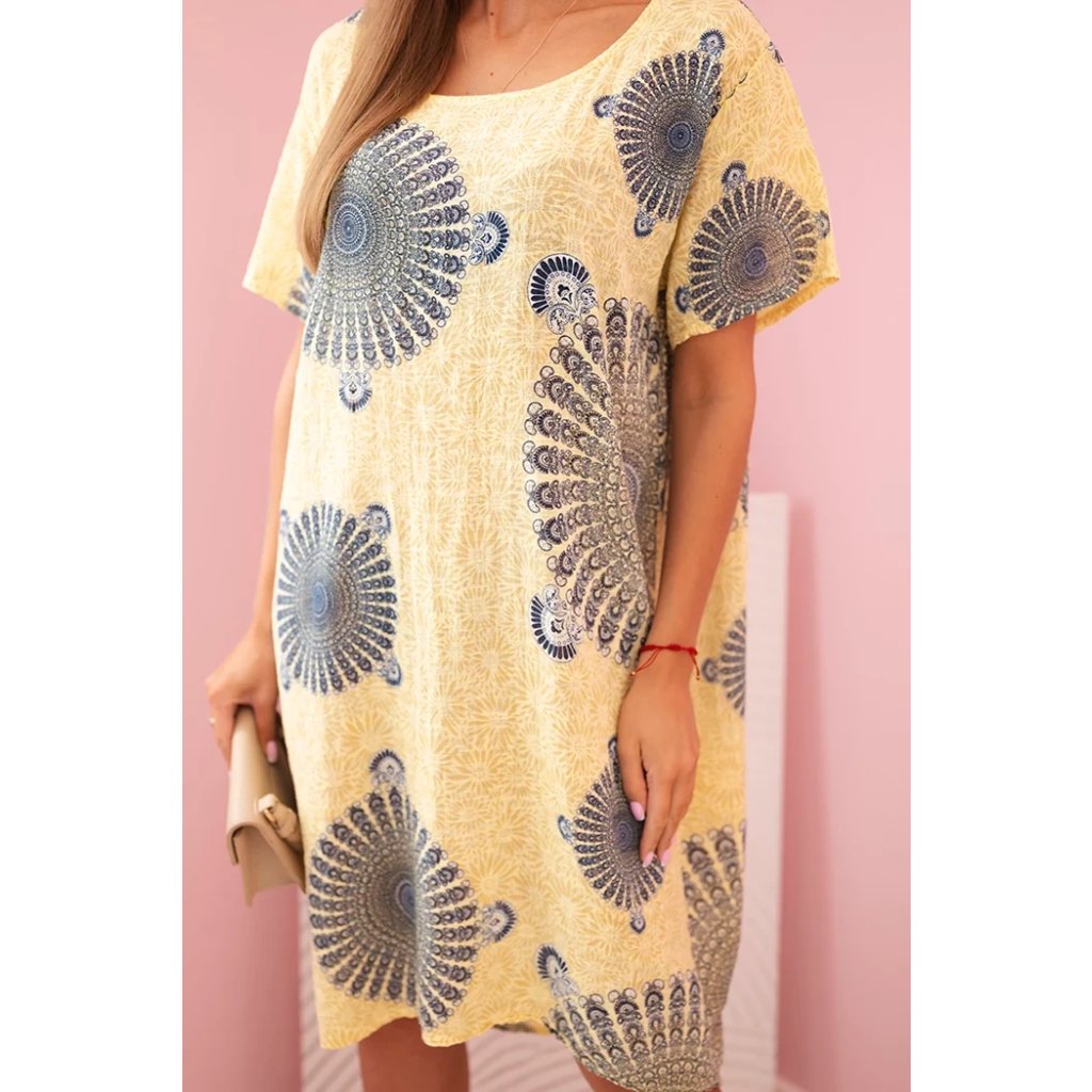 Dámské šaty s krátkým rukávem a efektním orientálním vzorem jsou ideální volbou na letní dny. Jsou ušité ze 100% přírodní bavlny, což zajišťuje výjimečné pohodlí a vynikající prodyšnost. Jejich volný střih krásně padne na postavu a asymetrický spodní lem dodává modelu lehkost a moderní vzhled. Skvělá volba pro každodenní nošení, procházky či letní dovolenou – spojují pohodlí a styl, který upoutá pozornost.