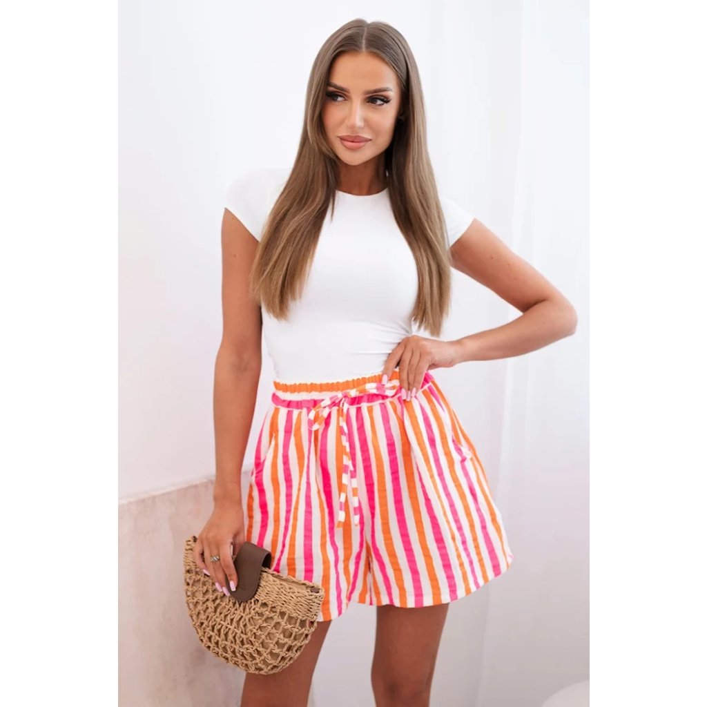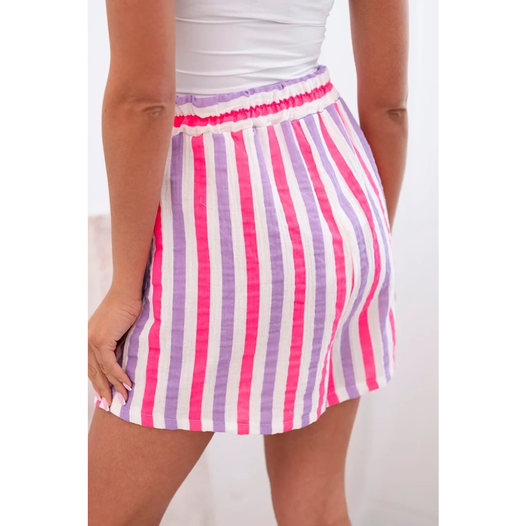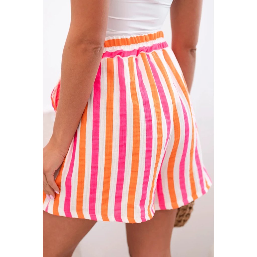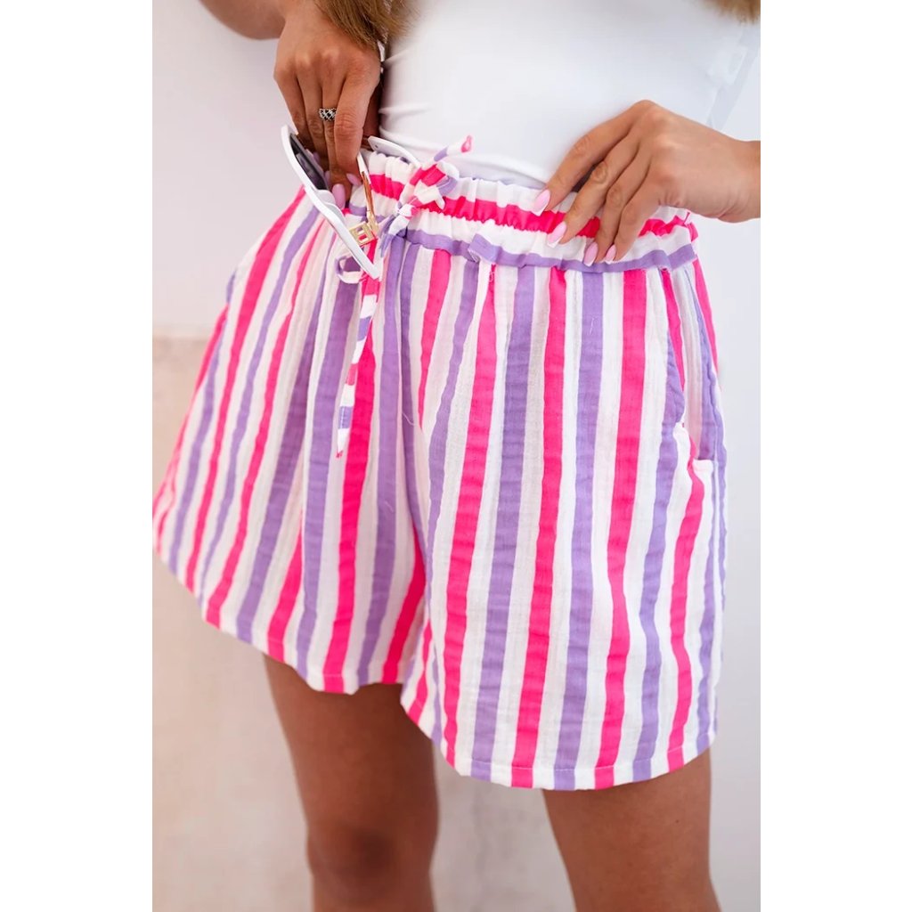 Dámské letní šortky s barevnými pruhy jsou ideální volbou pro teplé dny. Vyrobené z prodyšné 100% bavlny zaručují maximální pohodlí při nošení – bez ohledu na příležitost. Vysoký pas s elastickou gumou a ozdobným zavazováním v pase zajišťuje dokonalé přizpůsobení, volný střih neomezuje pohyb a dodává lehkost a volnost. Model se skvěle hodí jak na dovolenou, tak na každodenní procházky nebo setkání s přáteli. Intenzivní barvy a svislé pruhy opticky zeštíhlují postavu a boční kapsy zvyšují praktičnost. Je to must-have v letním šatníku každé ženy! Velikost je univerzální a hodí se pro ženy velikosti S, M nebo L.