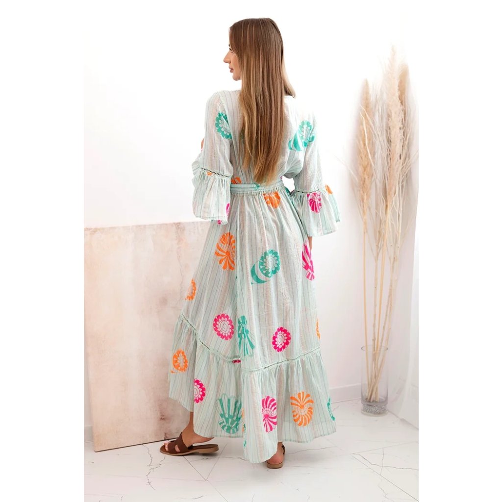Dámská přehozená halenka ve stylu boho je ideálním doplňkem letních outfitů. Vyrobena ze 100% prodyšné bavlny, zaujme nejen pohodlím, ale i originálním designem. Hluboký výstřih do V zdobený krajkou a dekorativními detaily dodává půvab a ženský charakter. Zavazování v pase ozdobnou šňůrkou s třásněmi umožňuje přizpůsobení postavě a zvýraznění jejích předností. Volný střih s rozšířenými 3/4 rukávy působí velmi lehce a stylově. Barevné, etnické vzory dodávají celku prázdninovou atmosféru – ideální na pláž, přes plavky, na letní procházky nebo jako stylový doplněk ke každodennímu outfitu. Velikost je univerzální a vhodná pro ženy velikostí S, M nebo L.