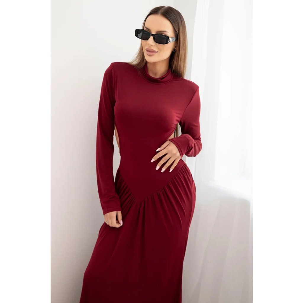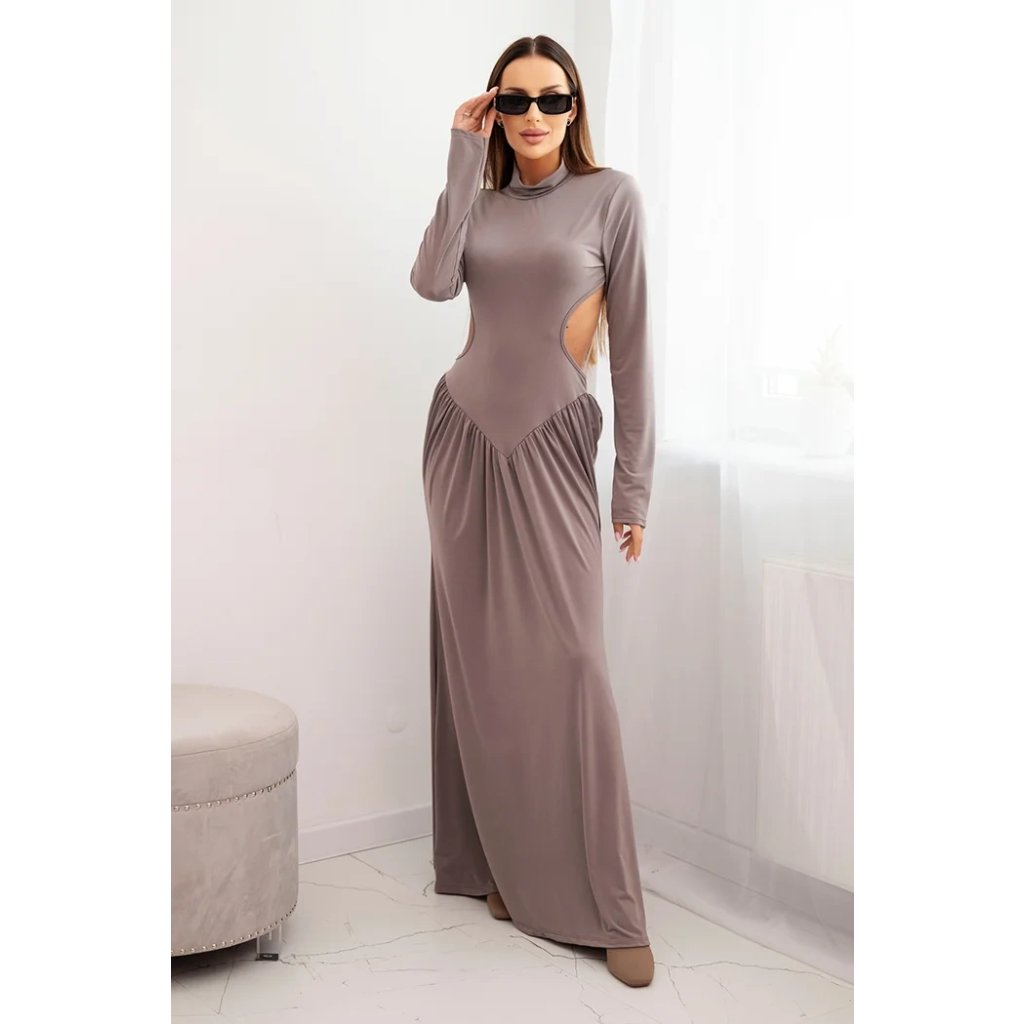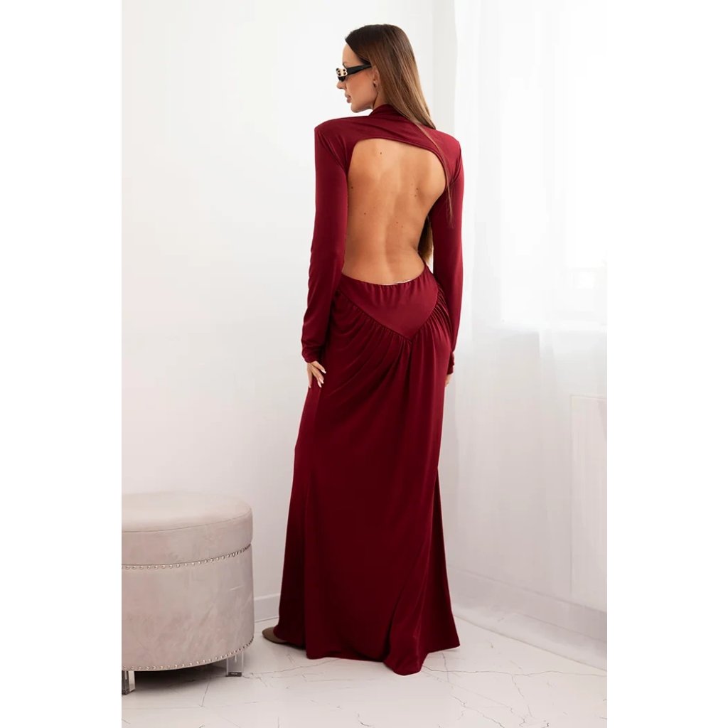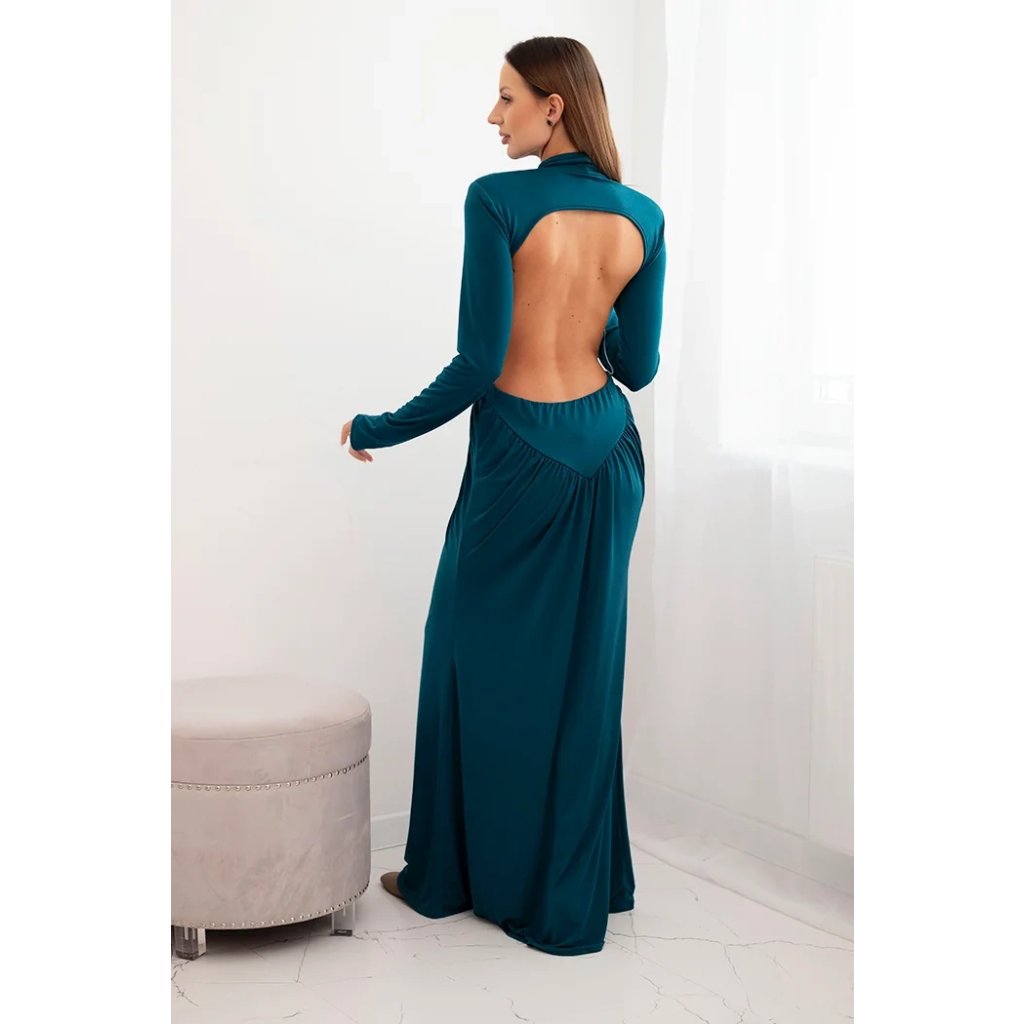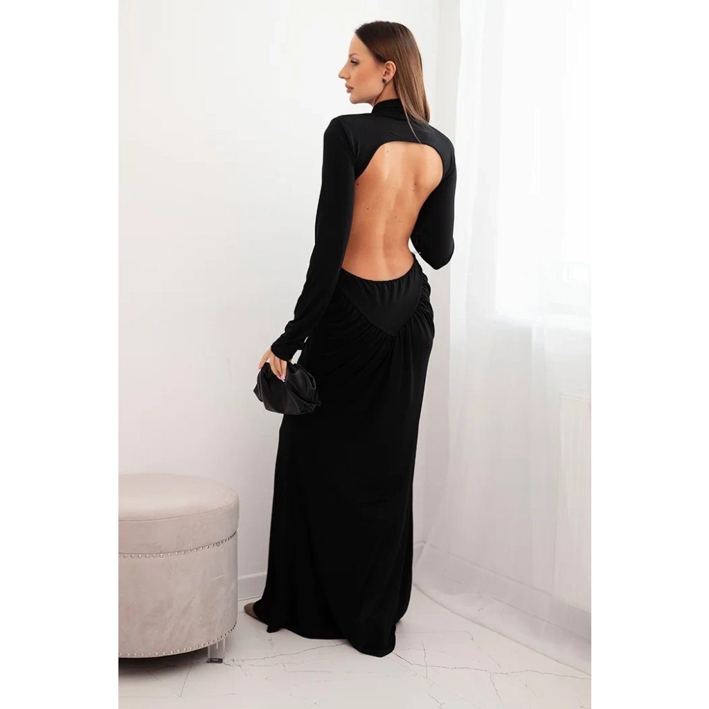 Smyslné dámské maxi šaty s rolákem a odhalenými zády jsou dokonalou volbou na výjimečné příležitosti. Vyrobeny z elastického materiálu s příměsí viskózy, dokonale se přizpůsobují postavě a zdůrazňují ženské tvary. Dlouhý rukáv a klasický přední díl kontrastují s efektním, hluboce vykrojeným zadním dílem, který dodává stylizaci charakter.