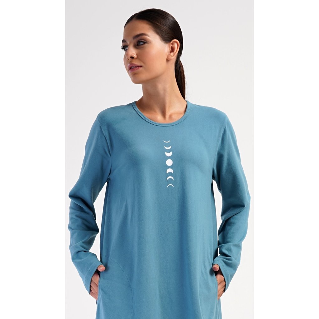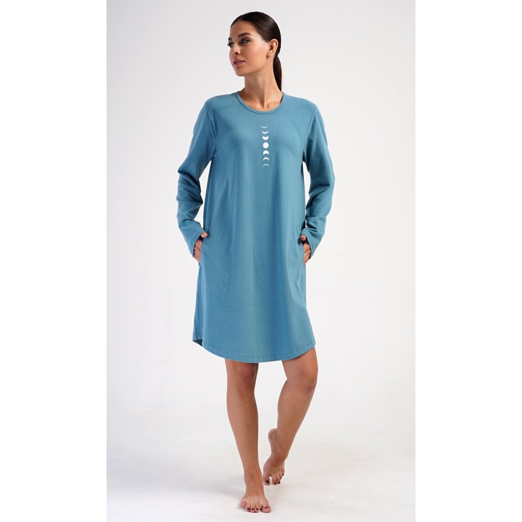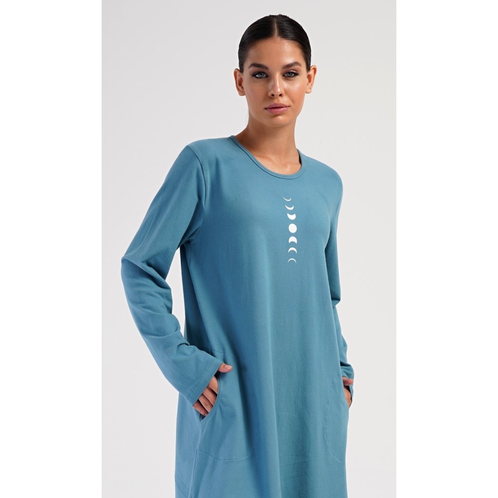 Dámské domácí šaty s dlouhým rukávem Alžběta. Jednobarevné domácí šaty s délkou po kolena, kulatým výstřihem a kapsami zdobí potisk v bílé barvě ve tvaru měsíčních fází. Použitý bavlněný materiál s příměsí elastenu je příjemný a poddajný na dotek.