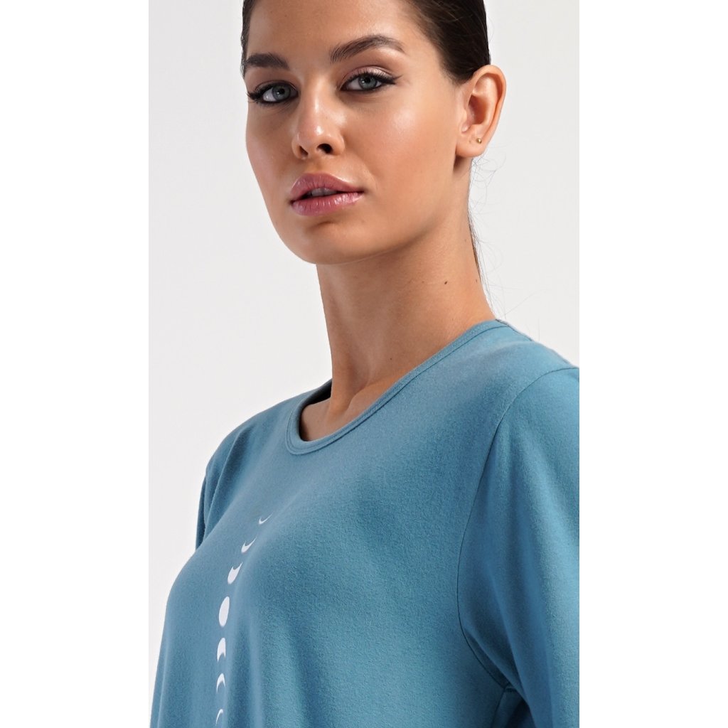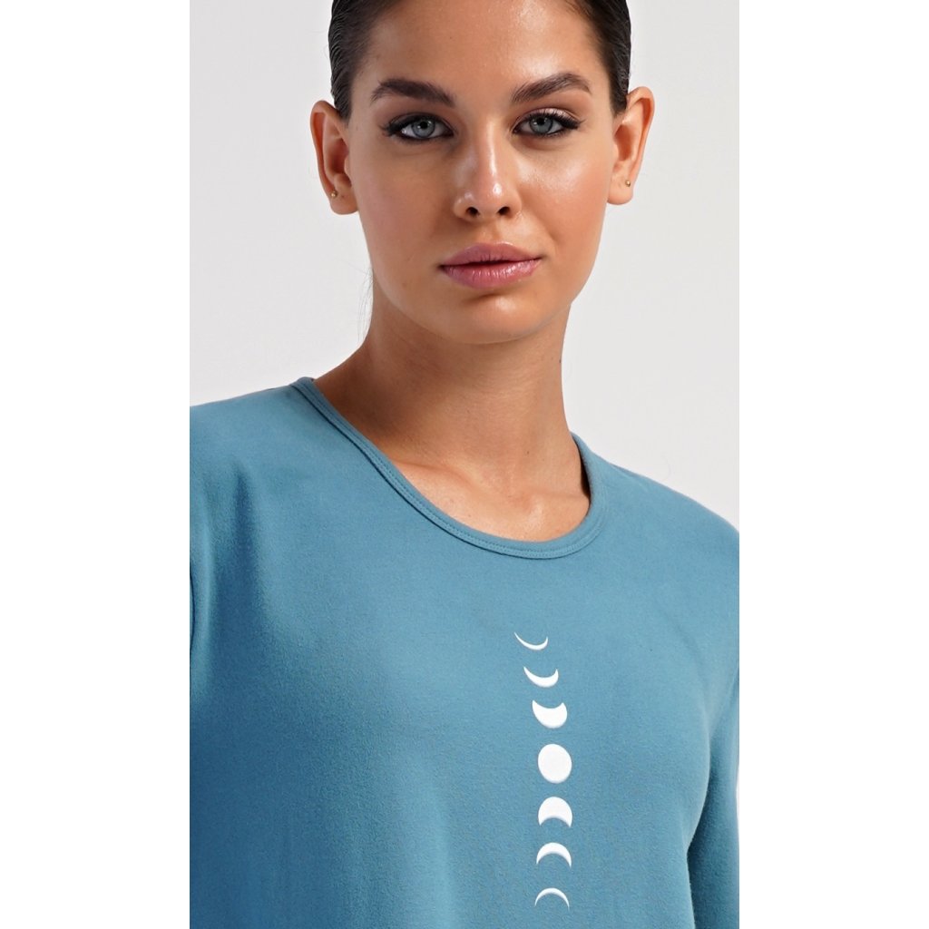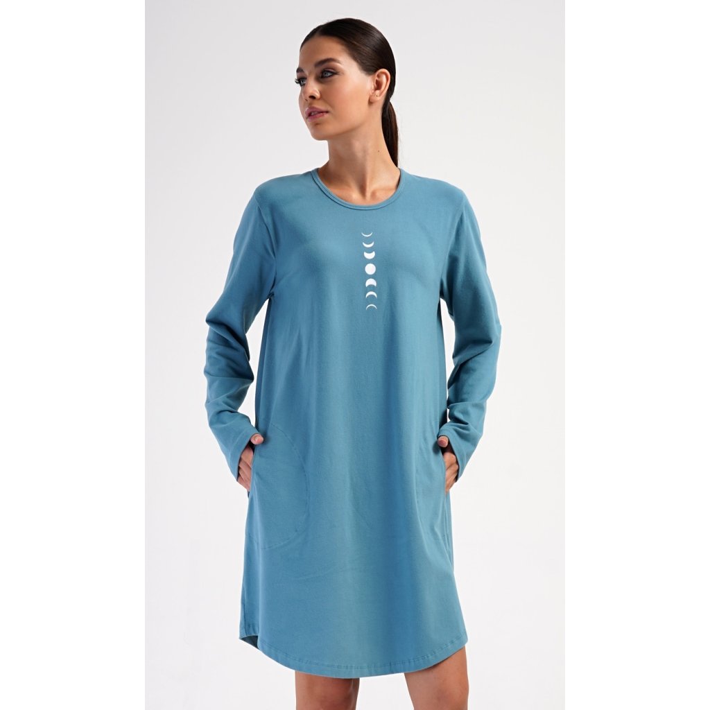 Dámské domácí šaty s dlouhým rukávem Alžběta. Jednobarevné domácí šaty s délkou po kolena, kulatým výstřihem a kapsami zdobí potisk v bílé barvě ve tvaru měsíčních fází. Použitý bavlněný materiál s příměsí elastenu je příjemný a poddajný na dotek.