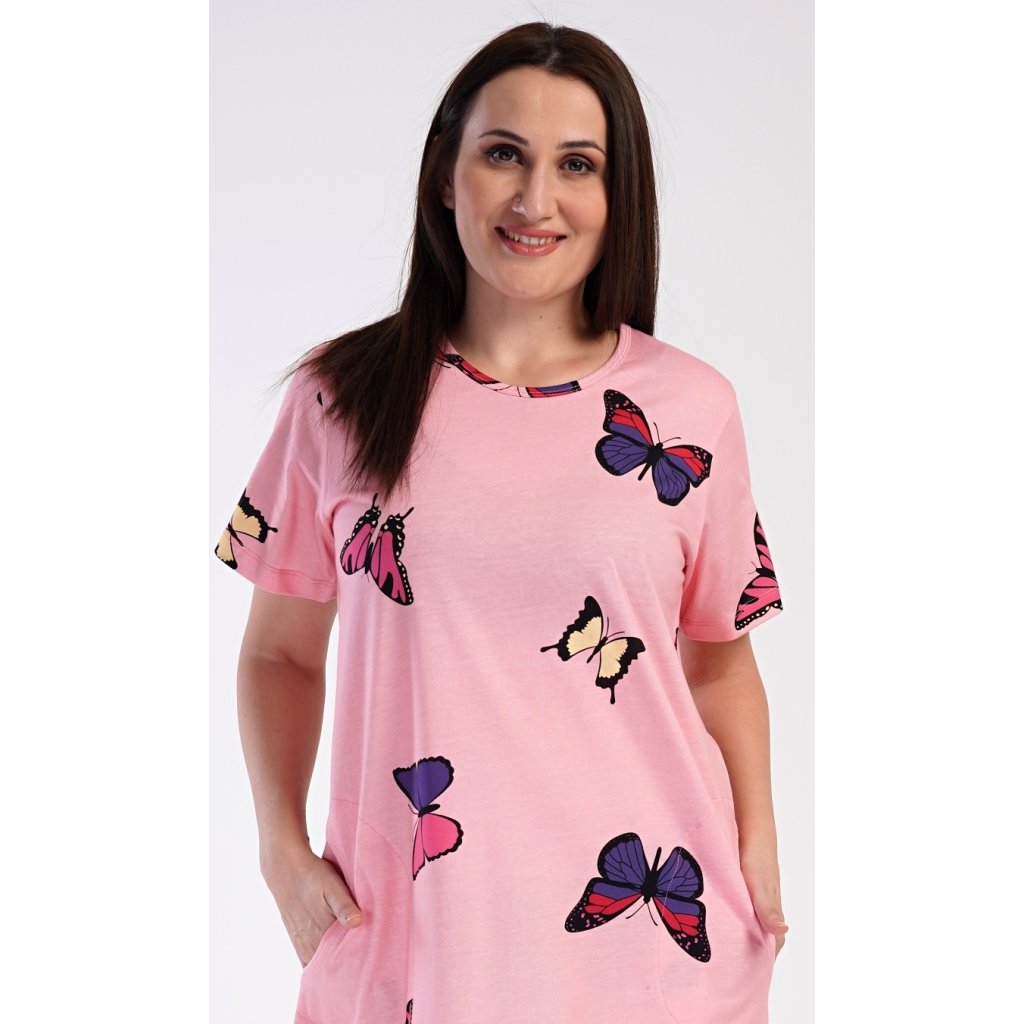 Dámské bavlněné domácí šaty s krátkým rukávem Butterfly. Domácí jednobarevné šaty s kulatým výstřihem a kapsami zdobí pestrobarevní motýli. Použitý bavlněný materiál je příjemný a poddajný na dotek. Šaty jsou pohodlné, využijete je téměř při všech volnočasových aktivitách. Jsou vhodné na spaní i na denní nošení.